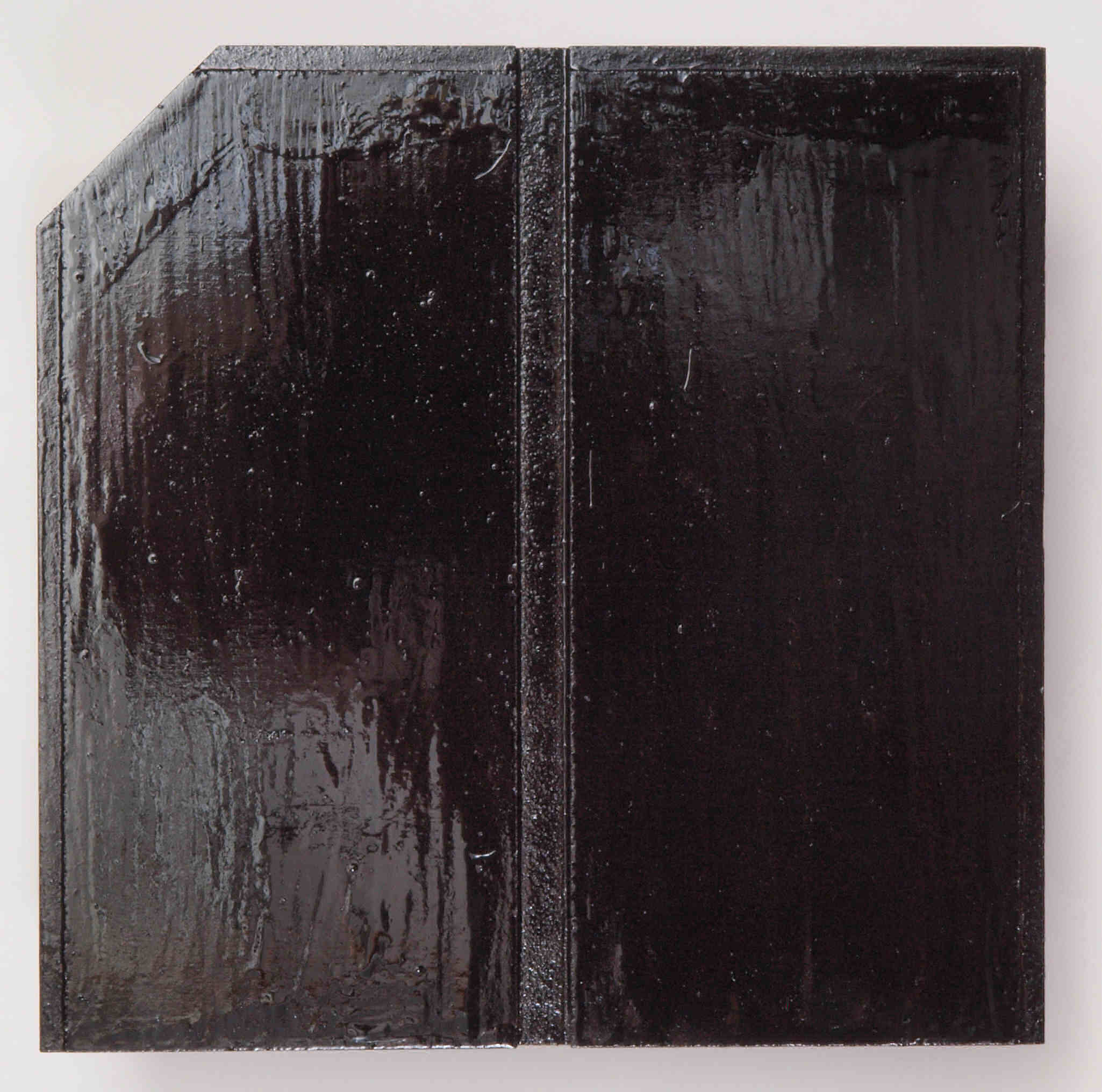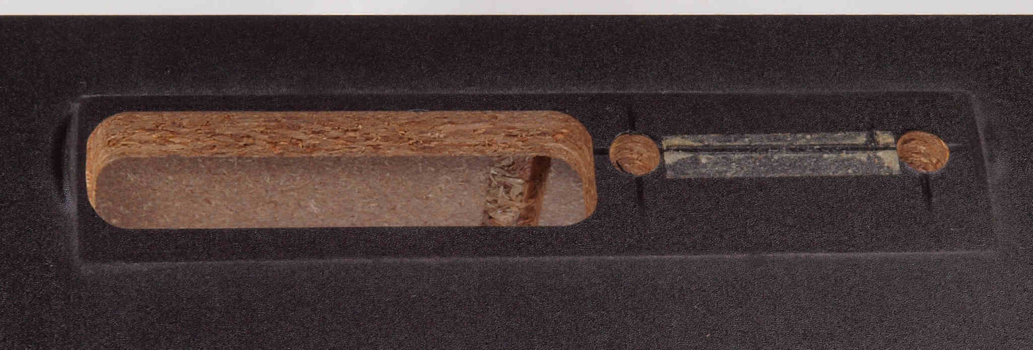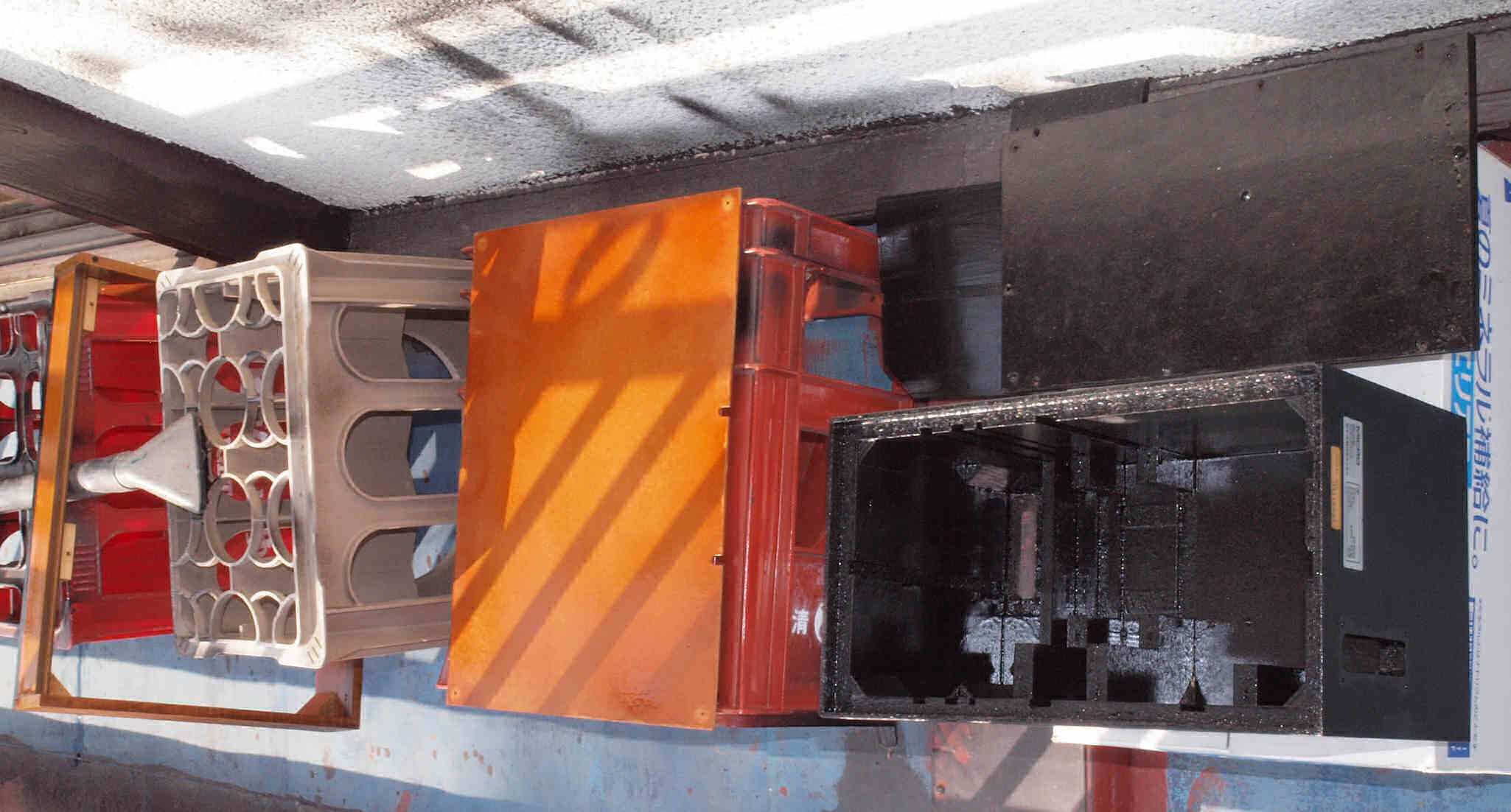 C49. 修理中 接着材が劣化した木箱、下後左から見る。圧縮板にボンドを塗って固めている。
