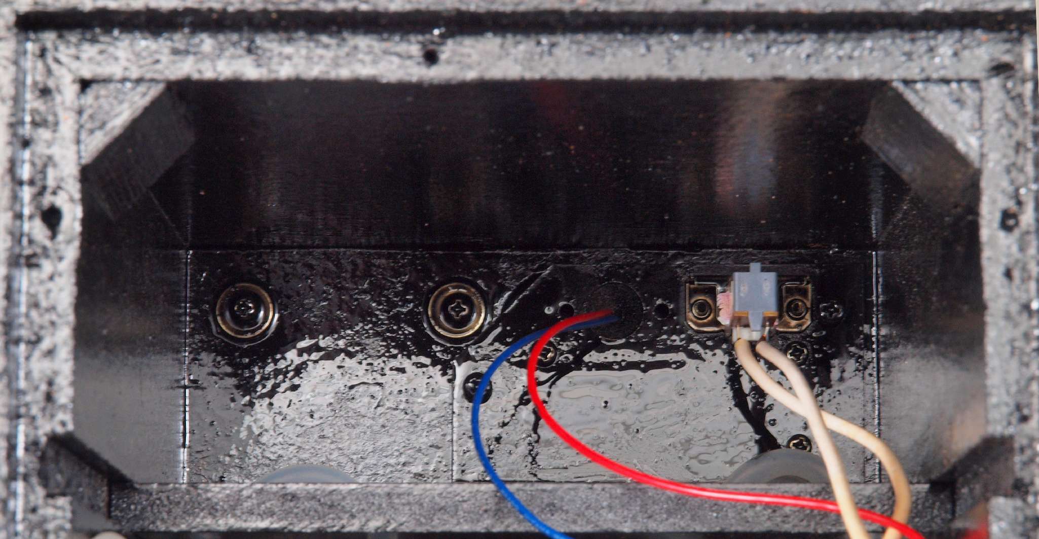 | C42. 修理前 電源入り口・吐出口端子取り付け穴。 ボンドを染みこませる。 |