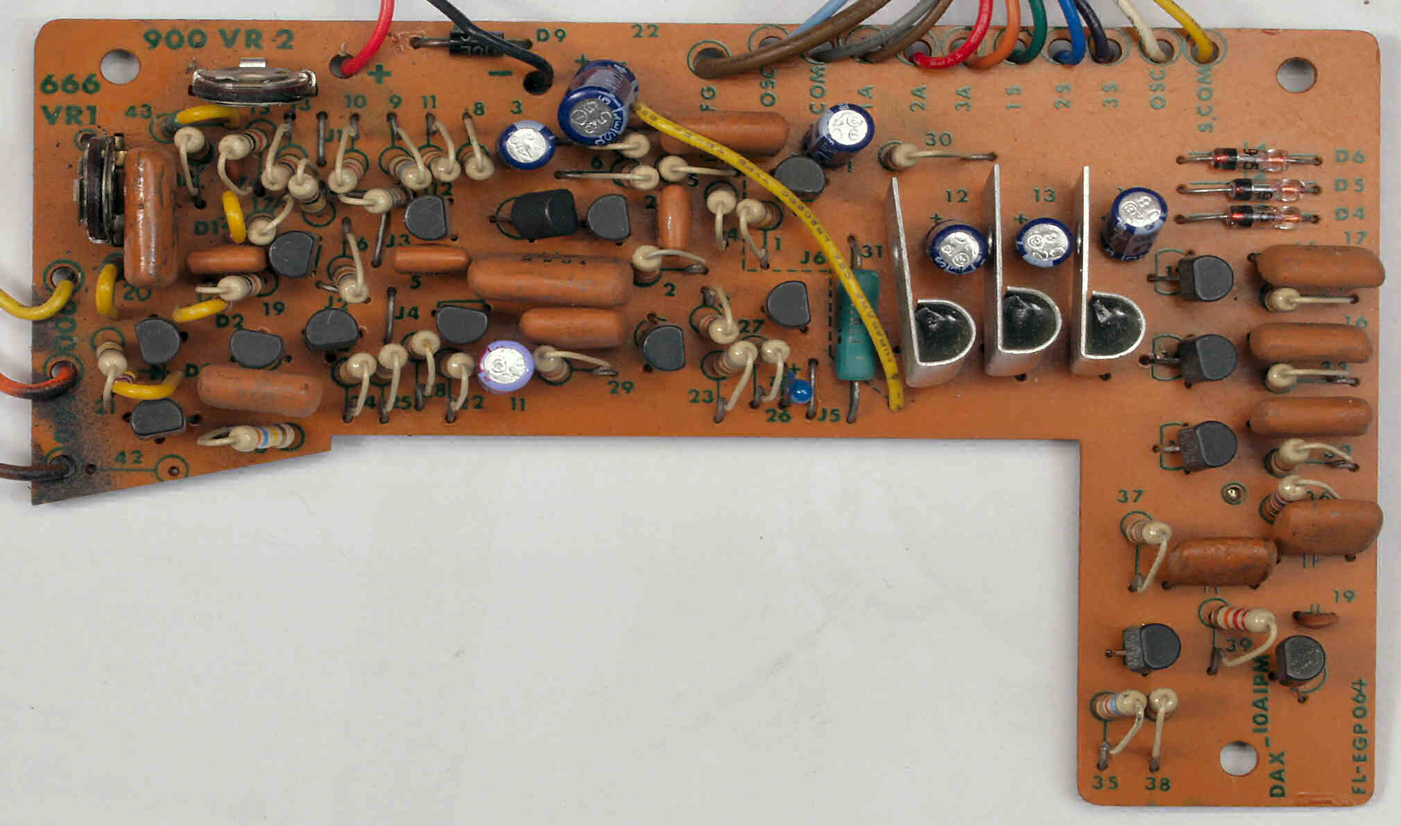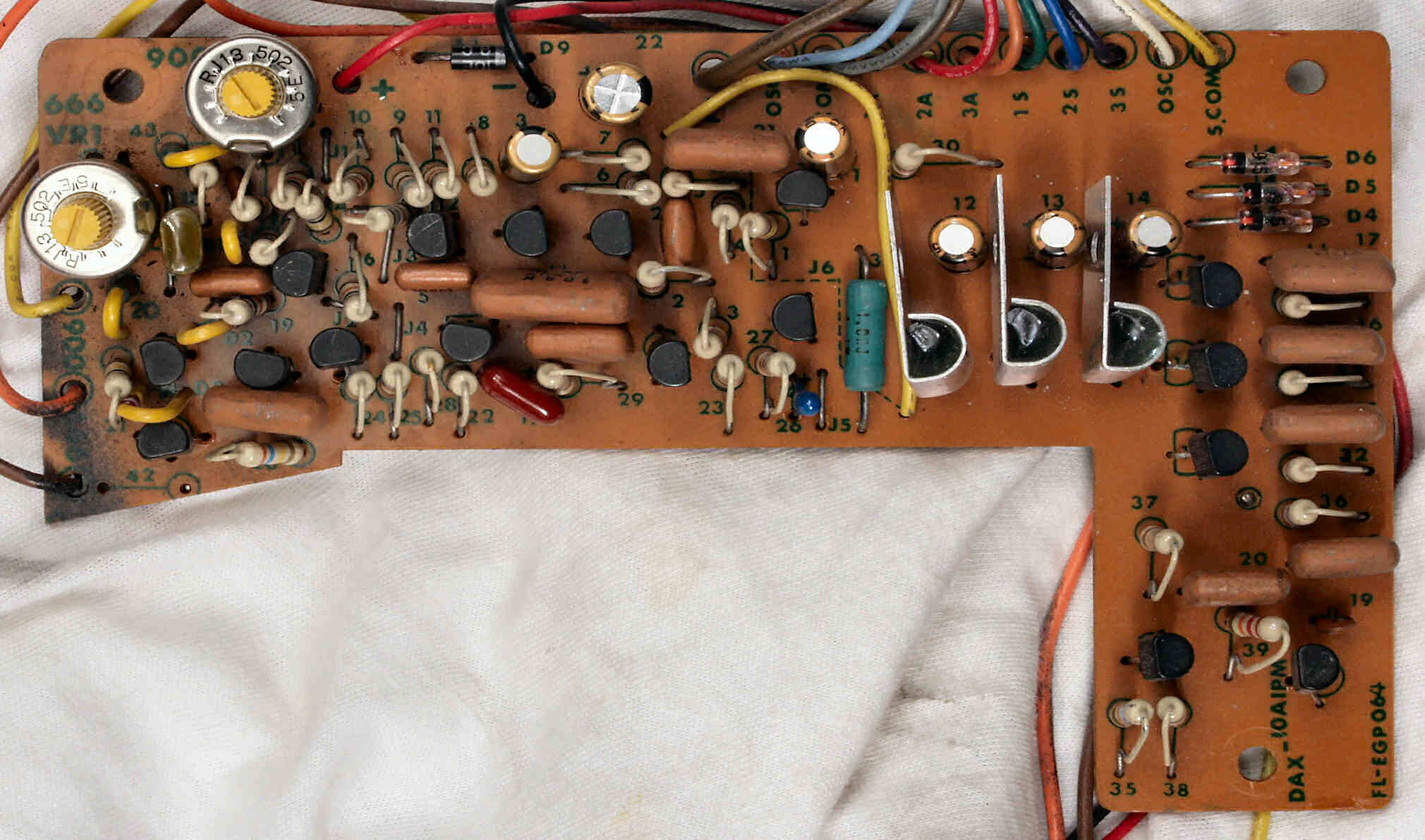 | C2B. 修理後 メイン基板 半固定VR2個、電解コンデンサー6個、フイルムコンデンサー6個交換 |