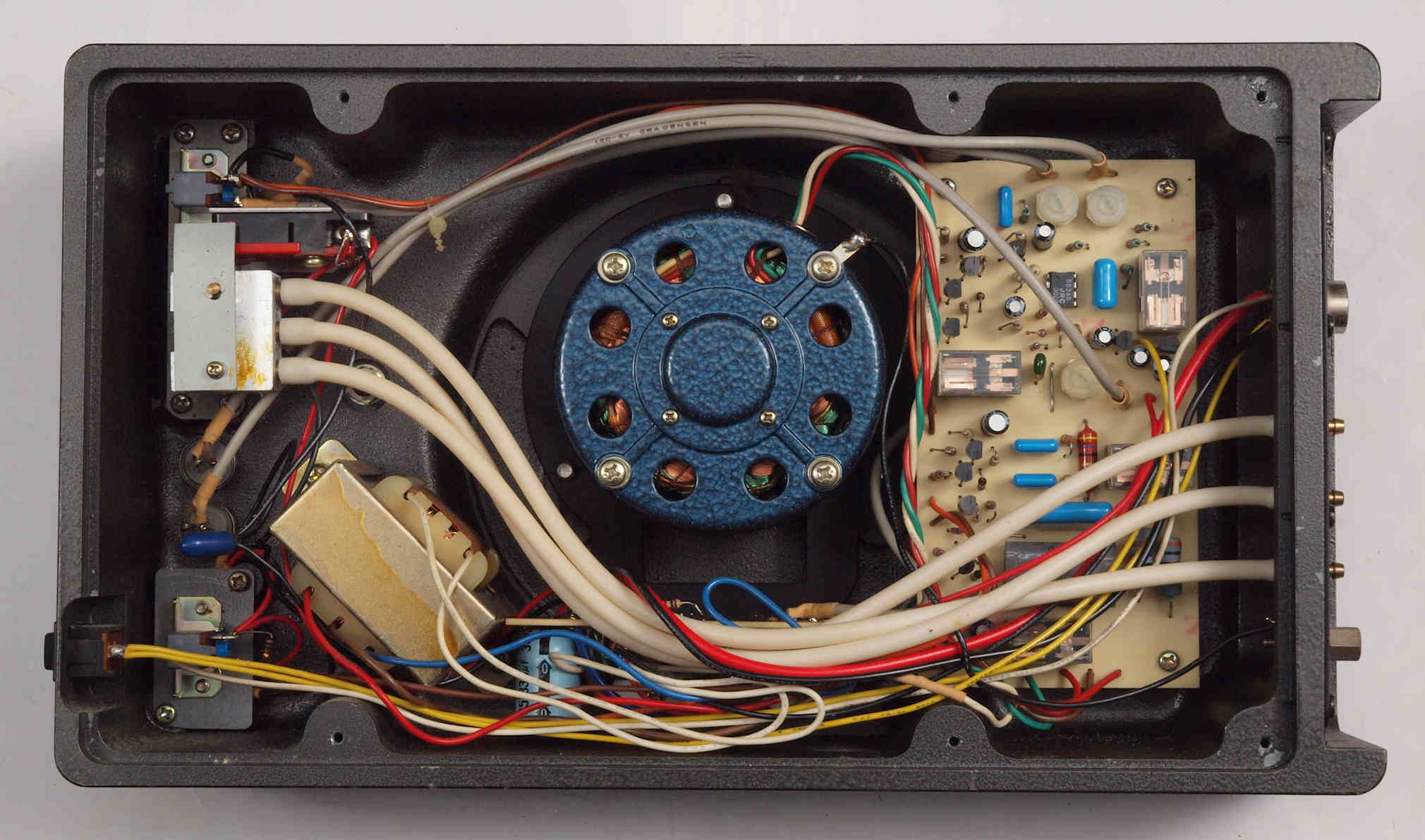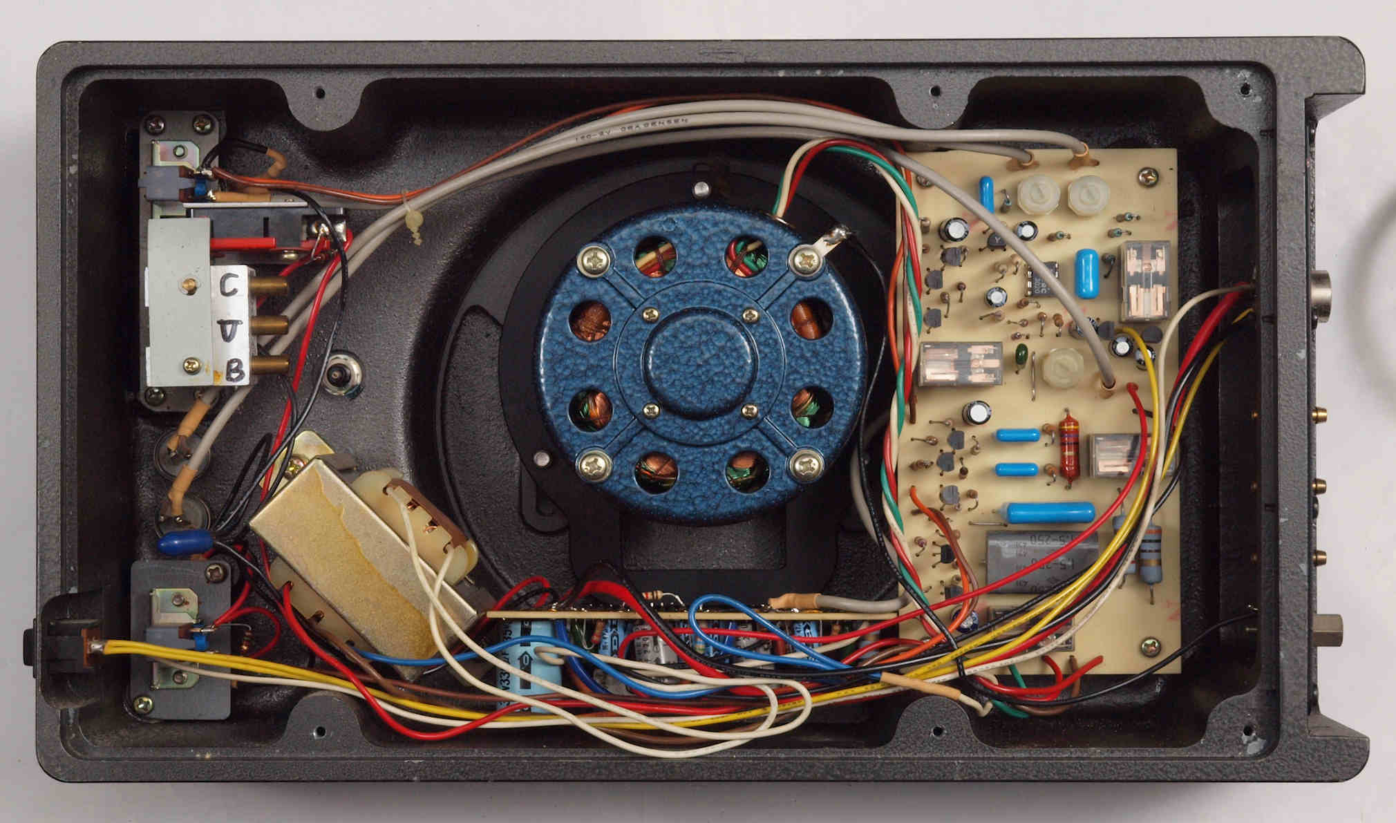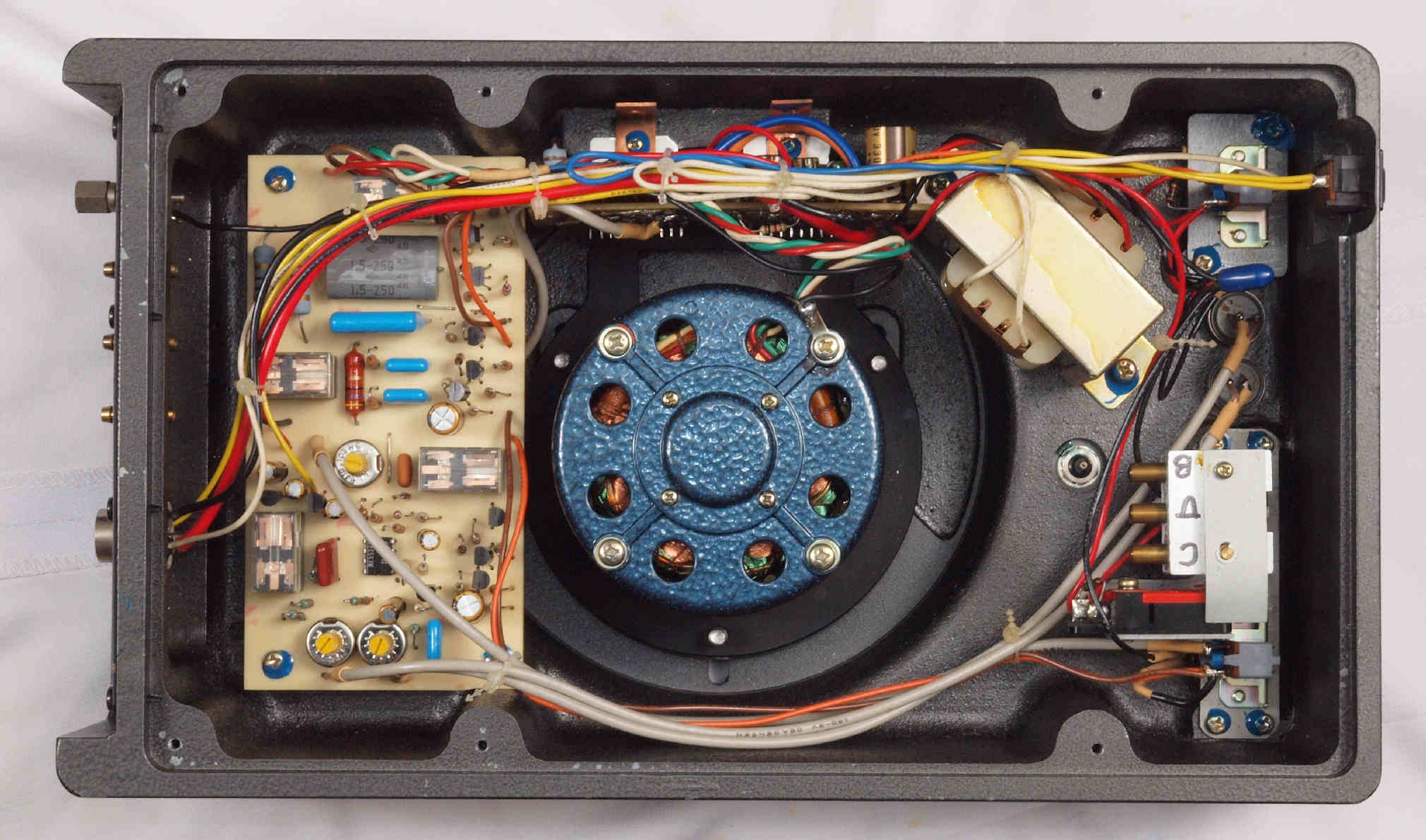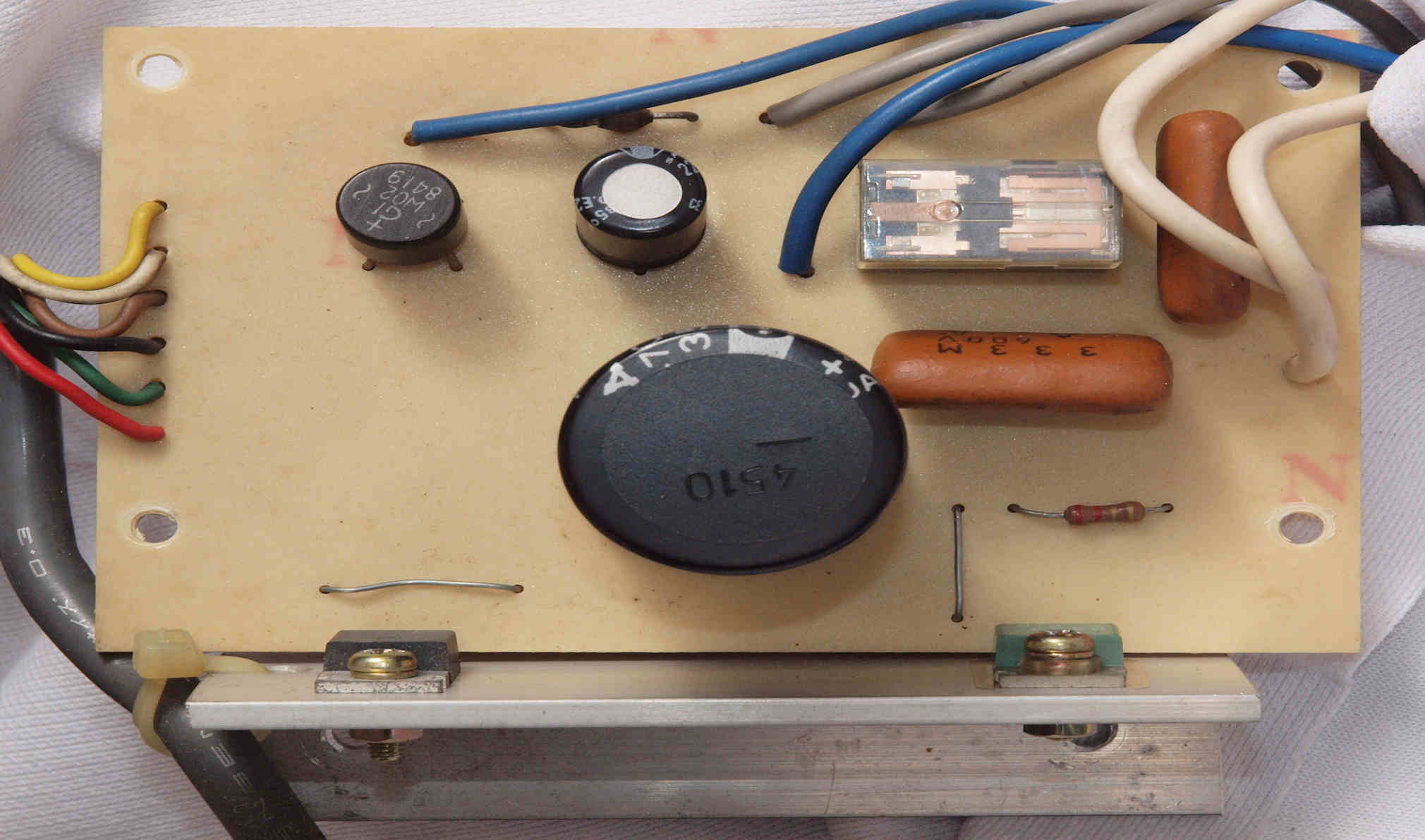 | C82. 修理後 下から見る。ケースが鉄製なので、ICの放熱を助ける為、銅板を取り付け。 |