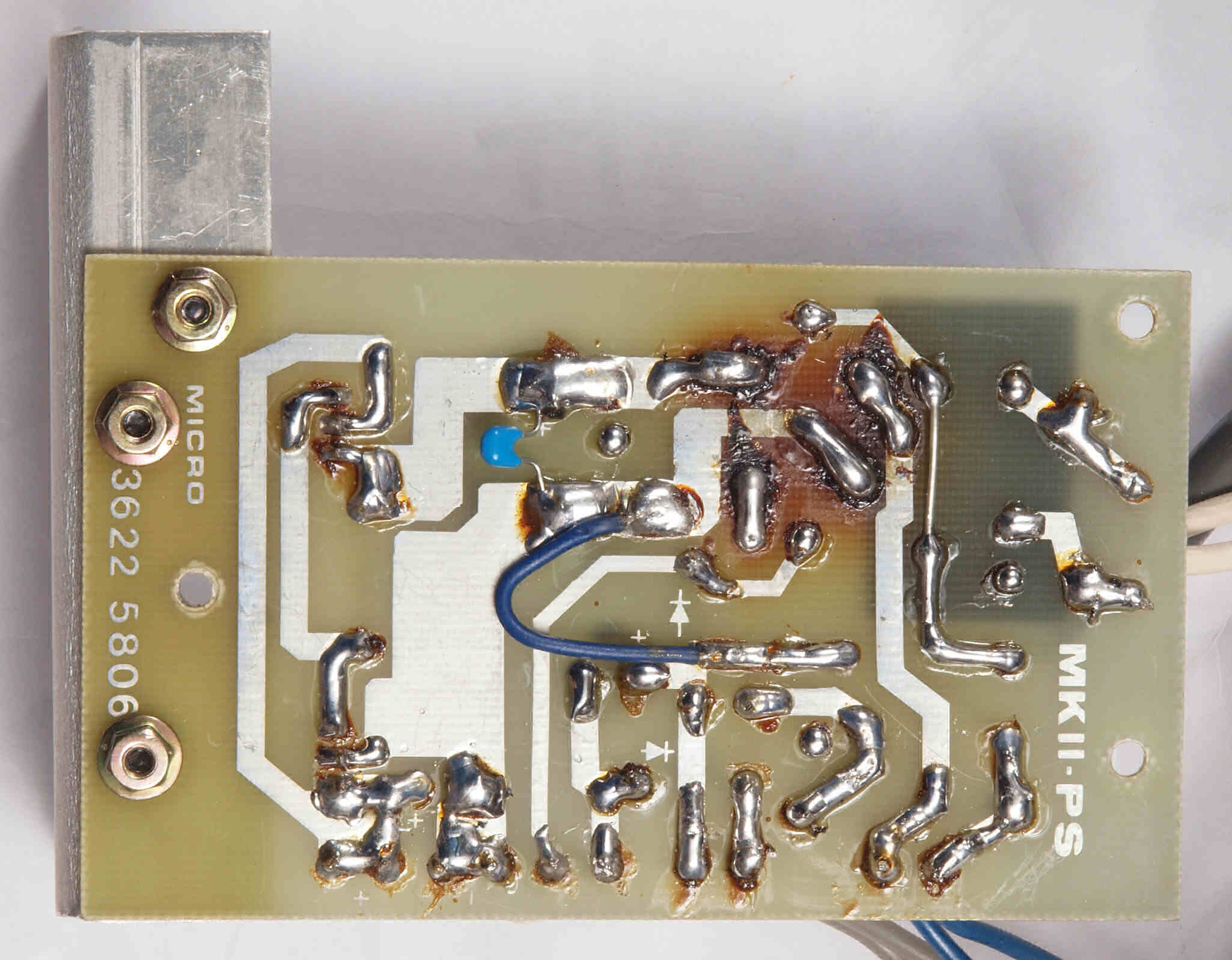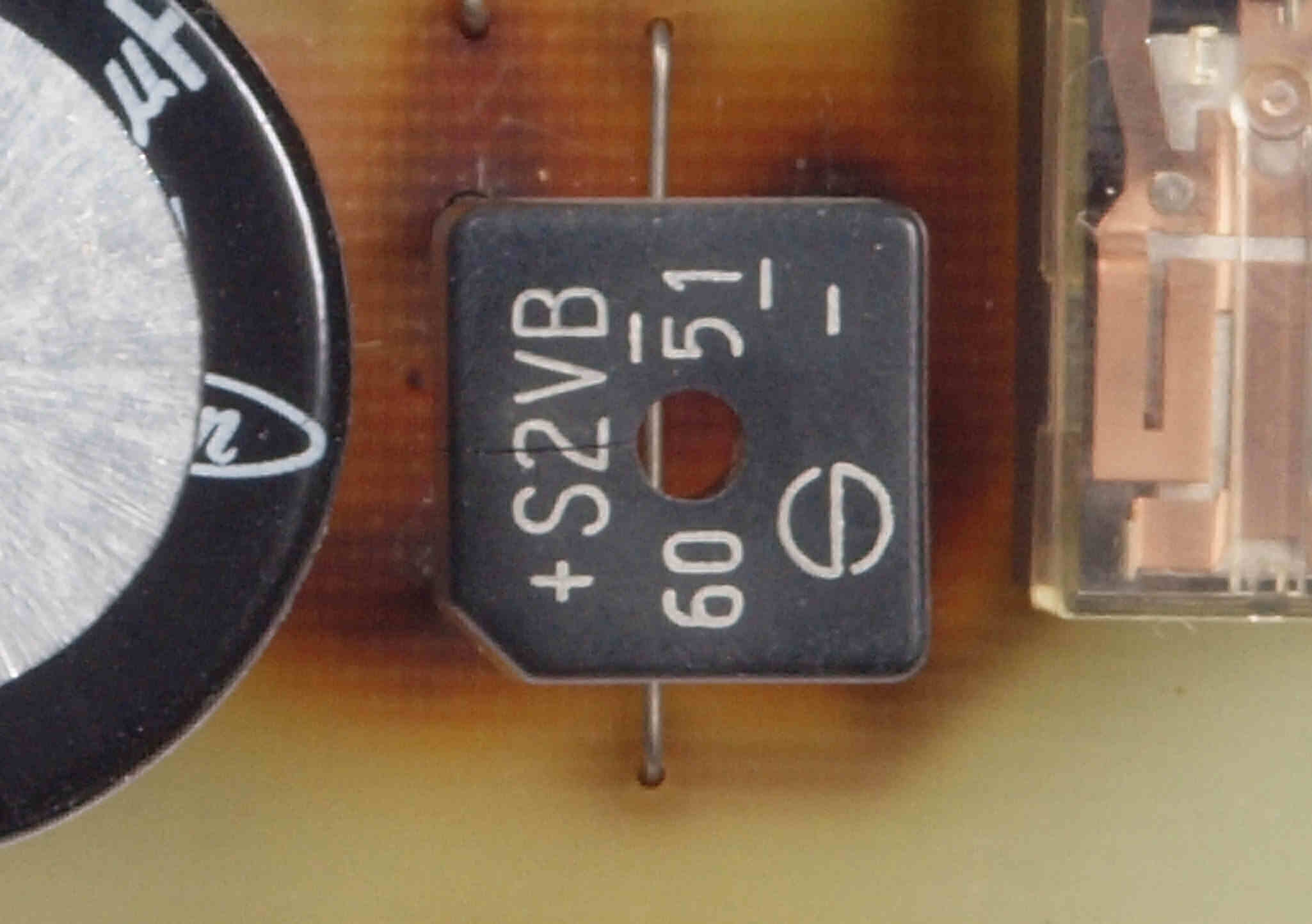 | C112. 修理前 電源部整流基板。 過電流でヒビが入った整流ブリッジダイオード。 | ||||||||||||||||||||||||||||||||||||||||||||||