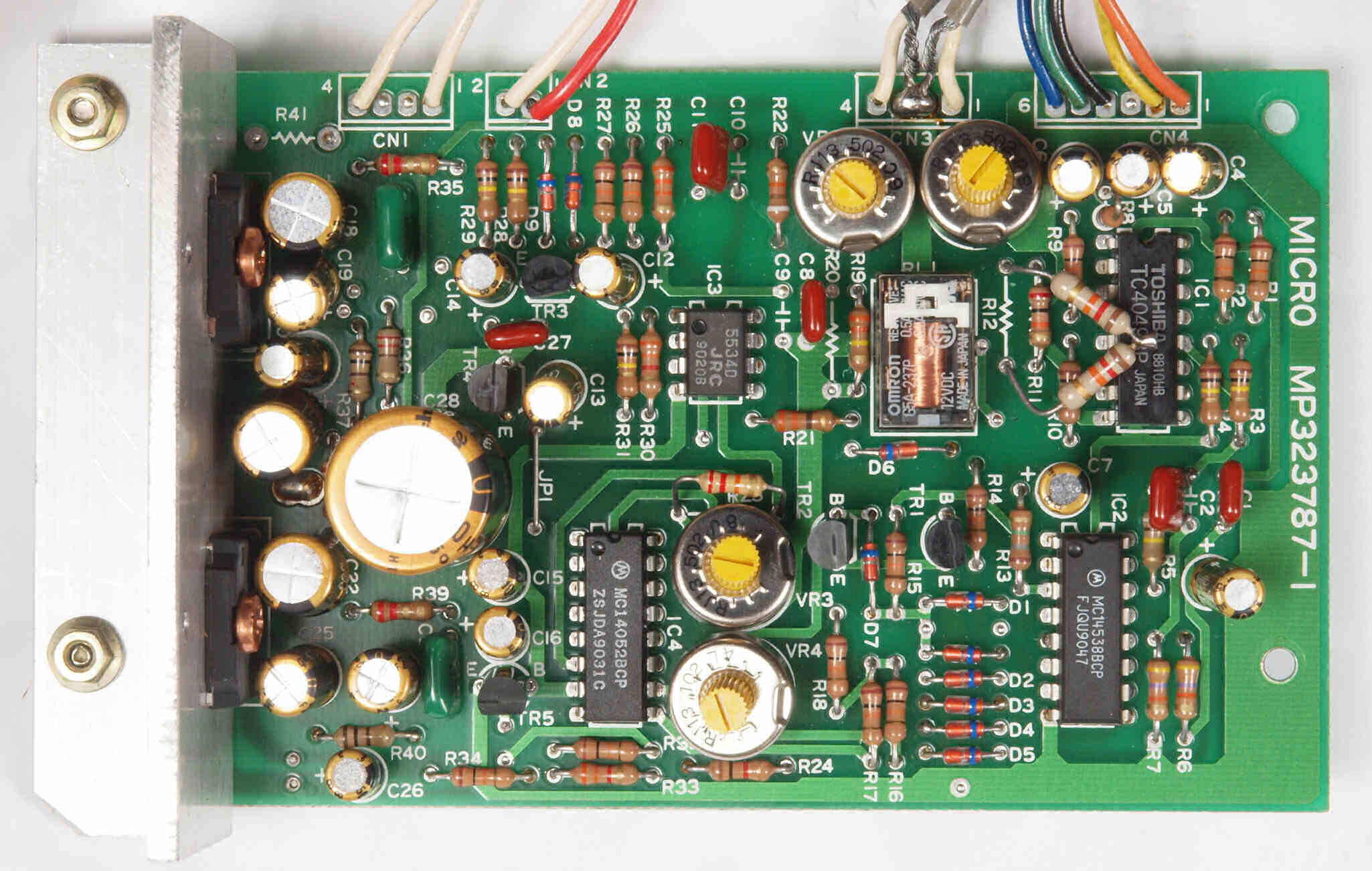 | C22. 修理後 モーターコントロール基板、 半固定VR4個、電解コンデンサー18個、モーター駆動AMP−IC.2個交換 |
