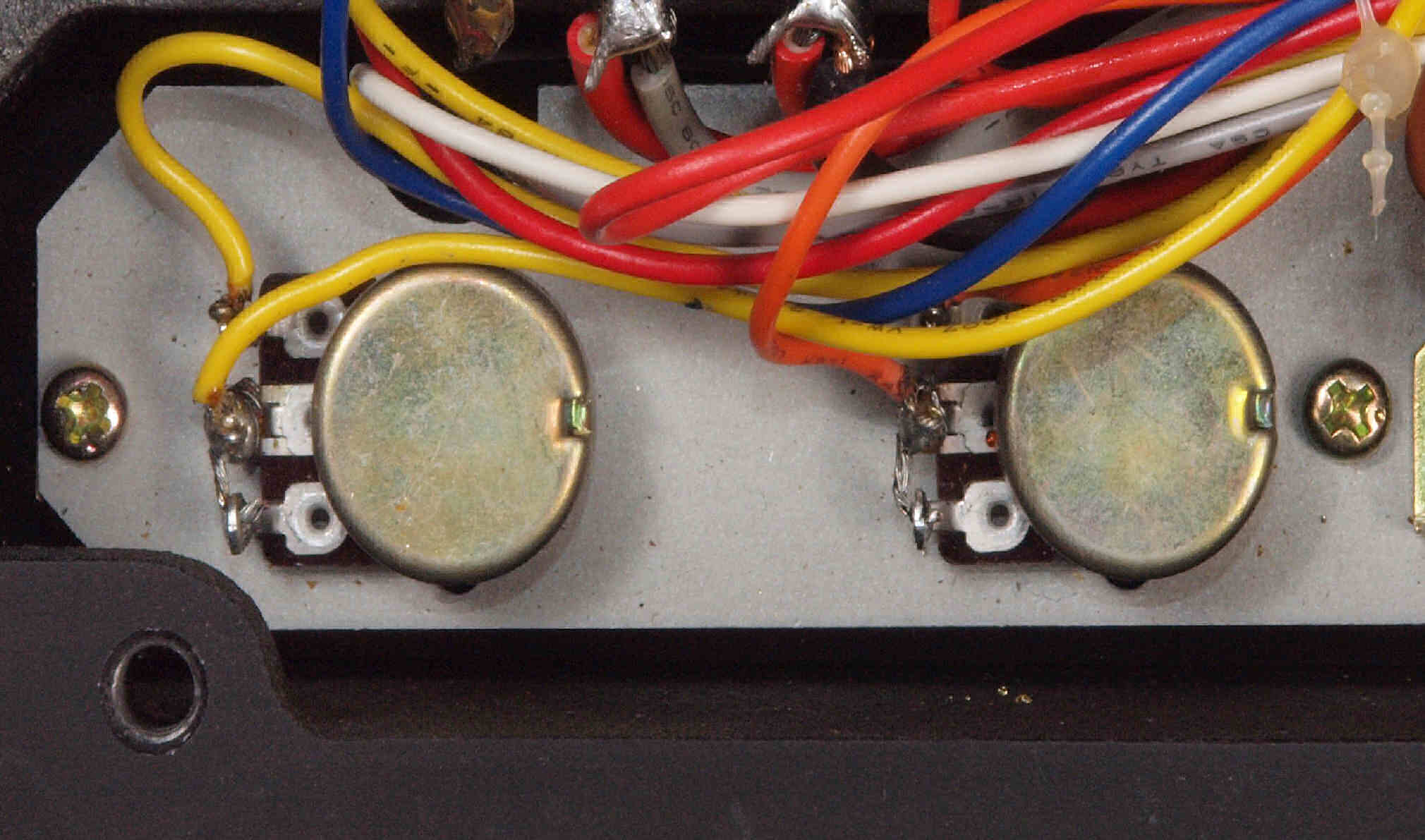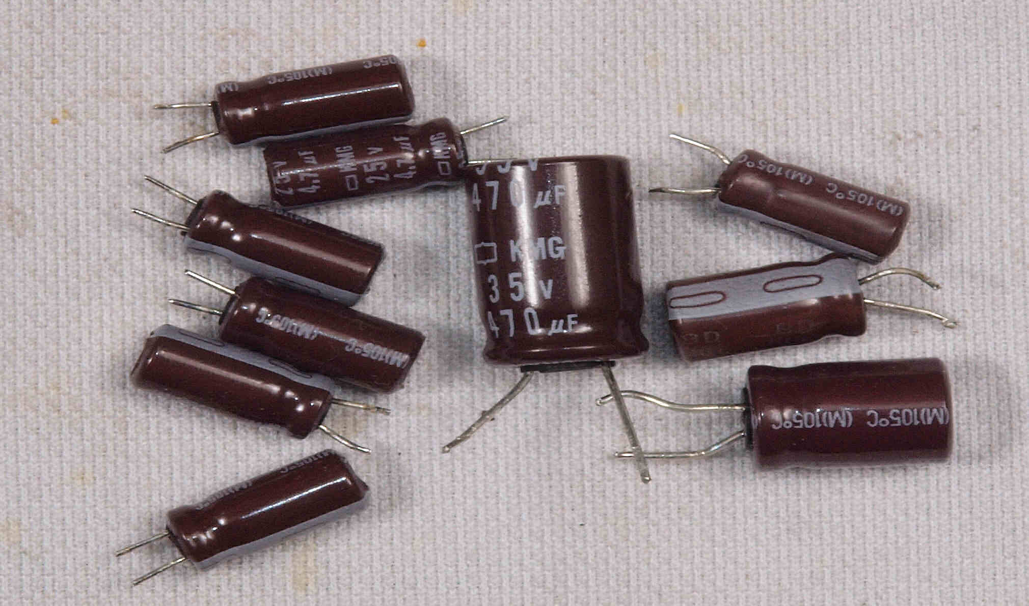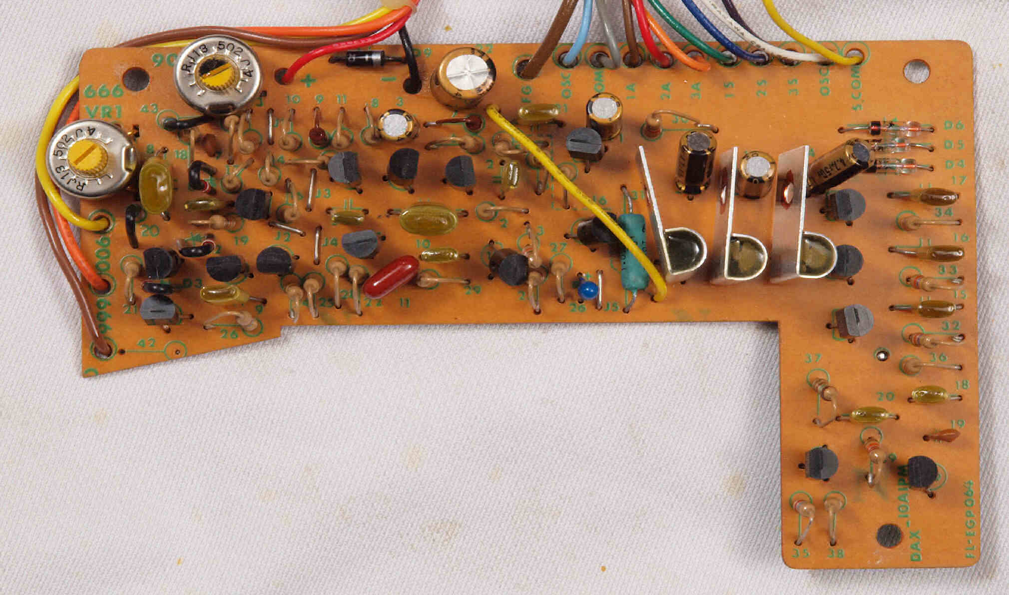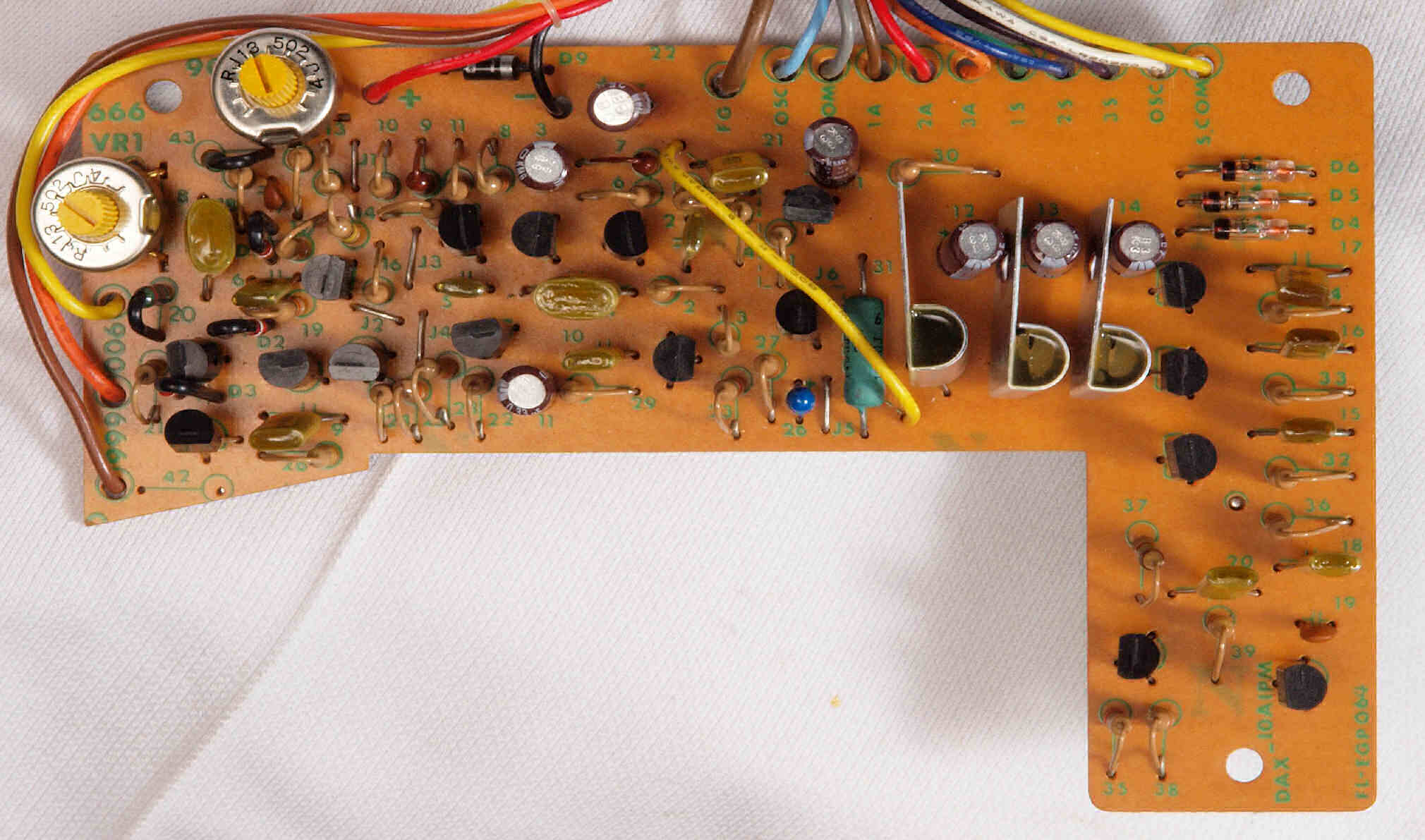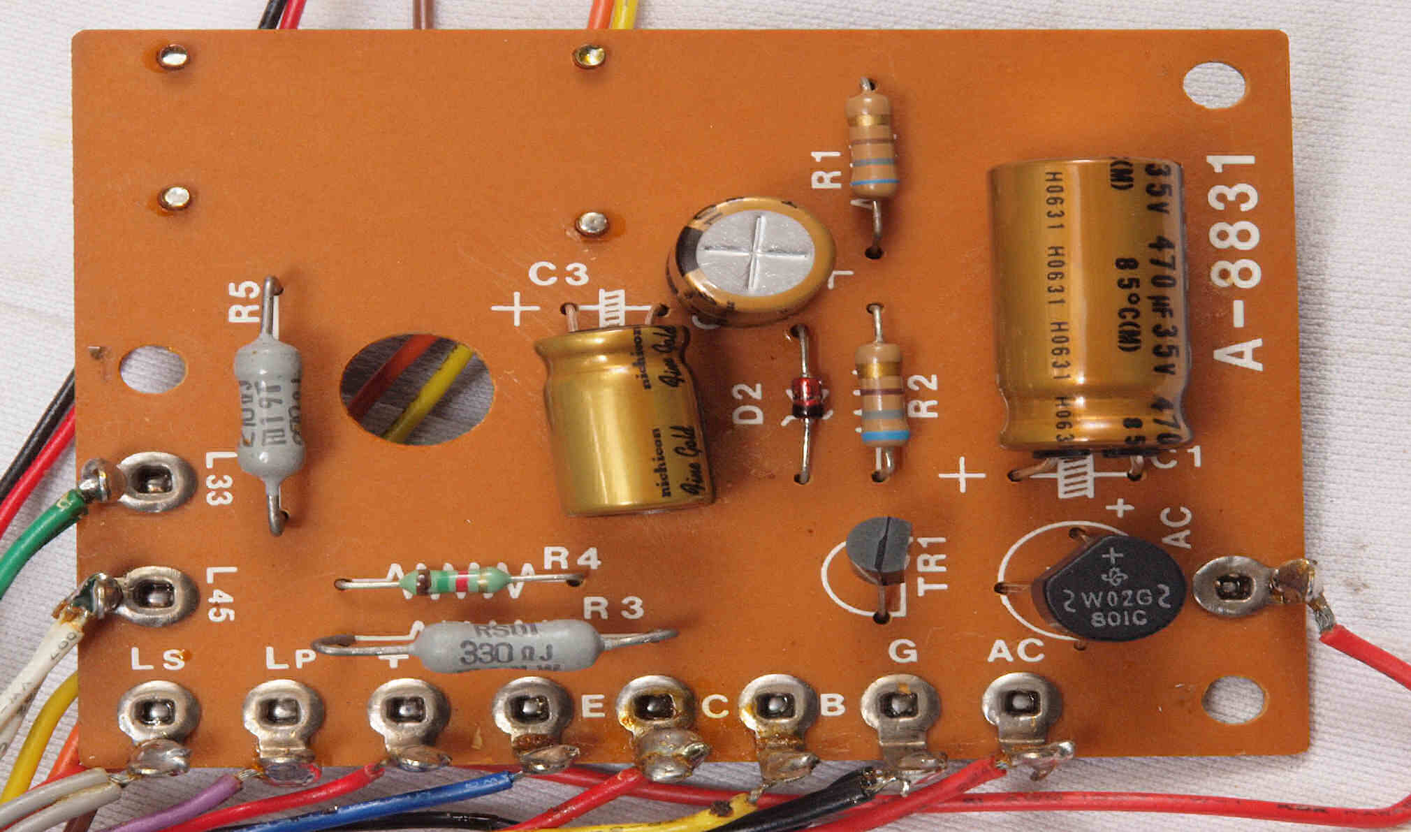 A26. 点検中、下蓋を取り、下から見る。 電解コンデンサー、フイルムコンデンサーが交換してある。