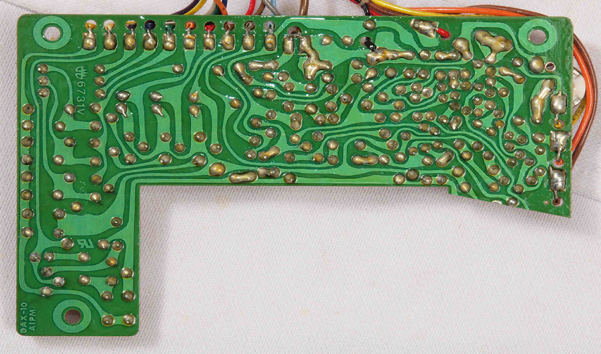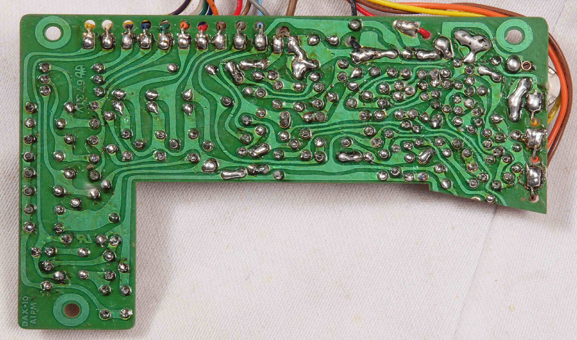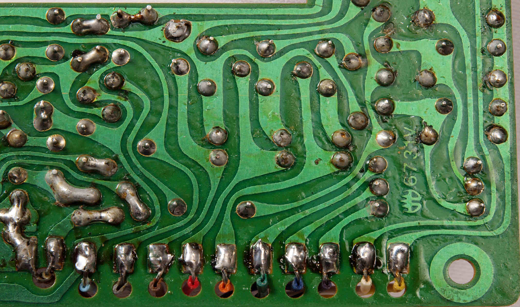 A31. 点検中、メイン基板裏の半田。 くすんでいる? 下の引き出し線半田と比較。 無鉛半田使用?