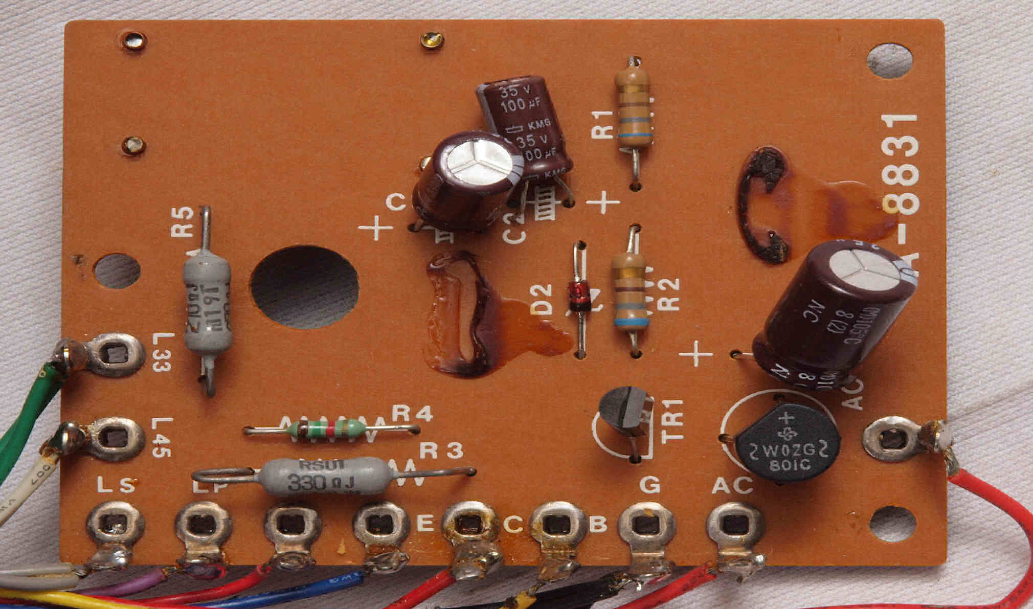 C112. 修理前 電源・LED表示基板。 古い接着材が取り除いていない。