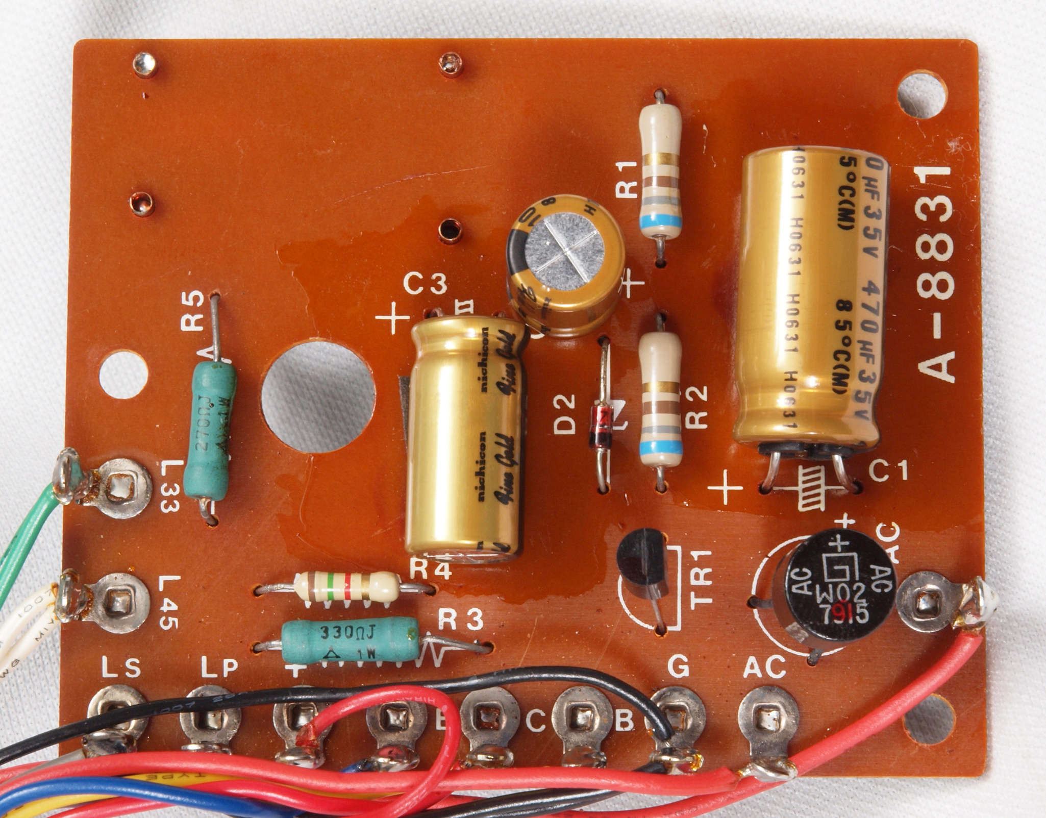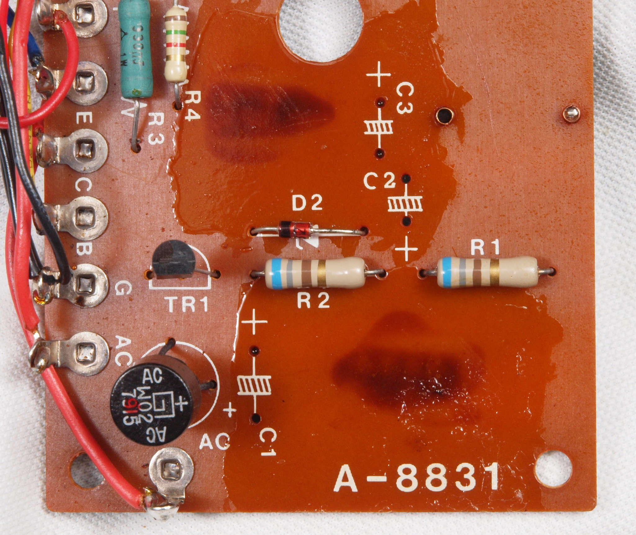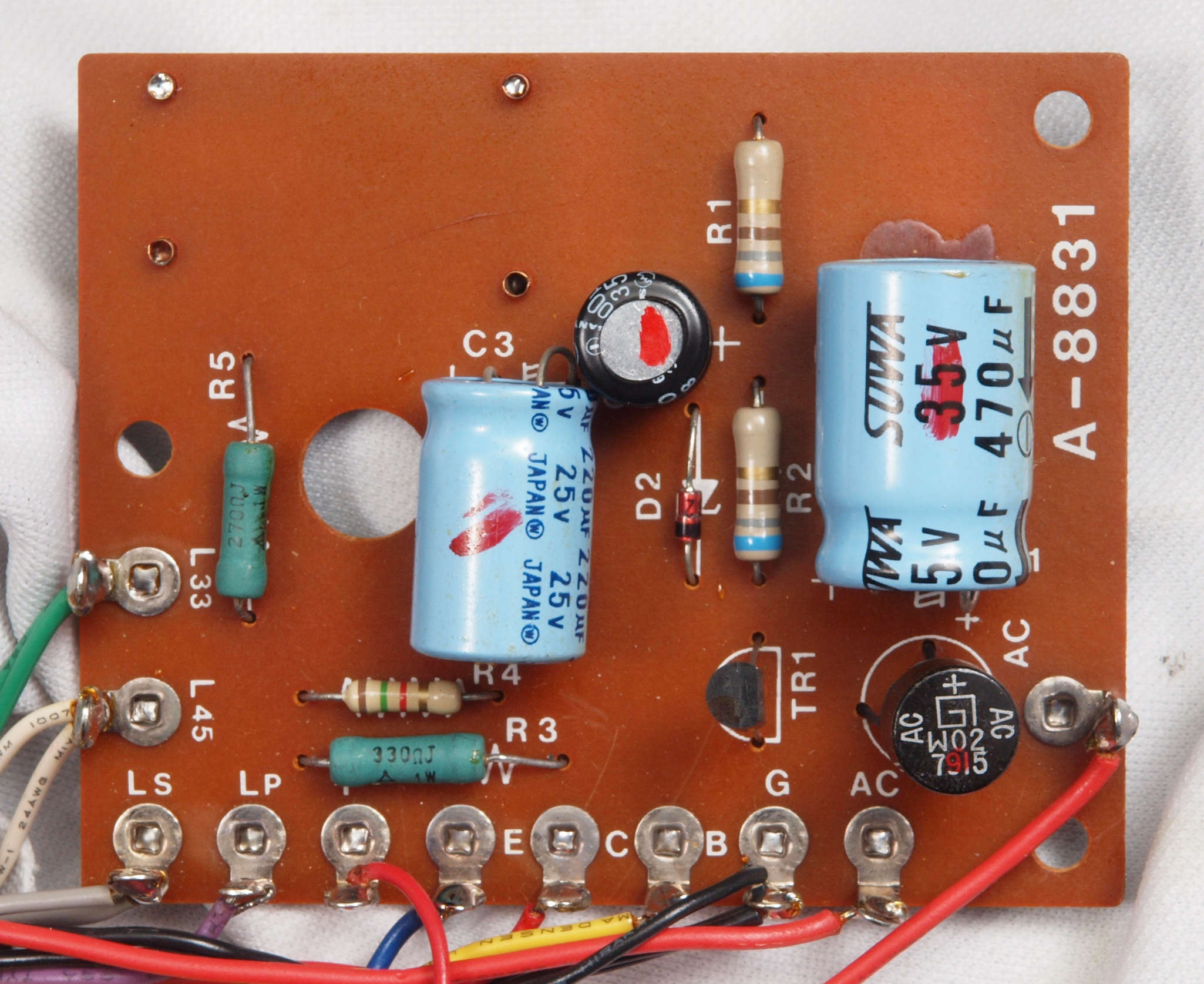 C112. 修理前 電源・LED表示基板。 電解コンデンサー固定するトルエン溶媒の接着剤。