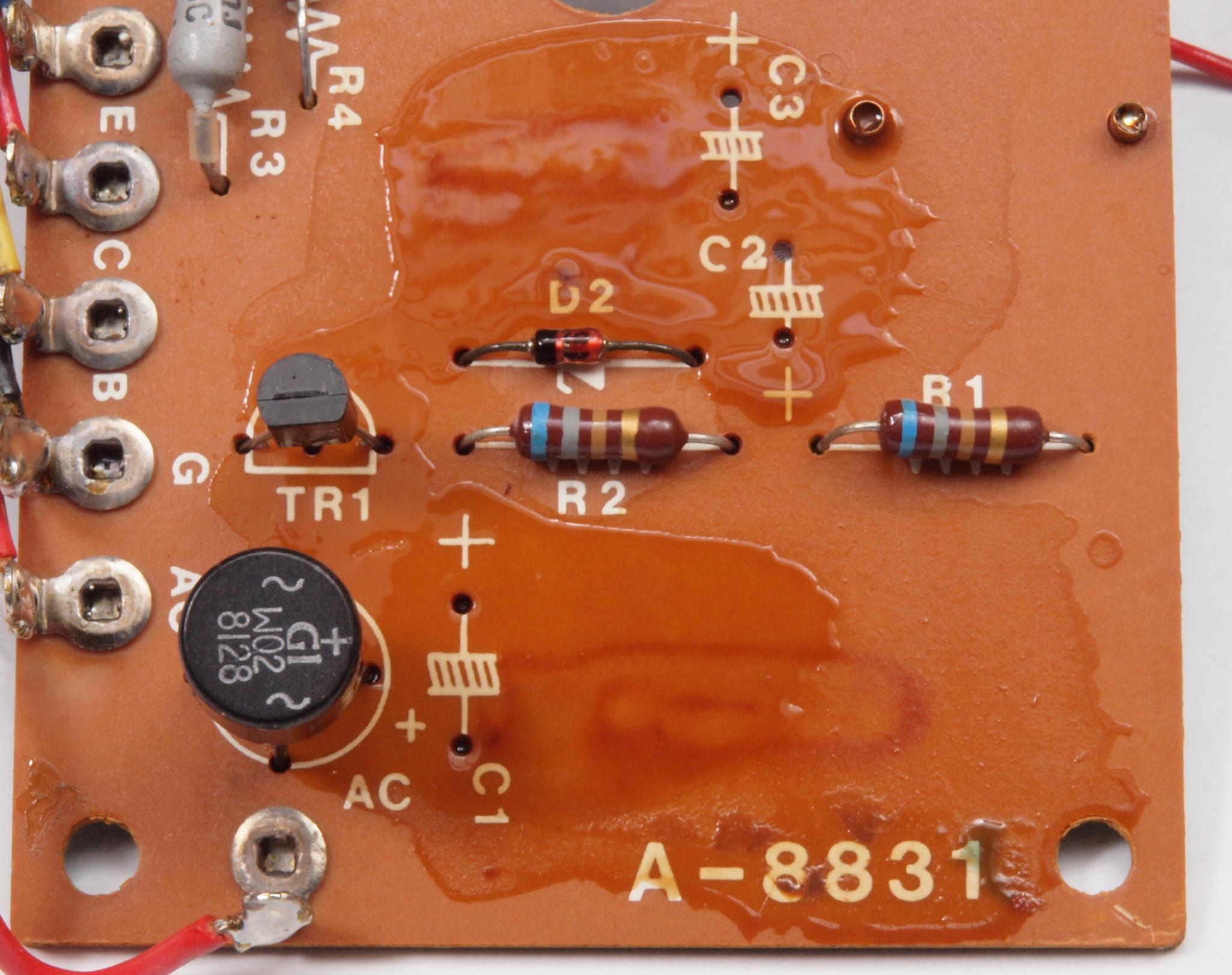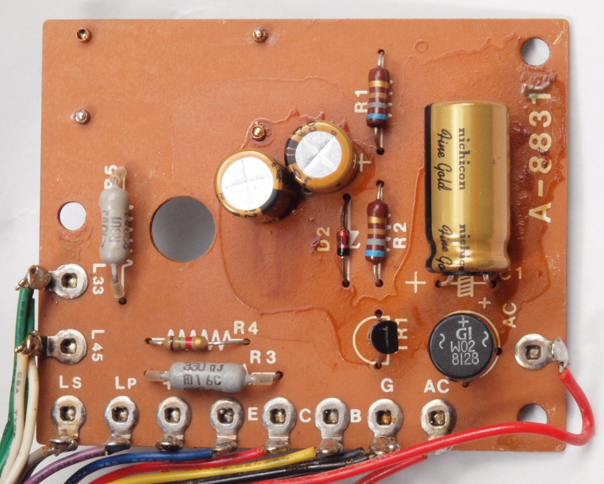 | C12. 修理前 電源・LED表示基板。 電解コンデンサー固定するトルエン溶媒の接着剤。 | ||||||||||||||||||||||||||||||||||||||||