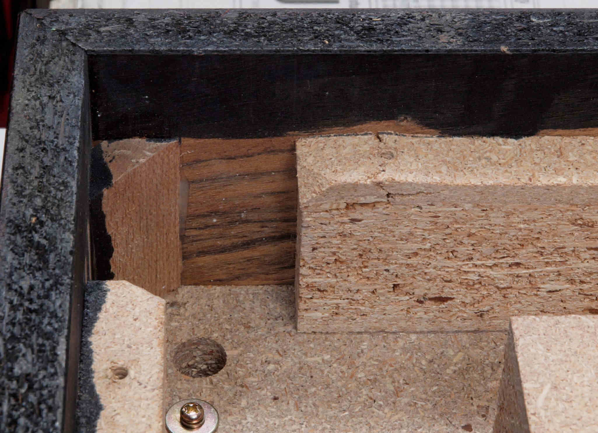 A44. 点検中 圧縮材の接着材が劣化し、ヒビ割れたビス受け部、拡大。