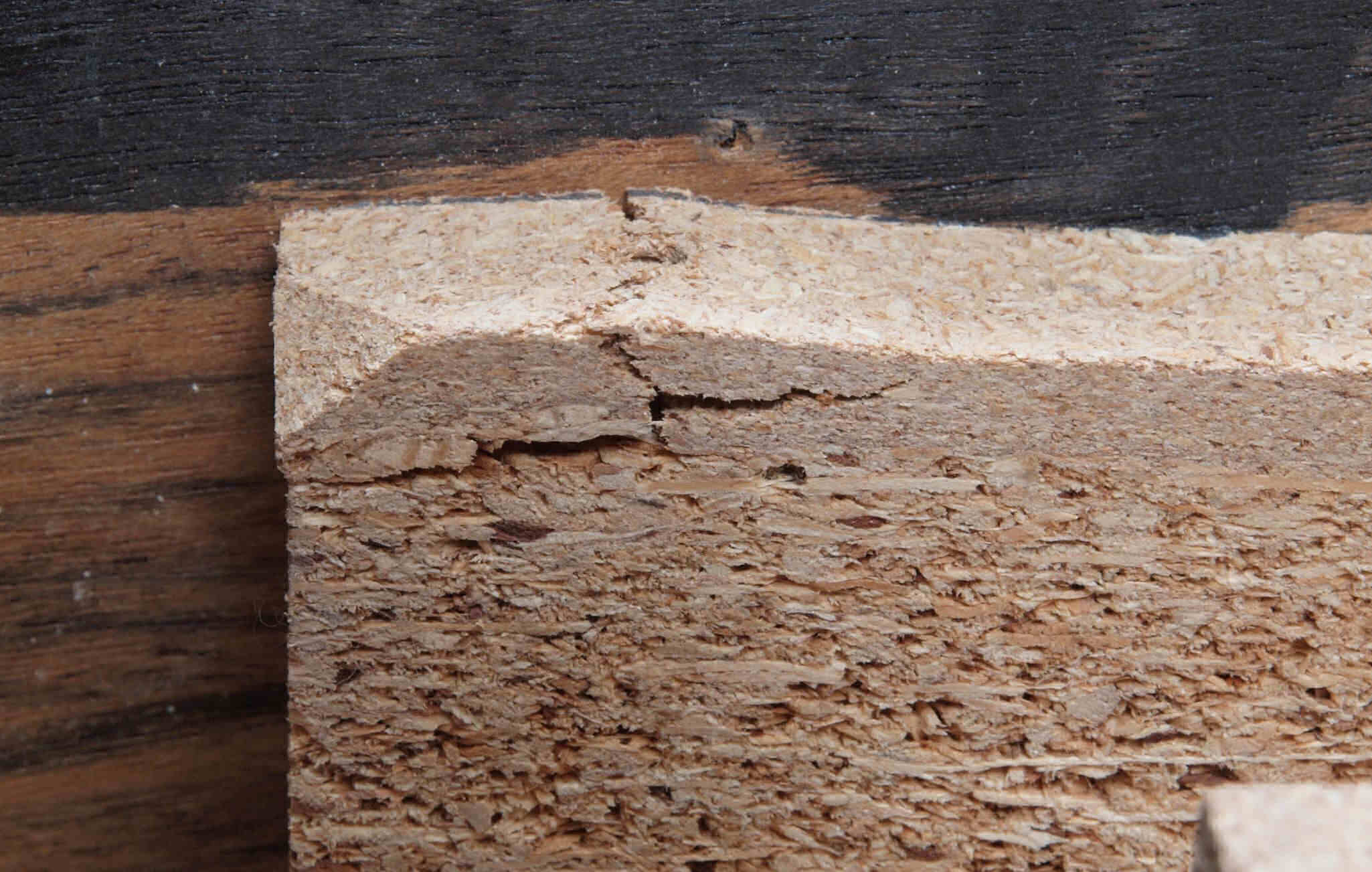 A43. 点検中 圧縮材の接着材が劣化し、ヒビ割れたビス受け部。