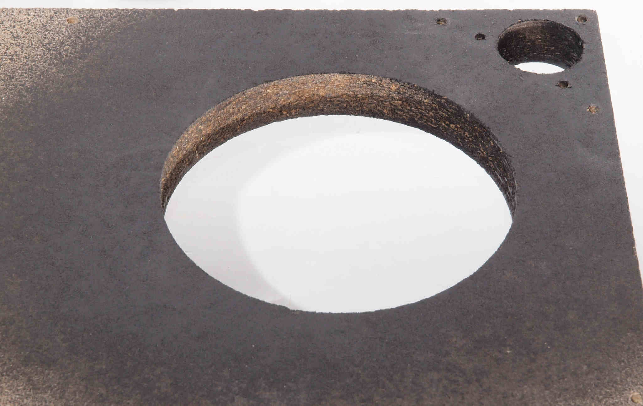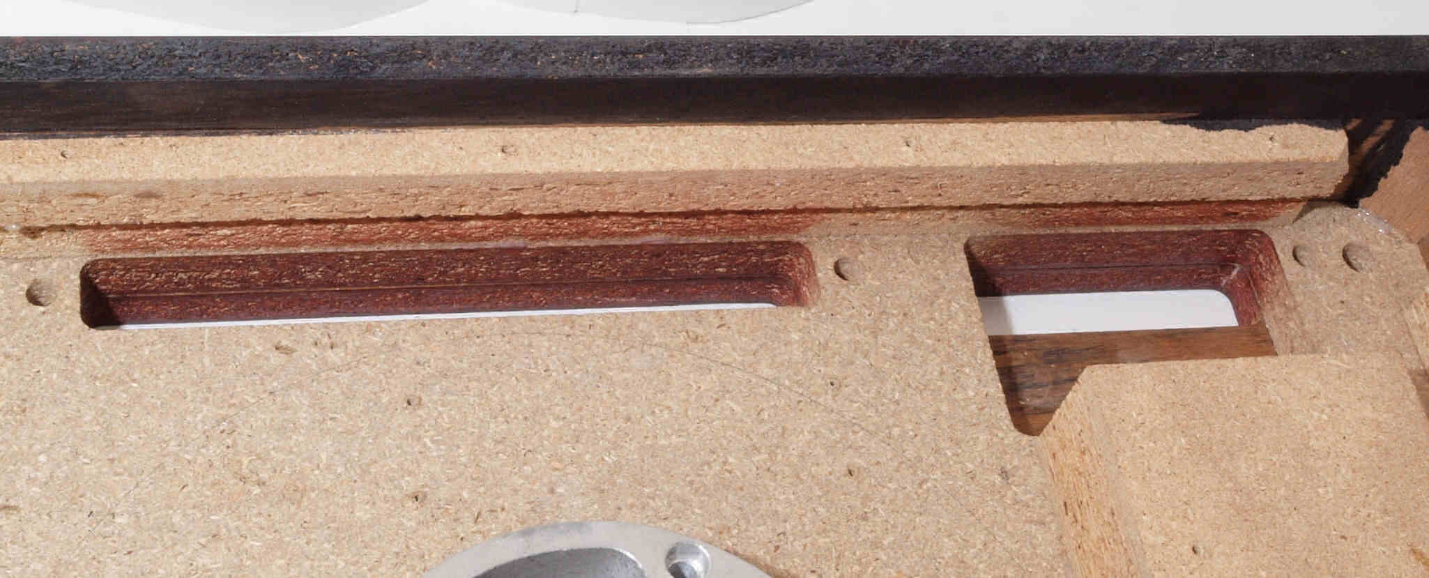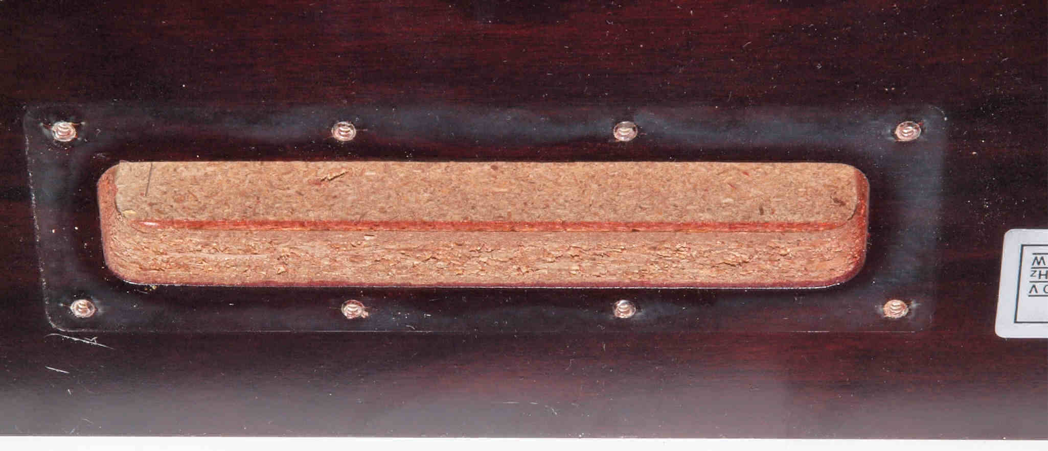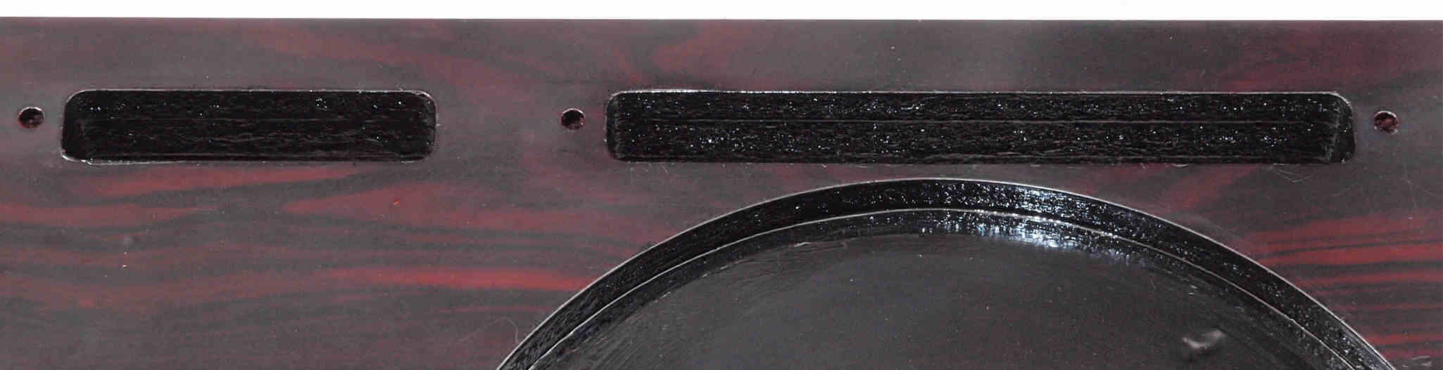 W7. 修理後 タンテーブル穴。 キズを消す為と割れを防ぐのに、ラッカーを吹く。