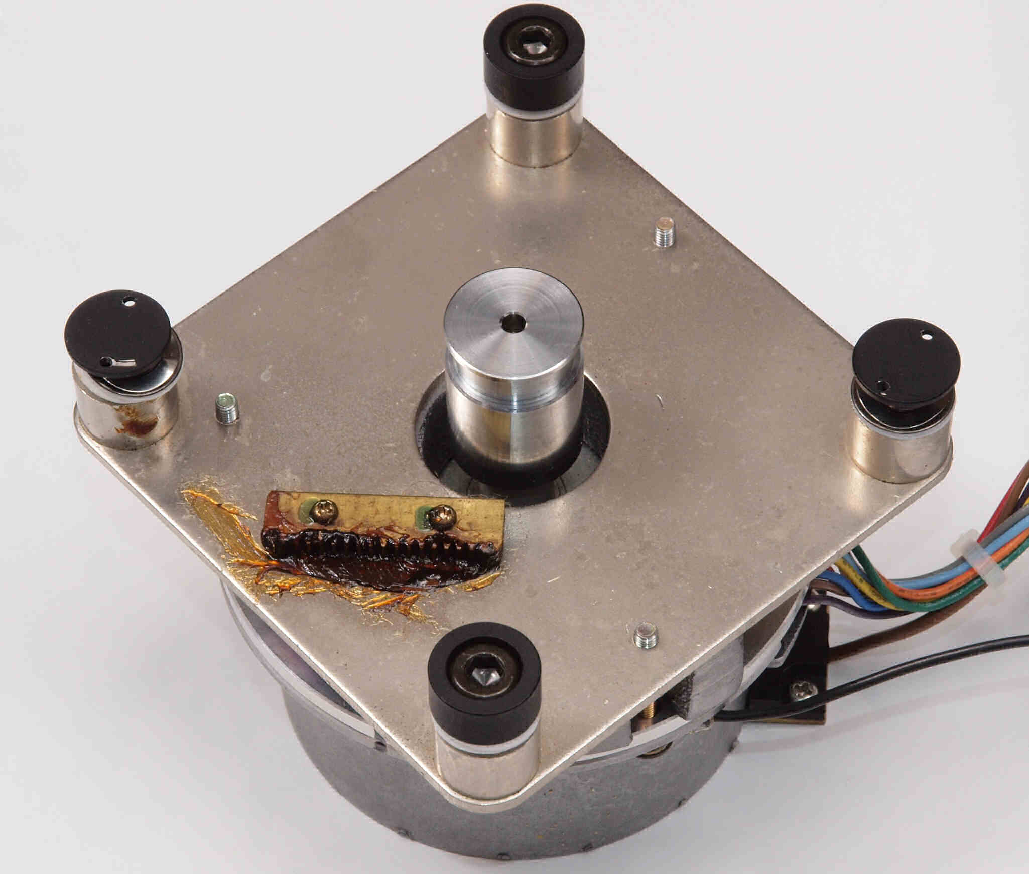 W1. 修理前 タンテーブル軸ユニットを外した本体。アーム取付一体シャーシは接着して有るのでそのまま。