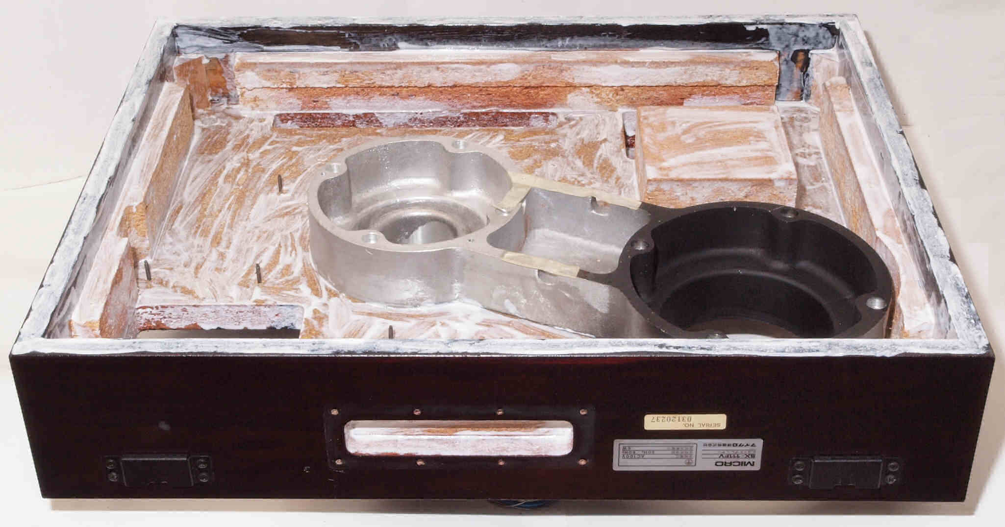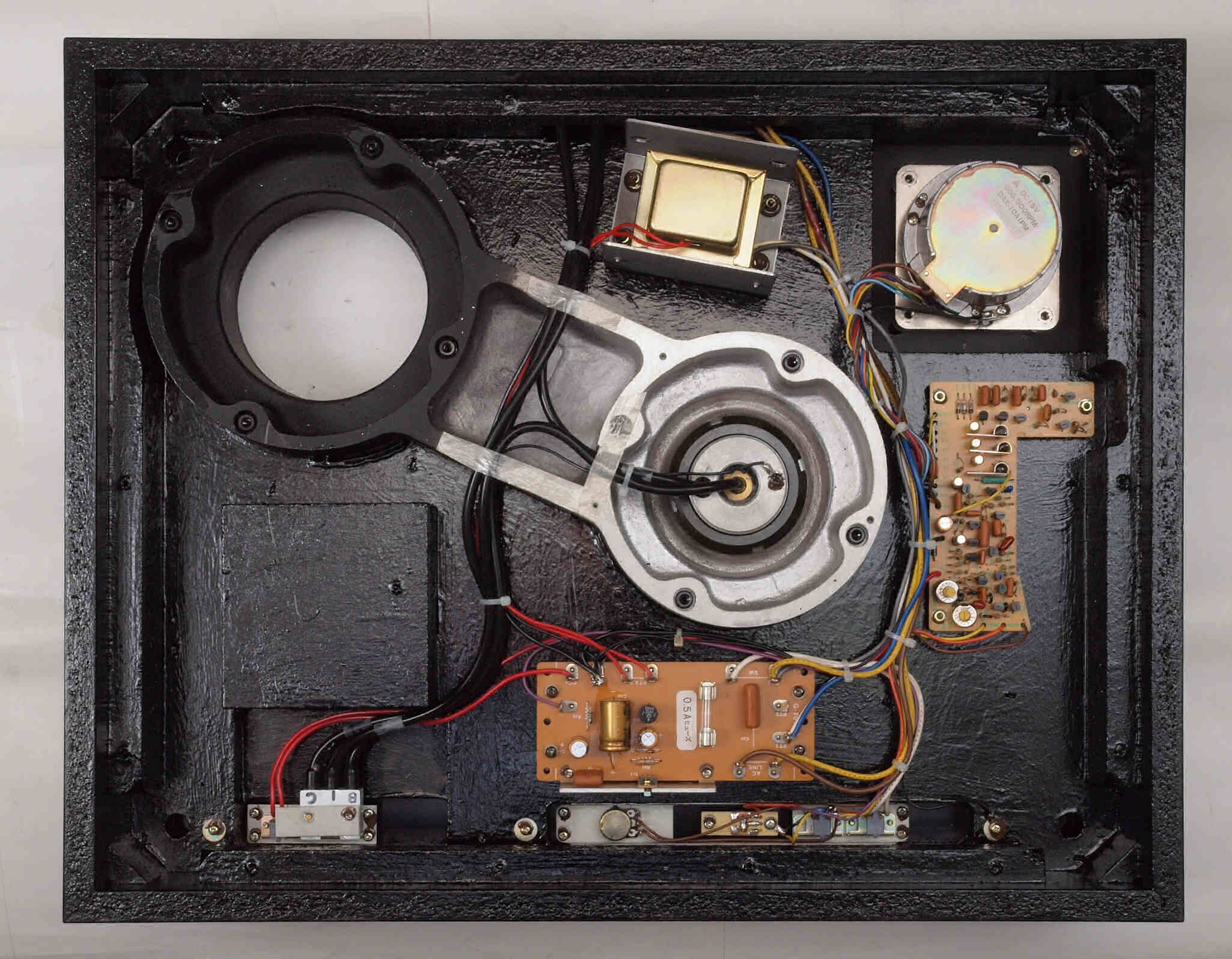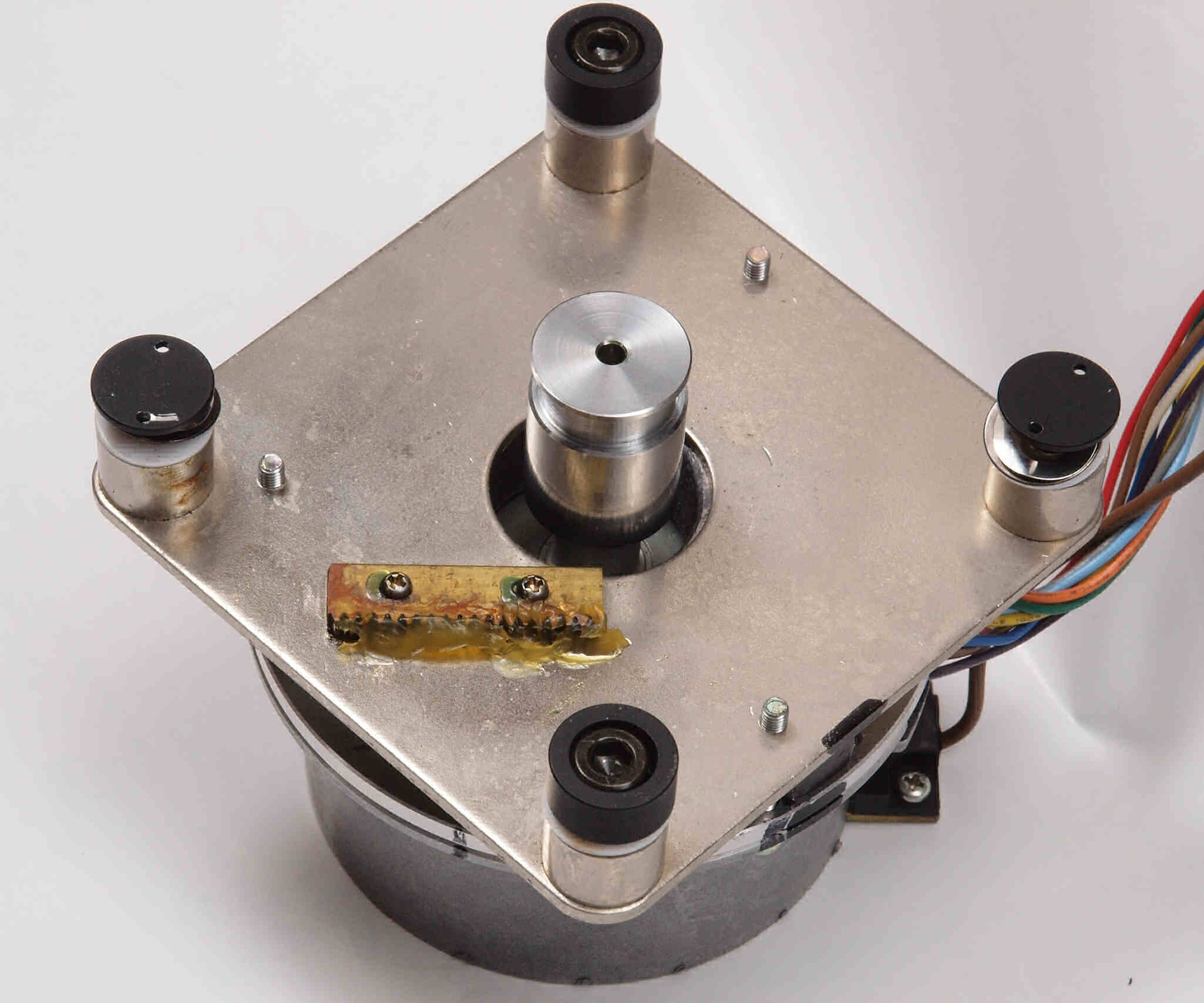 W11. 修理前 タンテーブル軸ユニットを外した本体下。アーム取付一体シャーシは接着して有るのでそのまま。