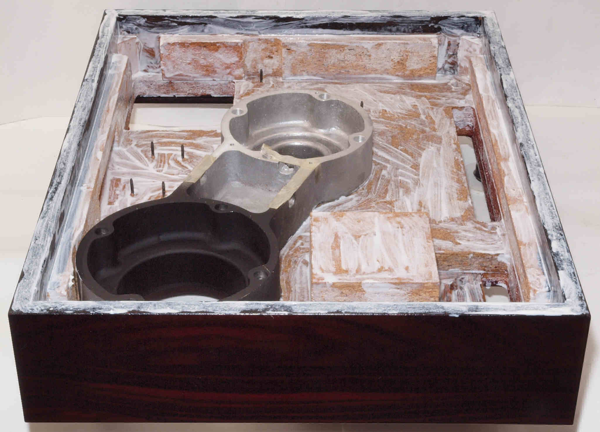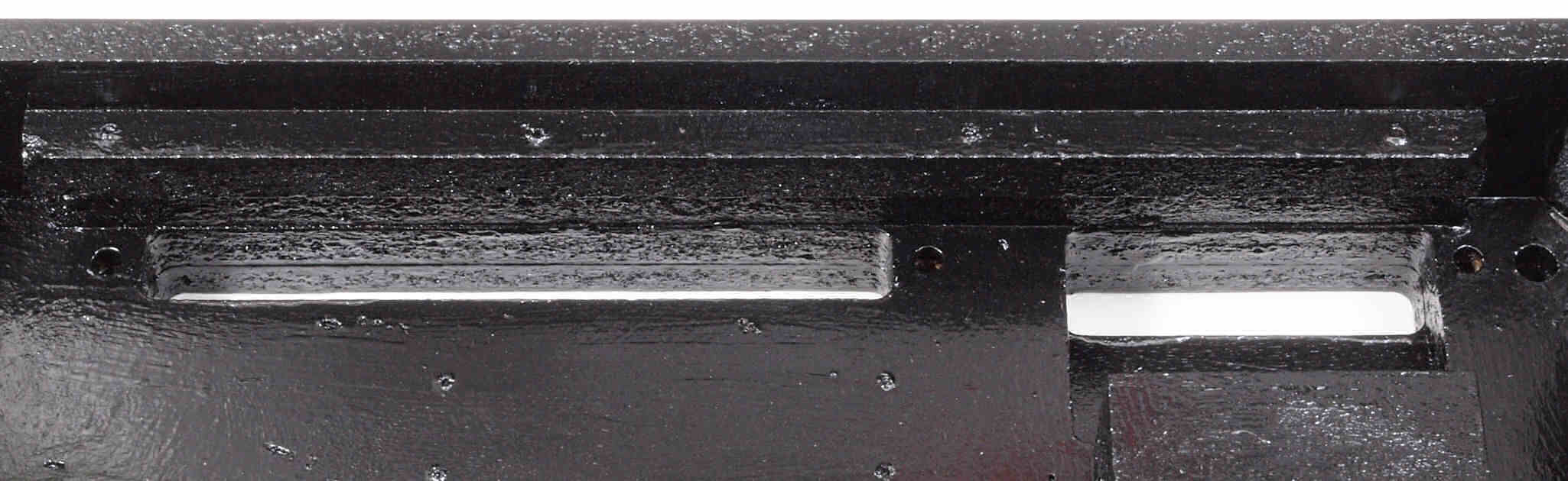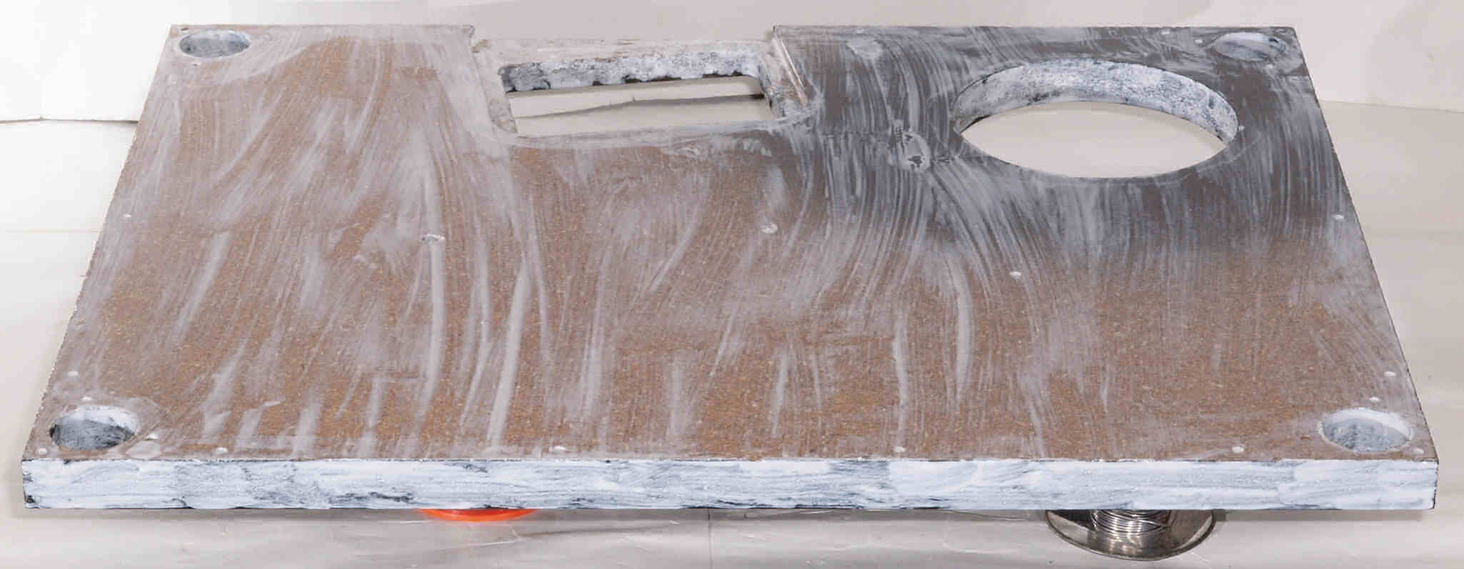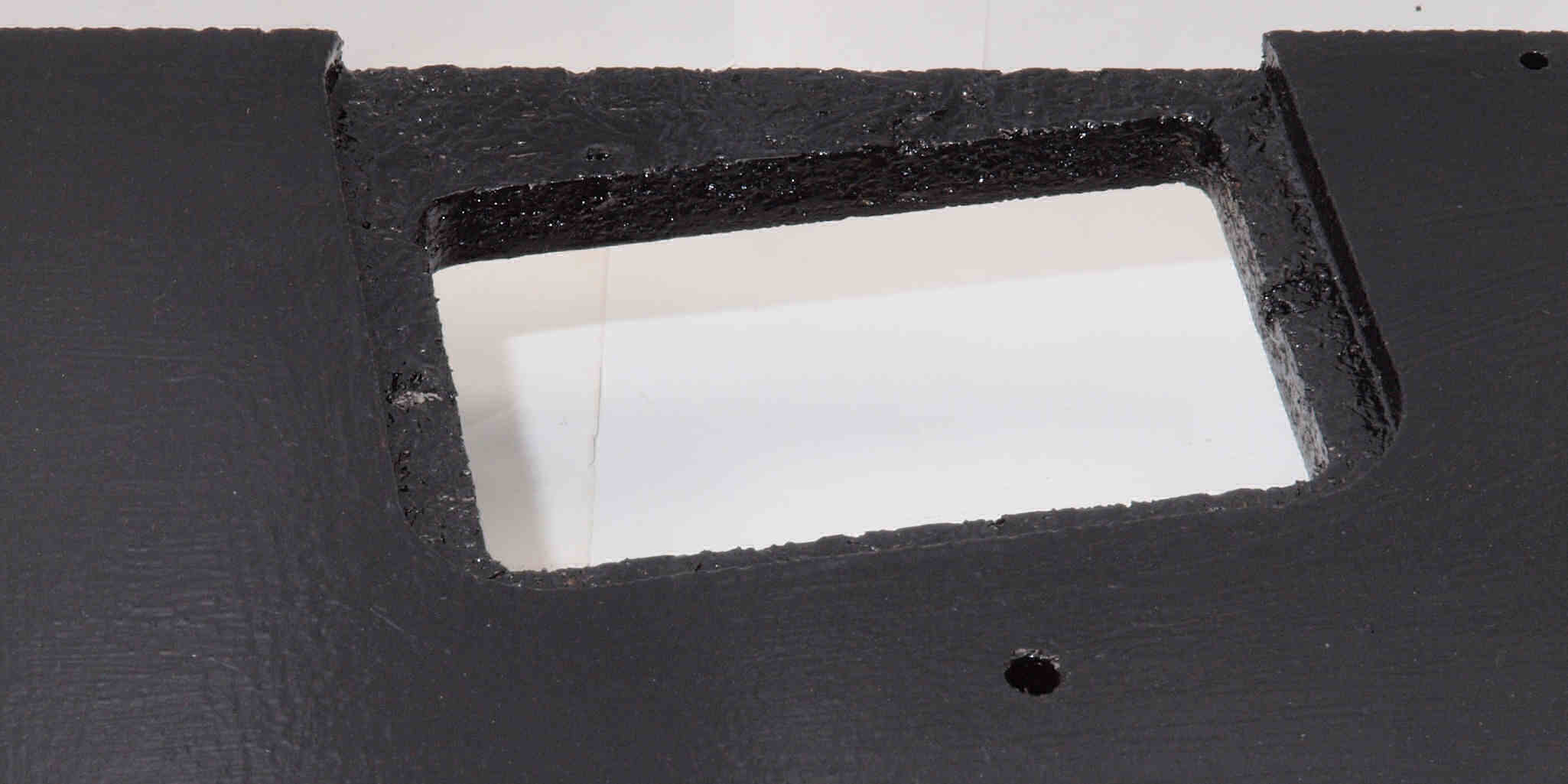 W7C. 修理中 底板裏側、アーム取り付け穴、反対側。さらに、キズを消す為と割れを防ぐのに、ペンキを塗る。