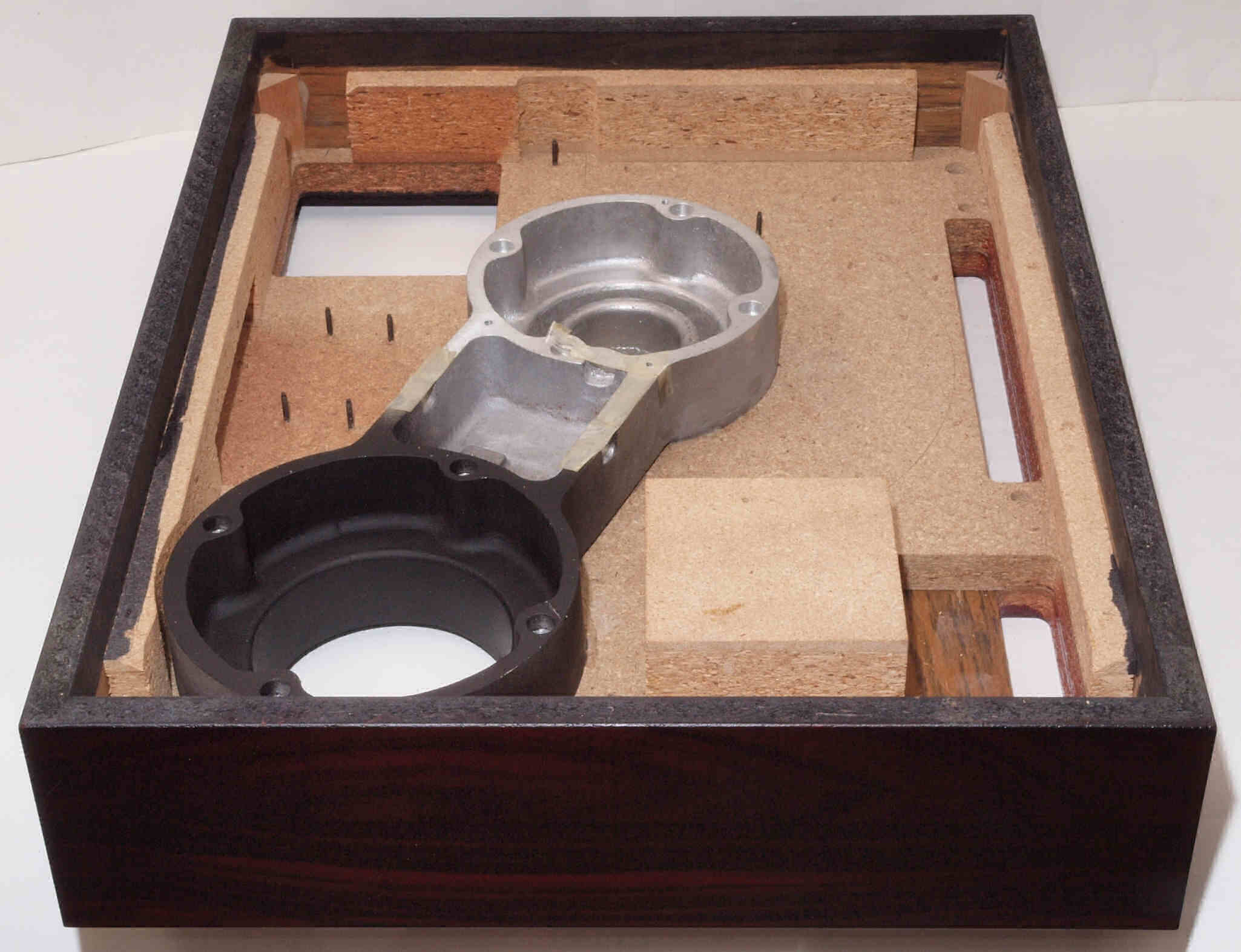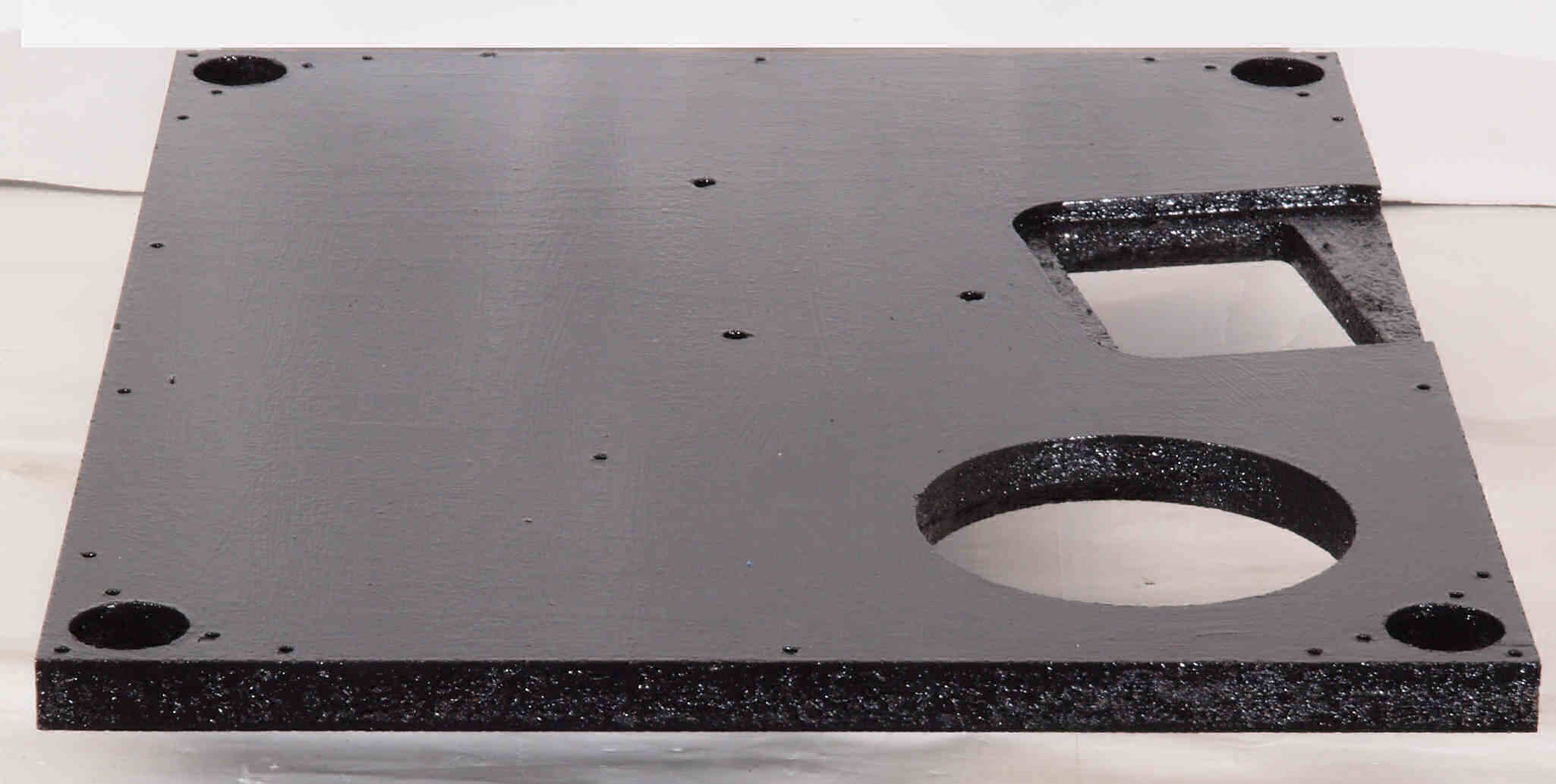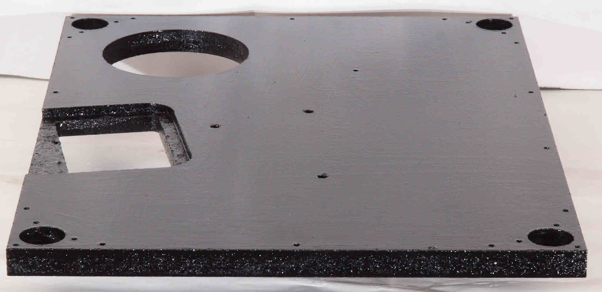 W7C. 修理中 底板裏側、アーム取り付け穴、反対側。さらに、キズを消す為と割れを防ぐのに、ペンキを塗る。