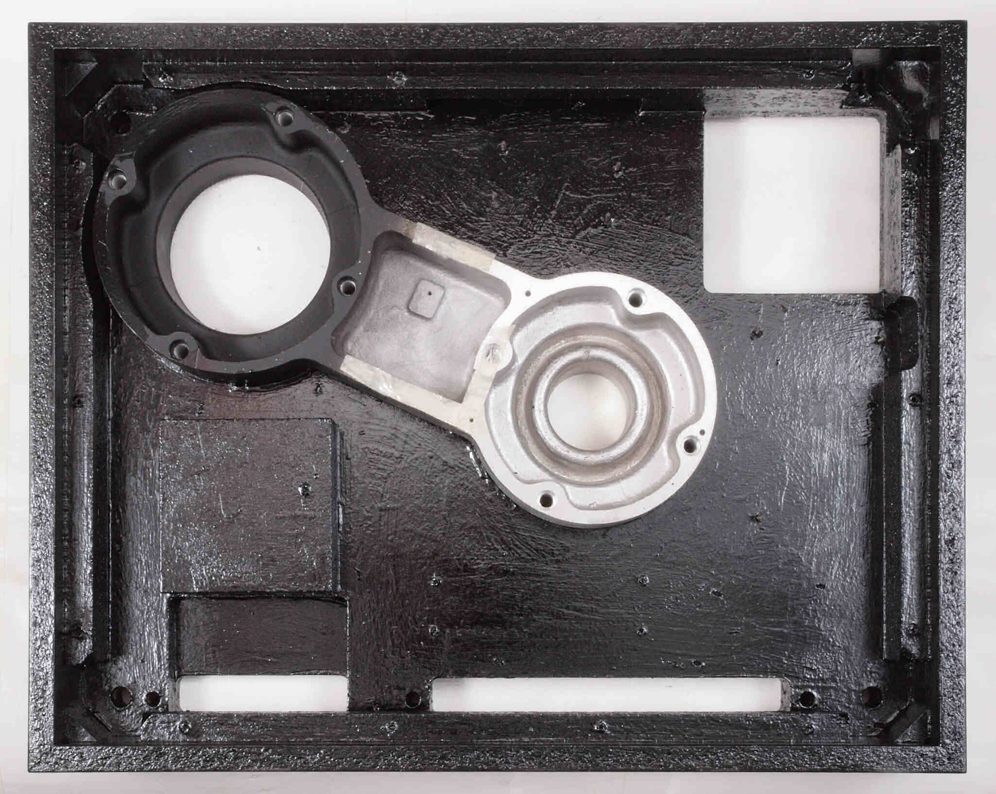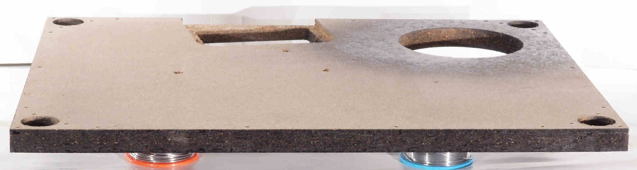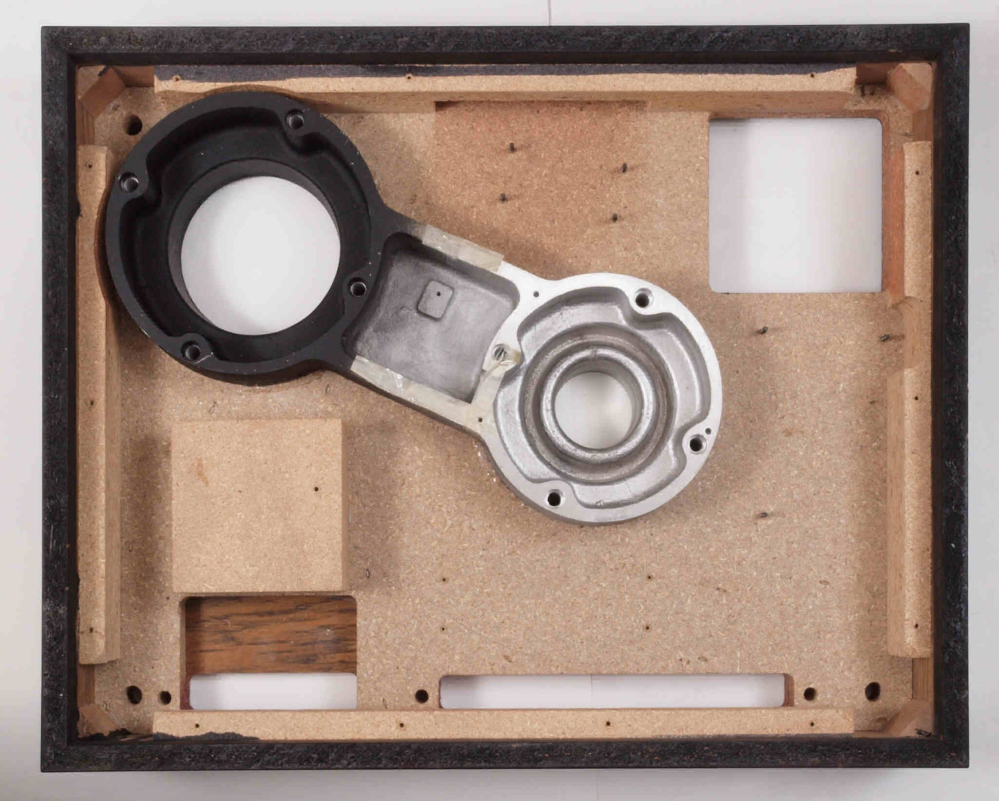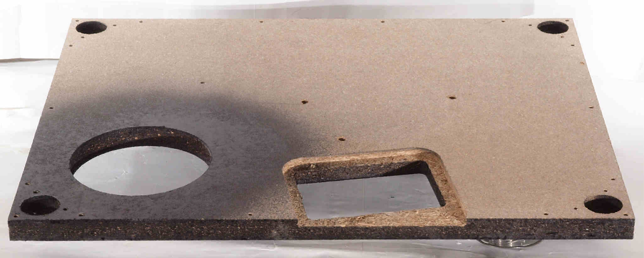 W7C. 修理中 底板裏側、アーム取り付け穴、反対側。さらに、キズを消す為と割れを防ぐのに、ペンキを塗る。
