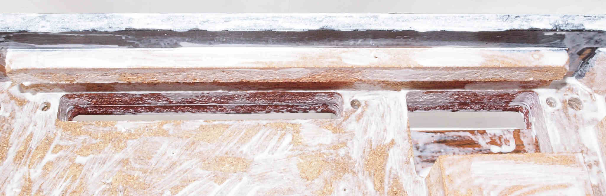 W6B. 修理中 底板裏側、 左から。 圧縮材に、水性木工ボンドを塗布する。