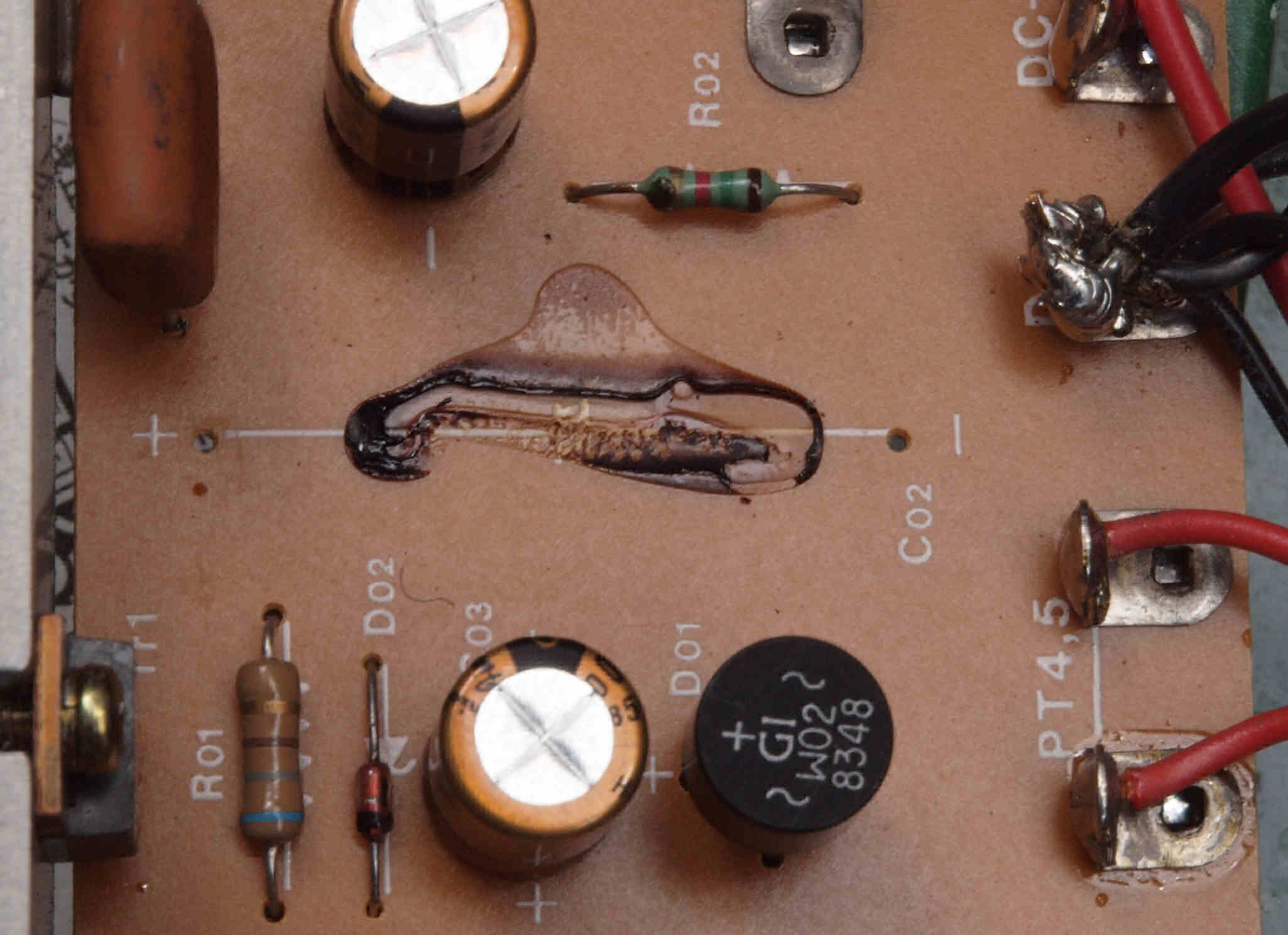 C212. 修理中 電源・フューズ基板。 トルエン溶媒の接着剤。