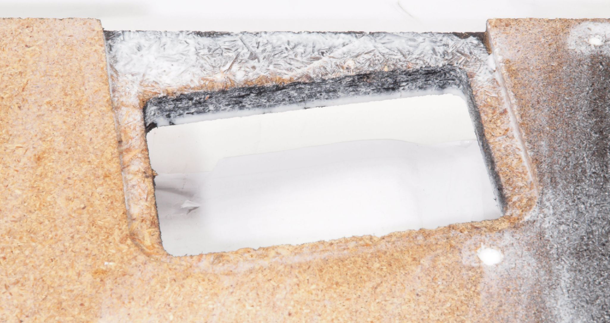 W1E. 修理中 操作部取り付け穴。 水性木工ボンドを塗布する。