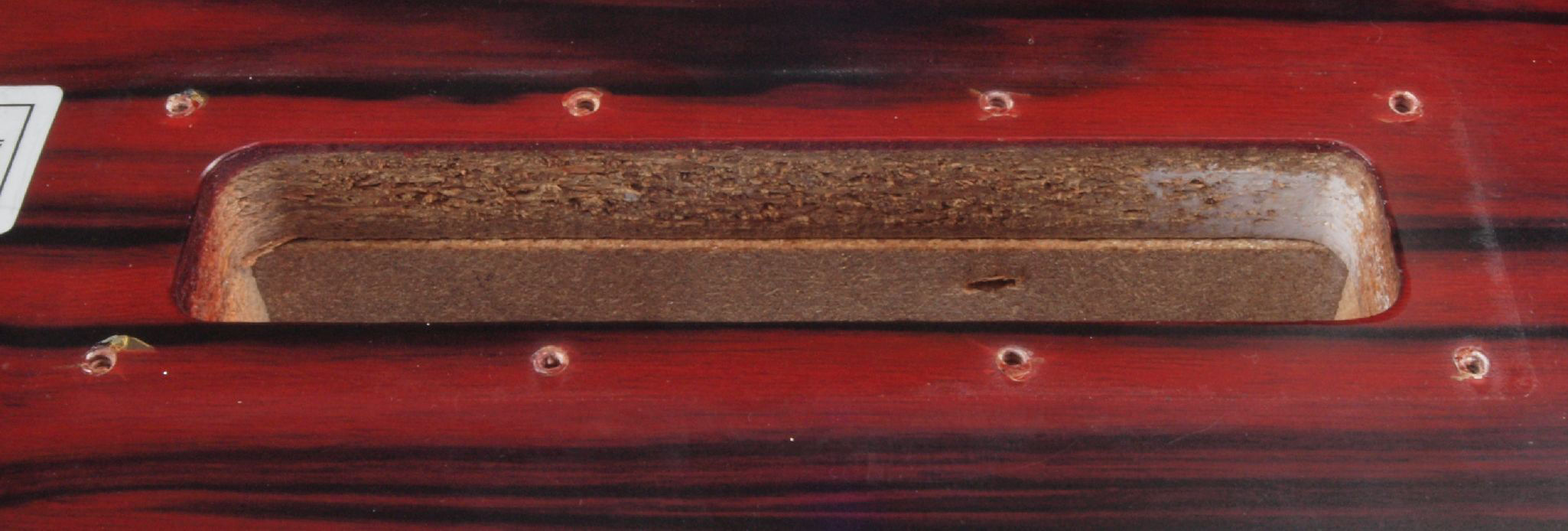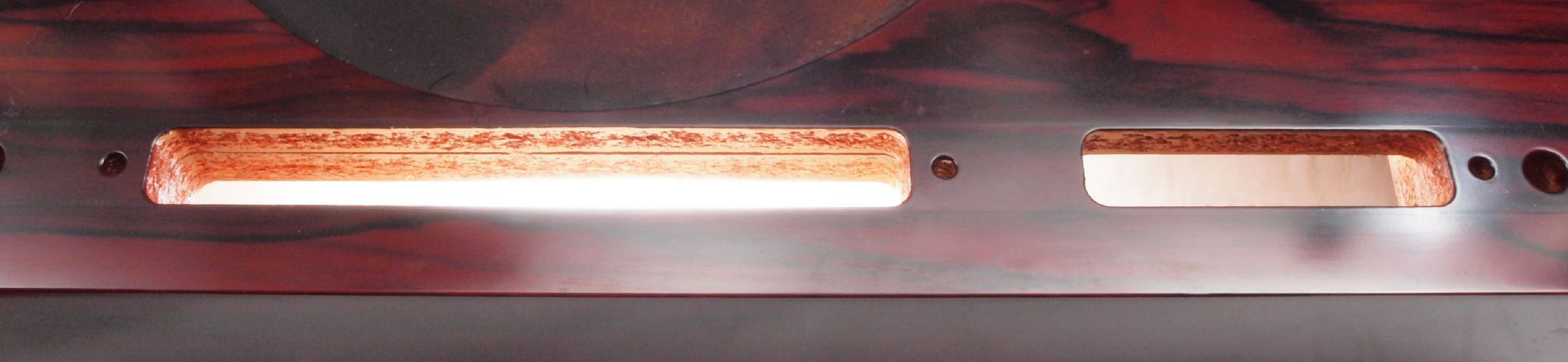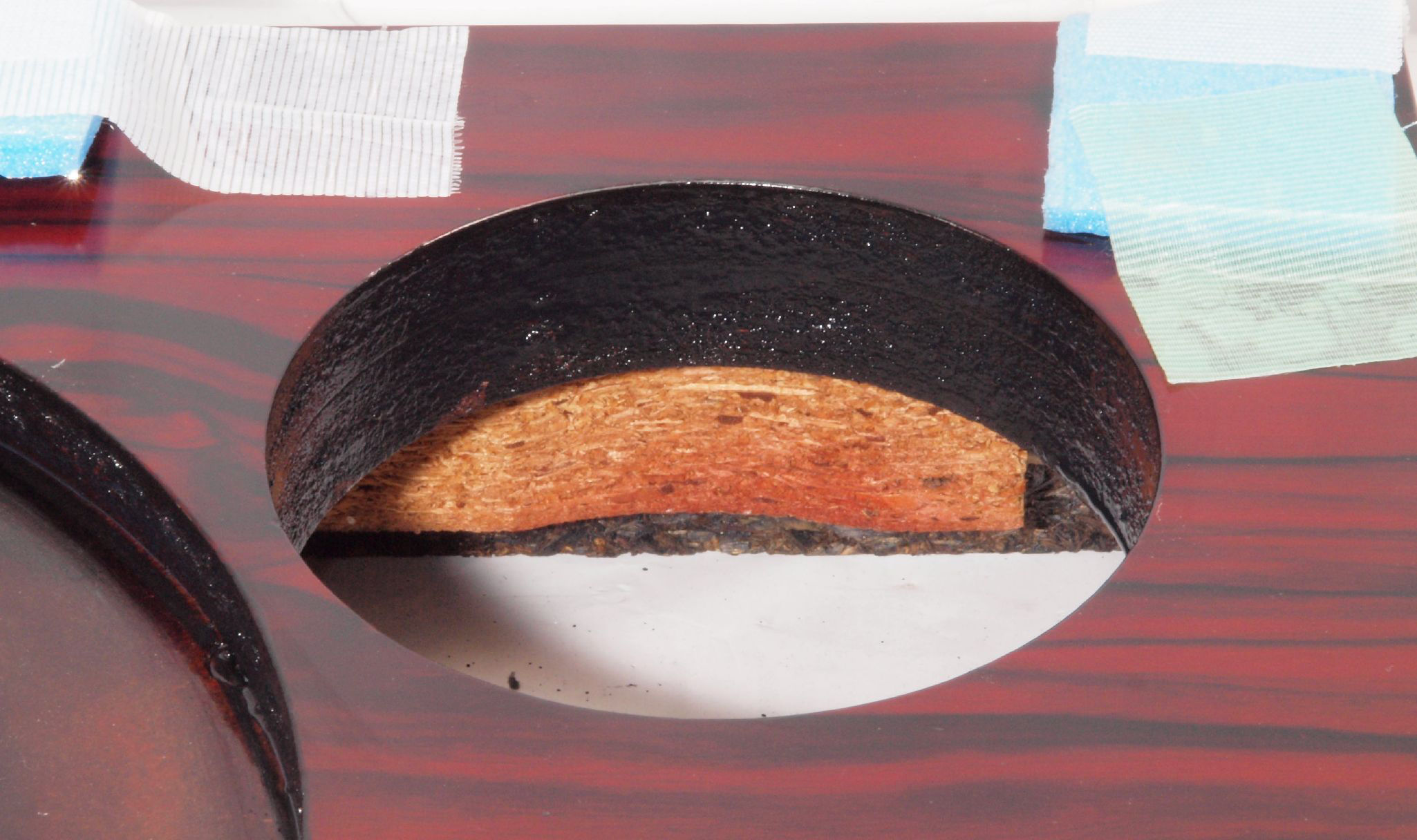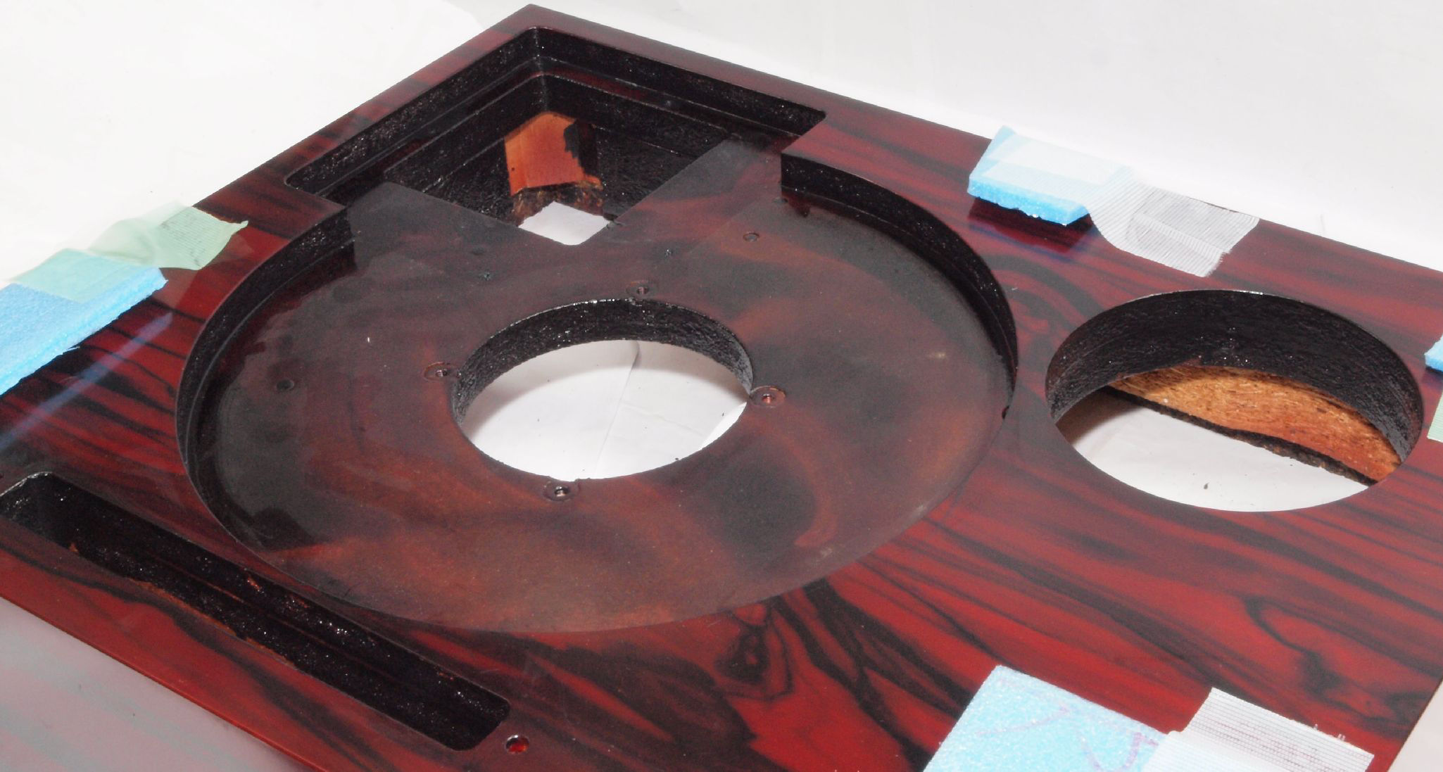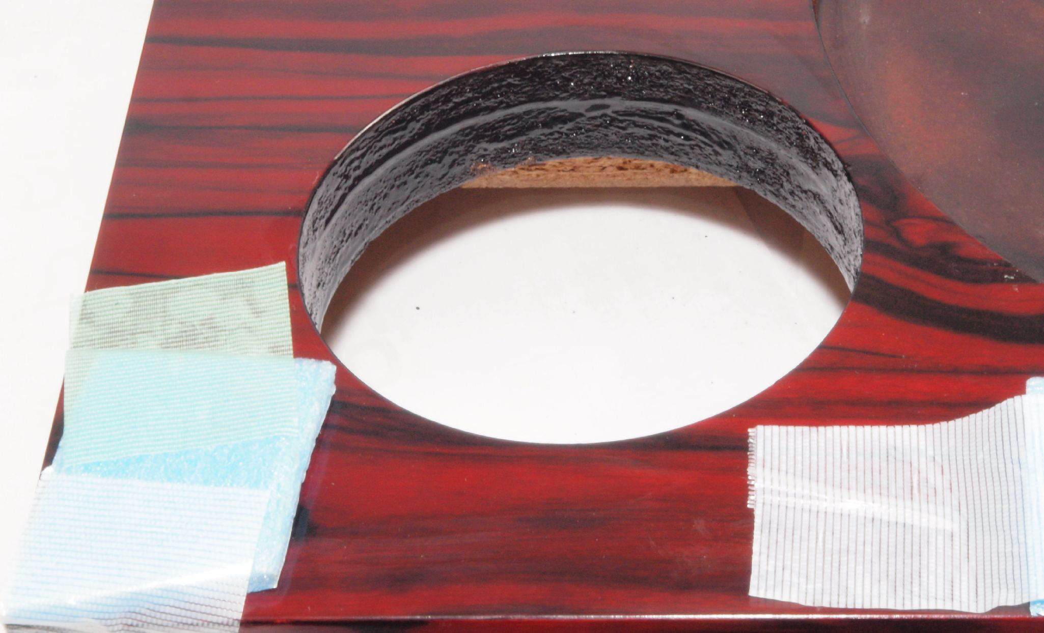 W1C. 修理後 タンテーブル取り付け穴。 キズを消す為と割れを防ぐのに、塗装する。