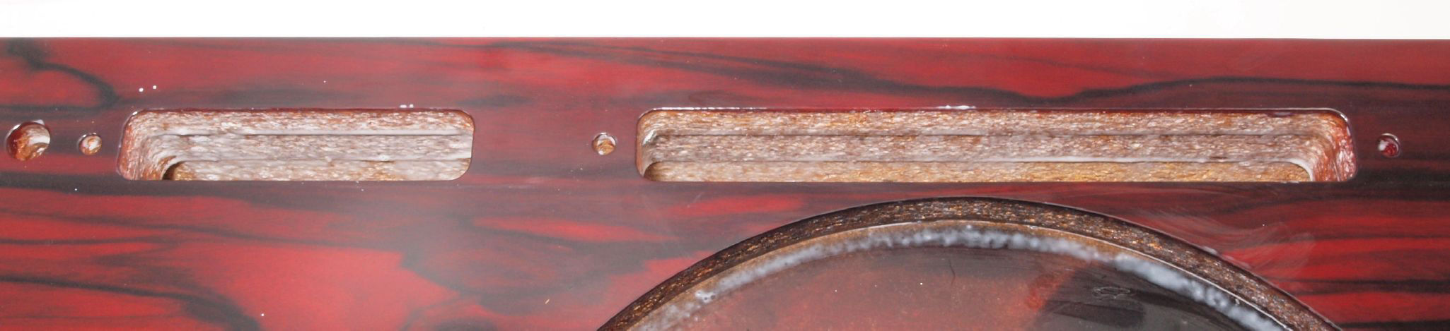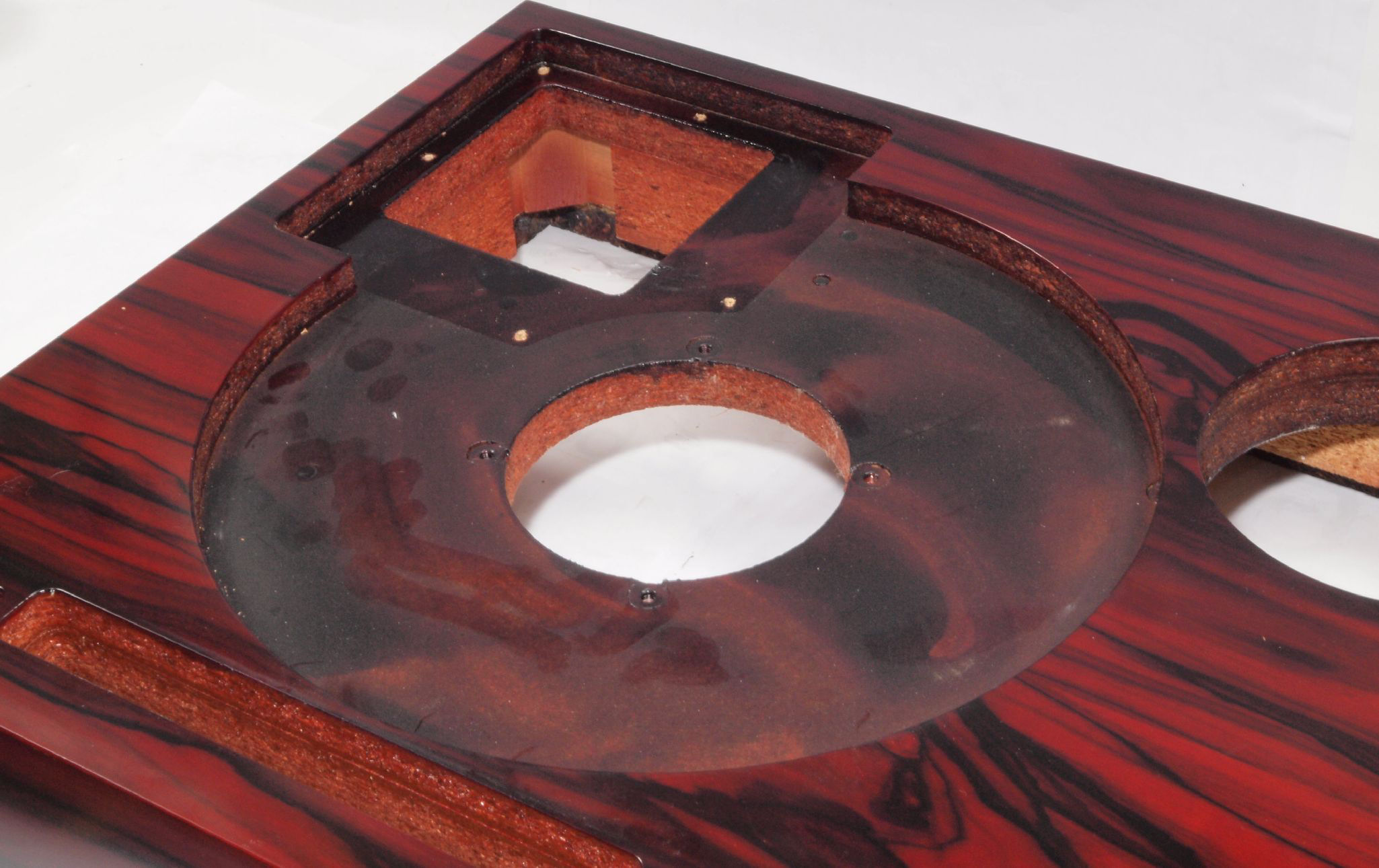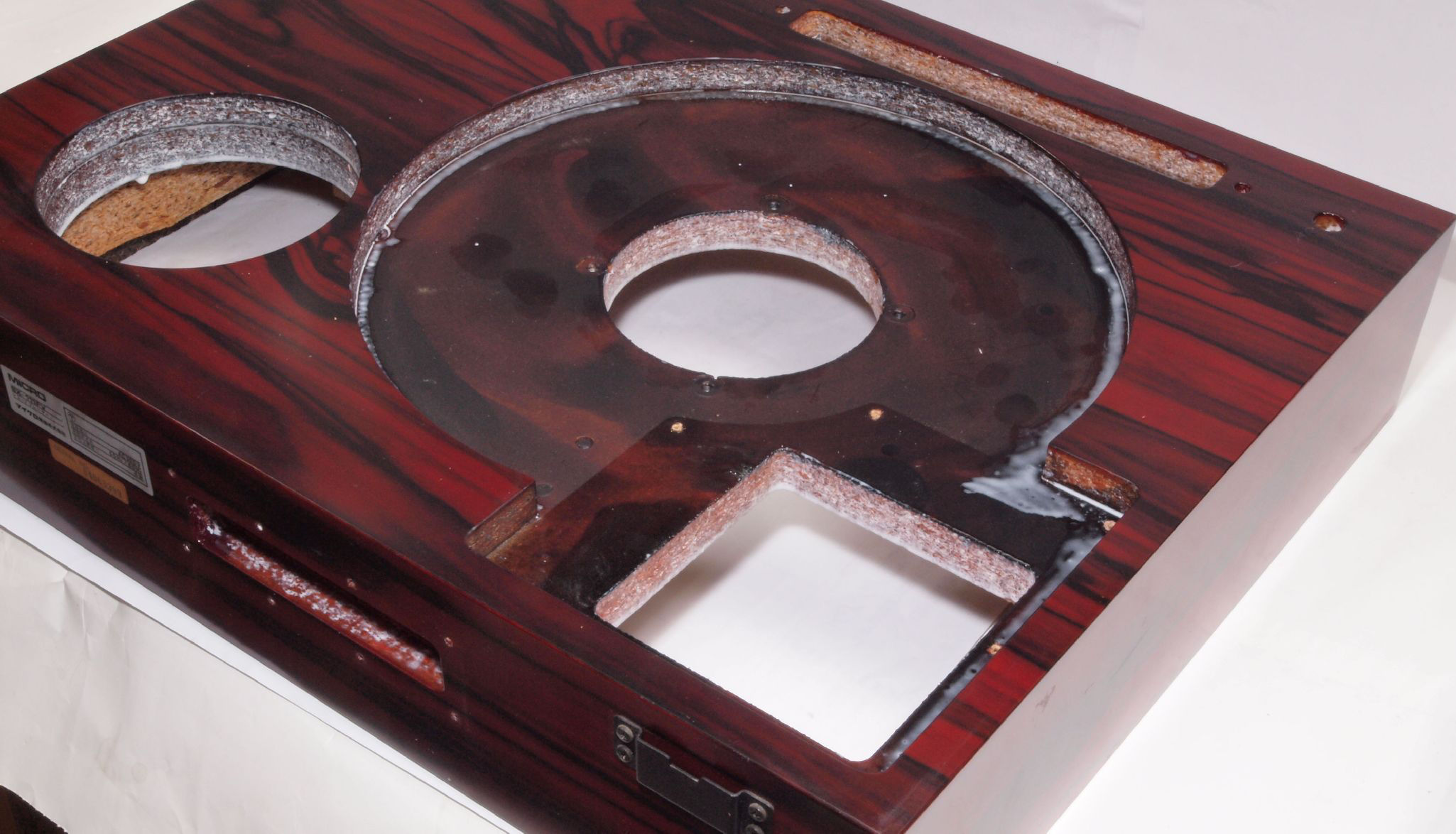 W1B. 修理中 タンテーブル取り付け穴。 水性木工ボンドを塗布する。