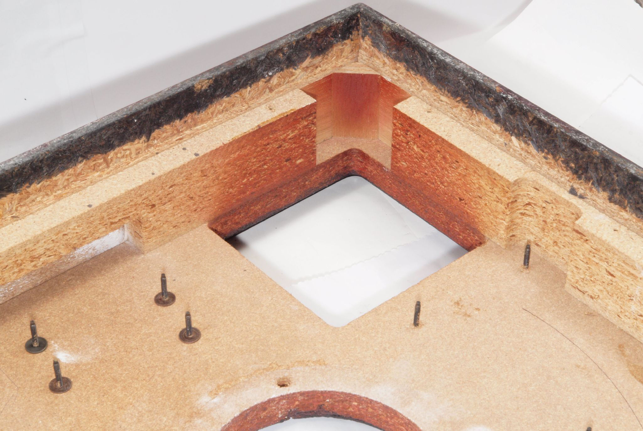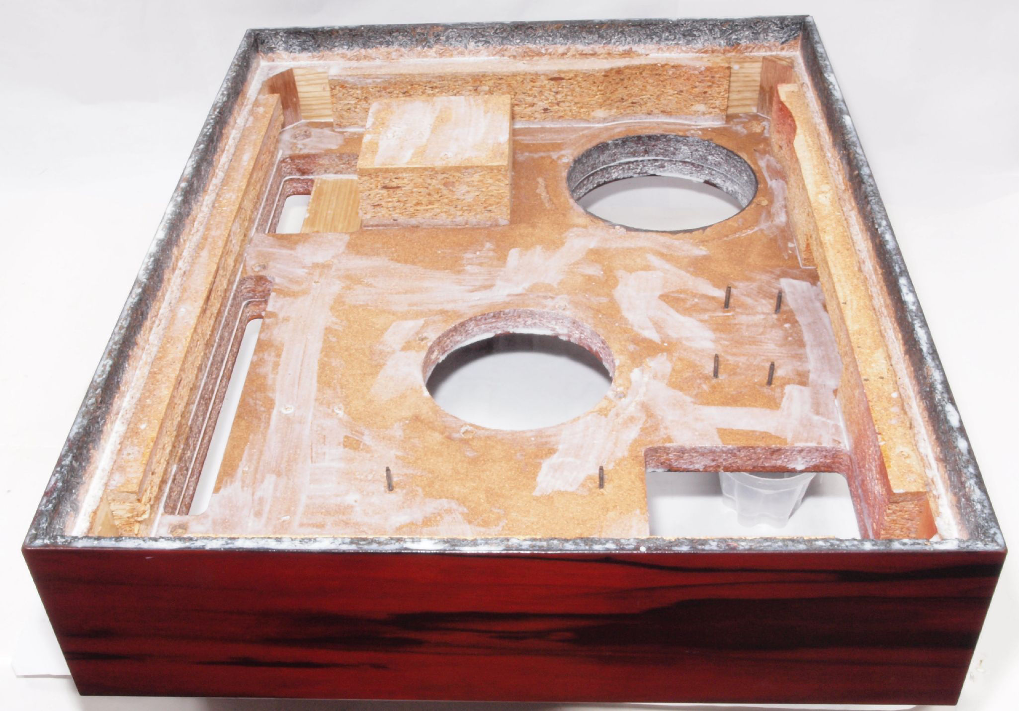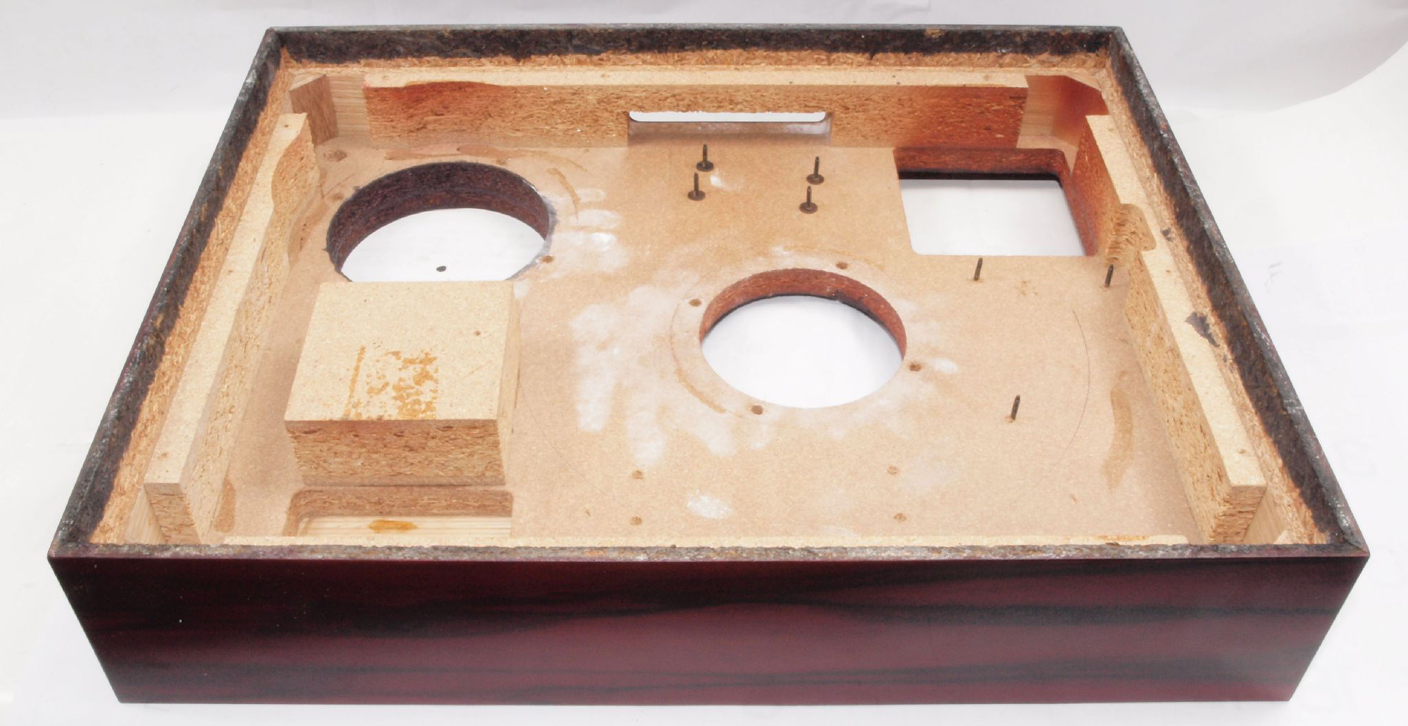 W1B. 修理中 タンテーブル取り付け穴。 水性木工ボンドを塗布する。
