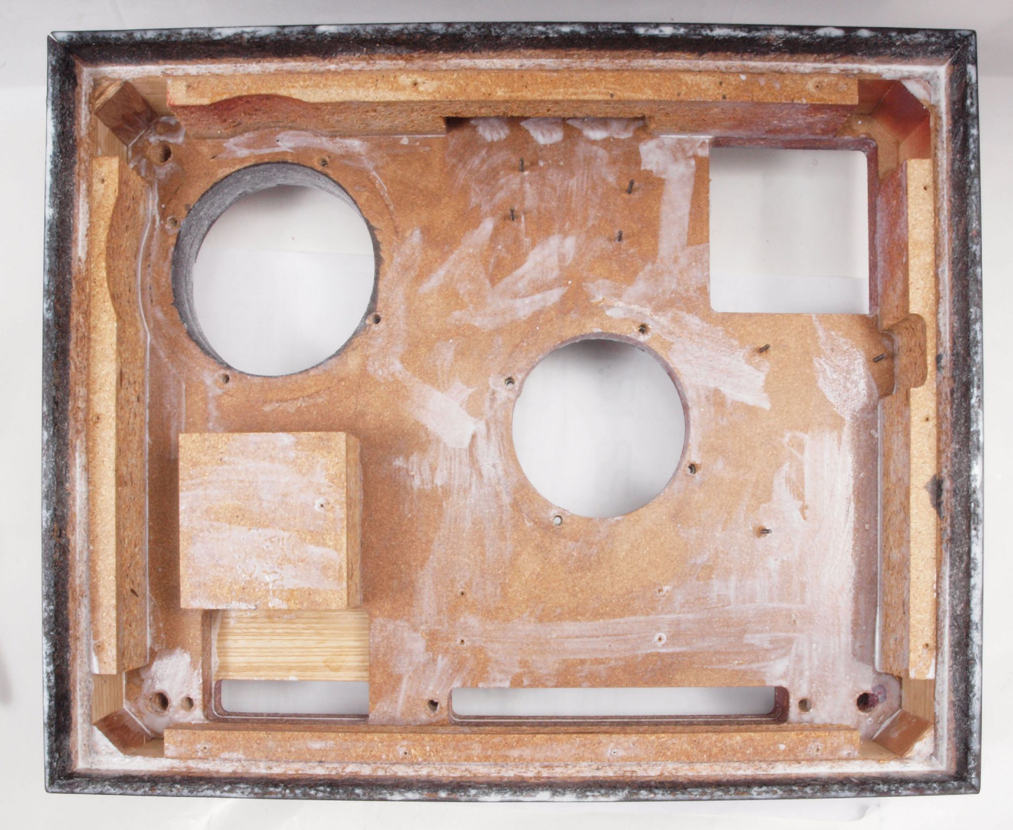 W82. 修理中 底板裏側、トランスカバーを取付ける所、水性木工ボンドを塗布する。