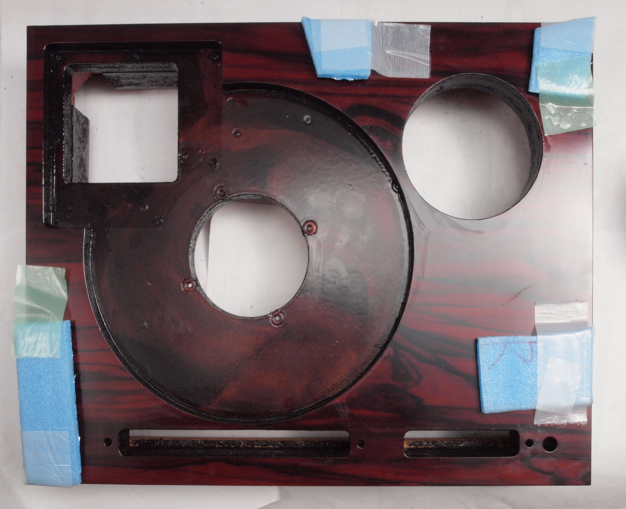 W93. 修理中 底板裏側、アーム取り付け穴、さらに、キズを消す為と割れを防ぐのに、ペンキを塗る。