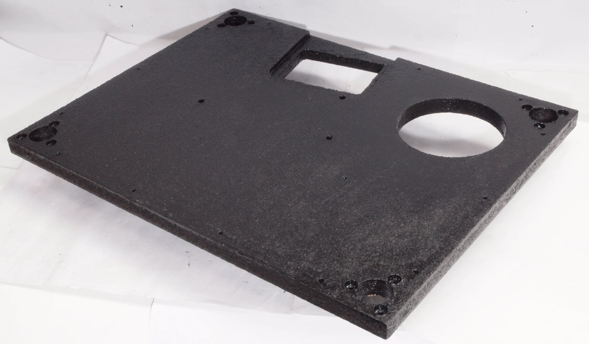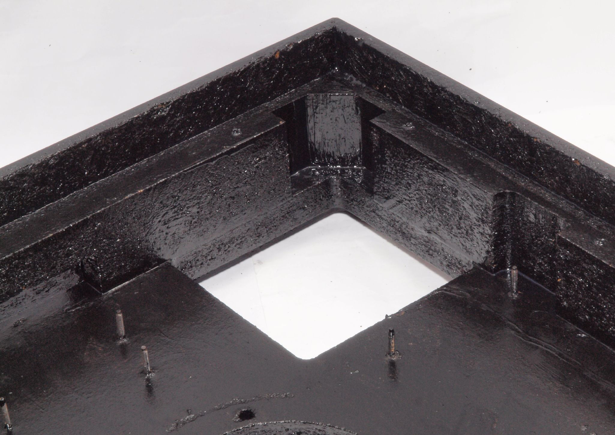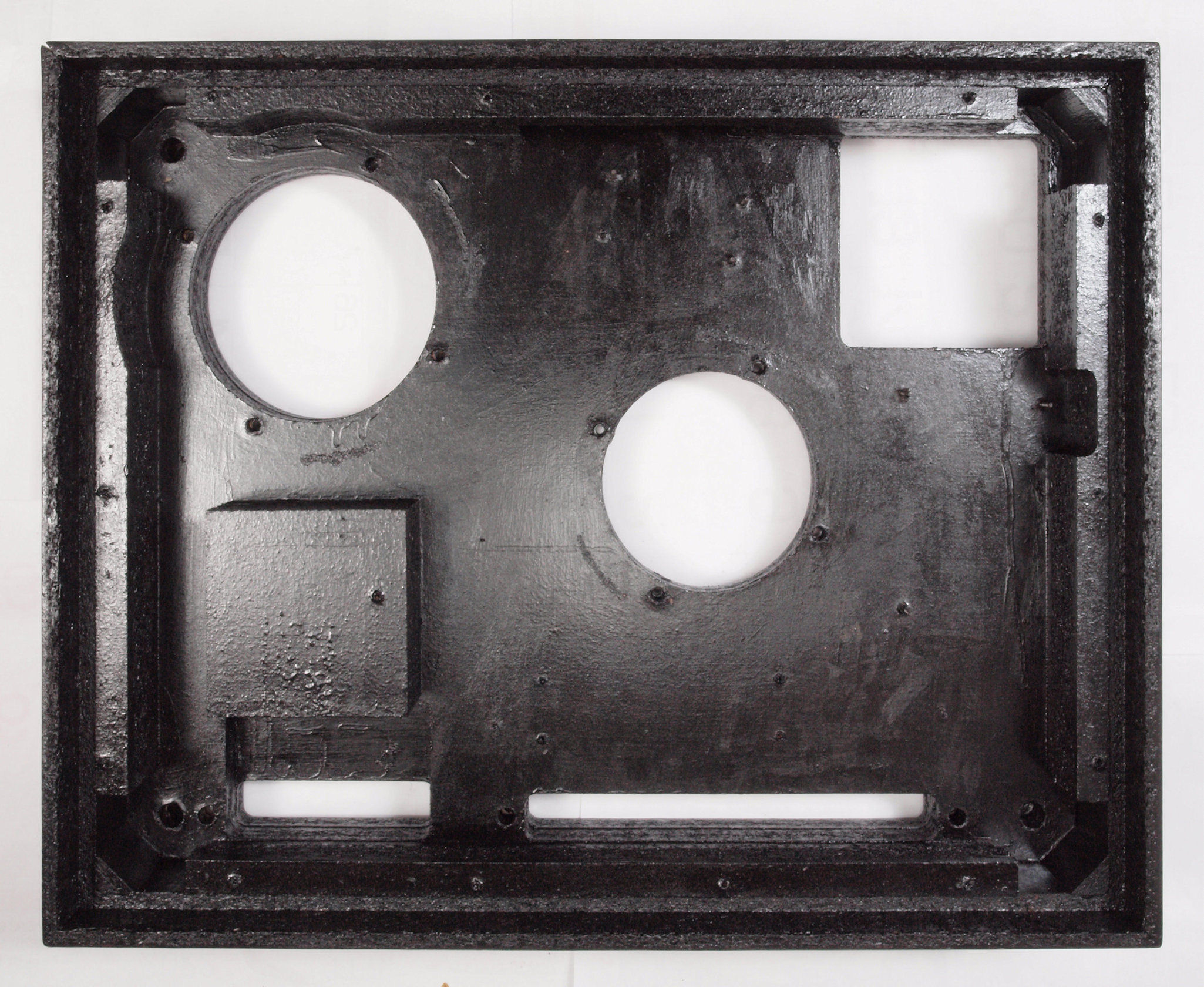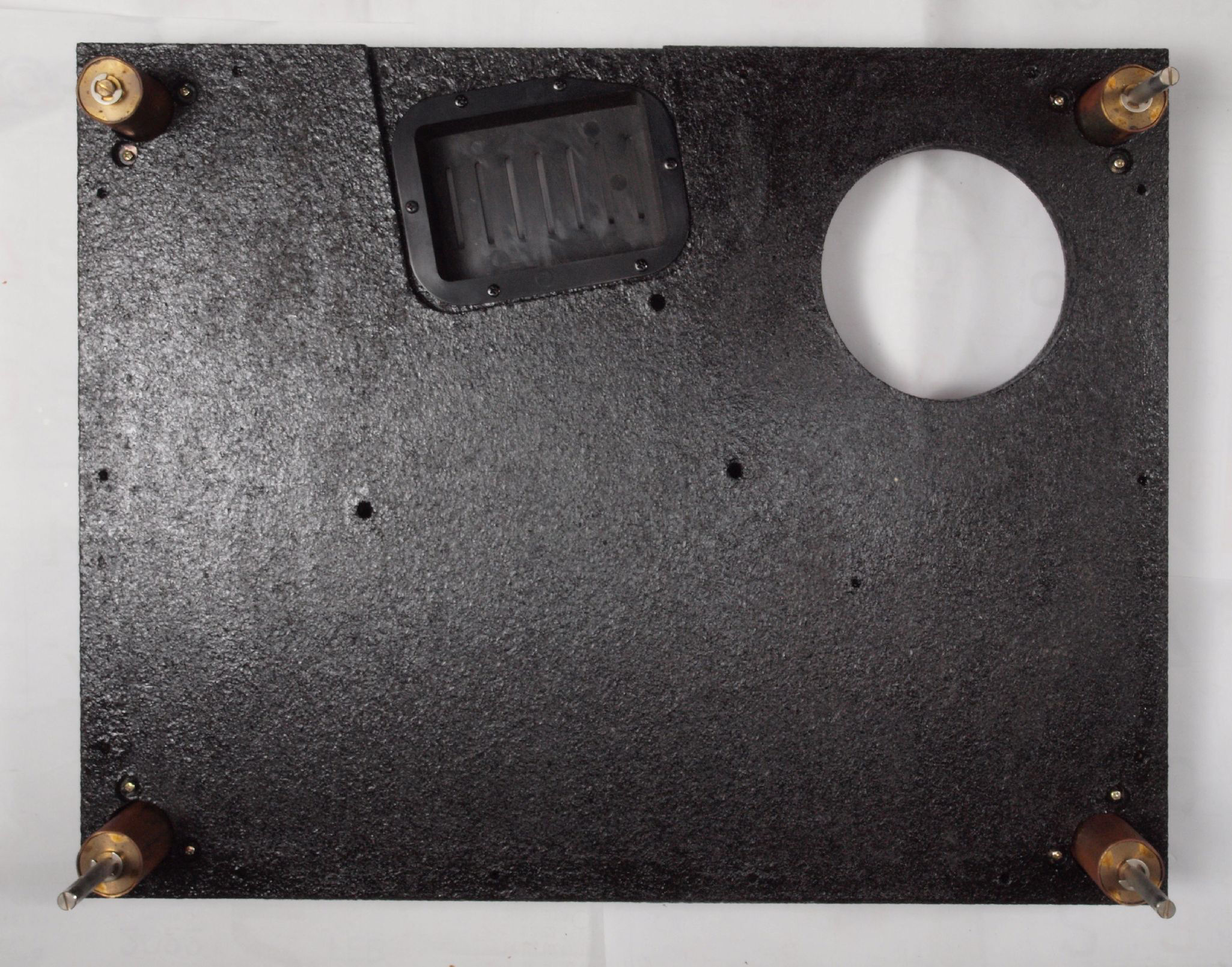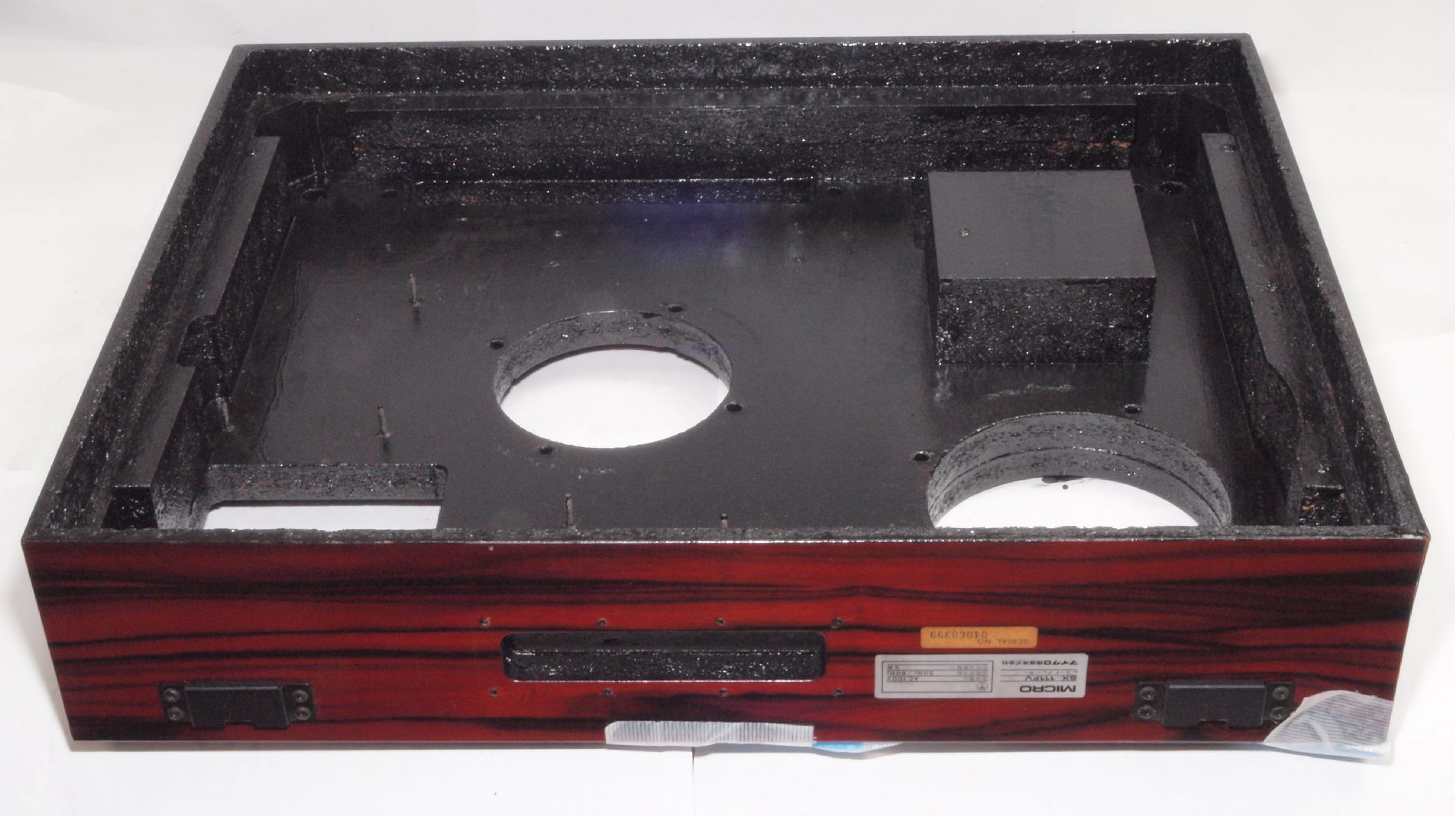 W96. 修理中 底板裏側、アーム取り付け穴、反対側。さらに、キズを消す為と割れを防ぐのに、ペンキを塗る。