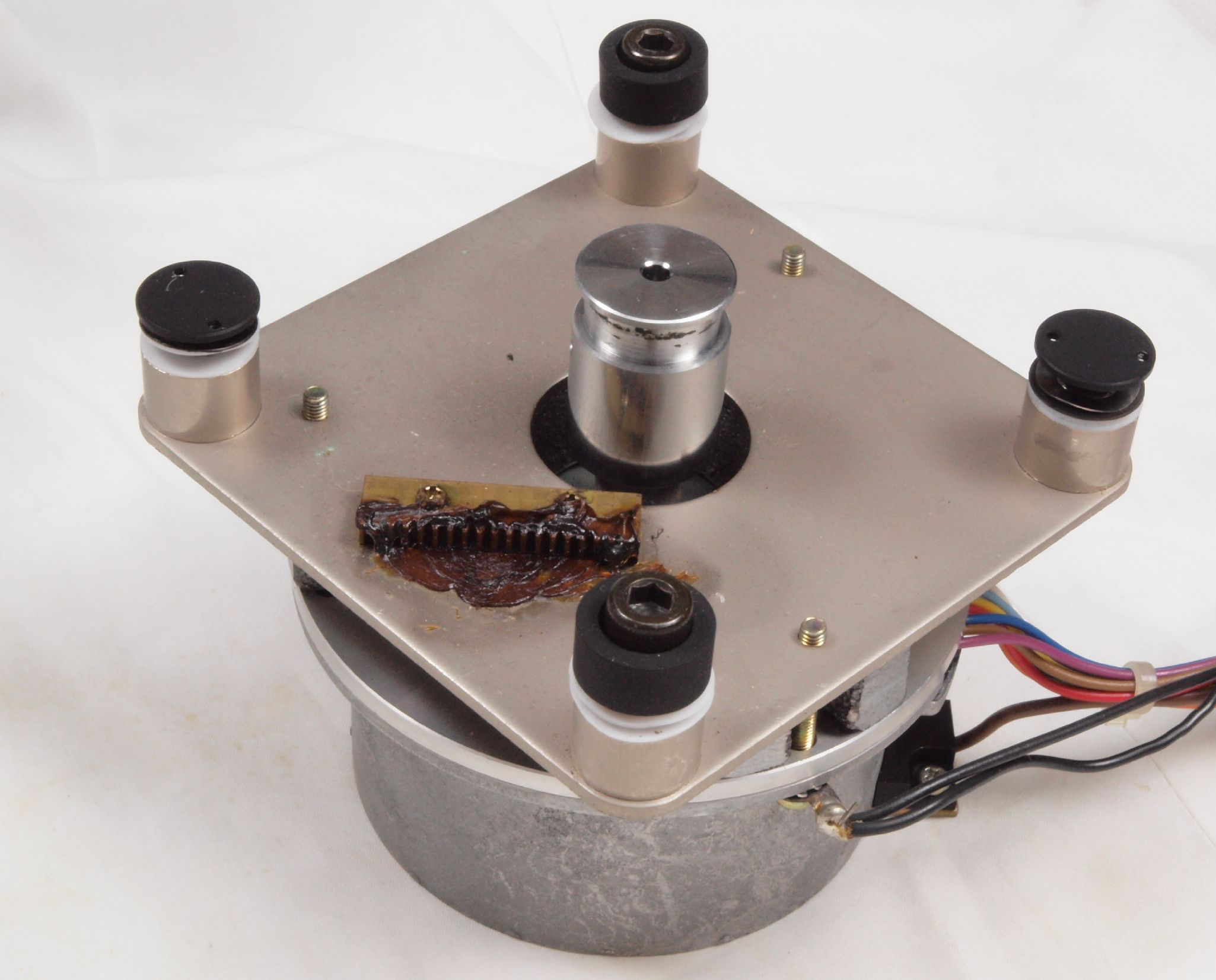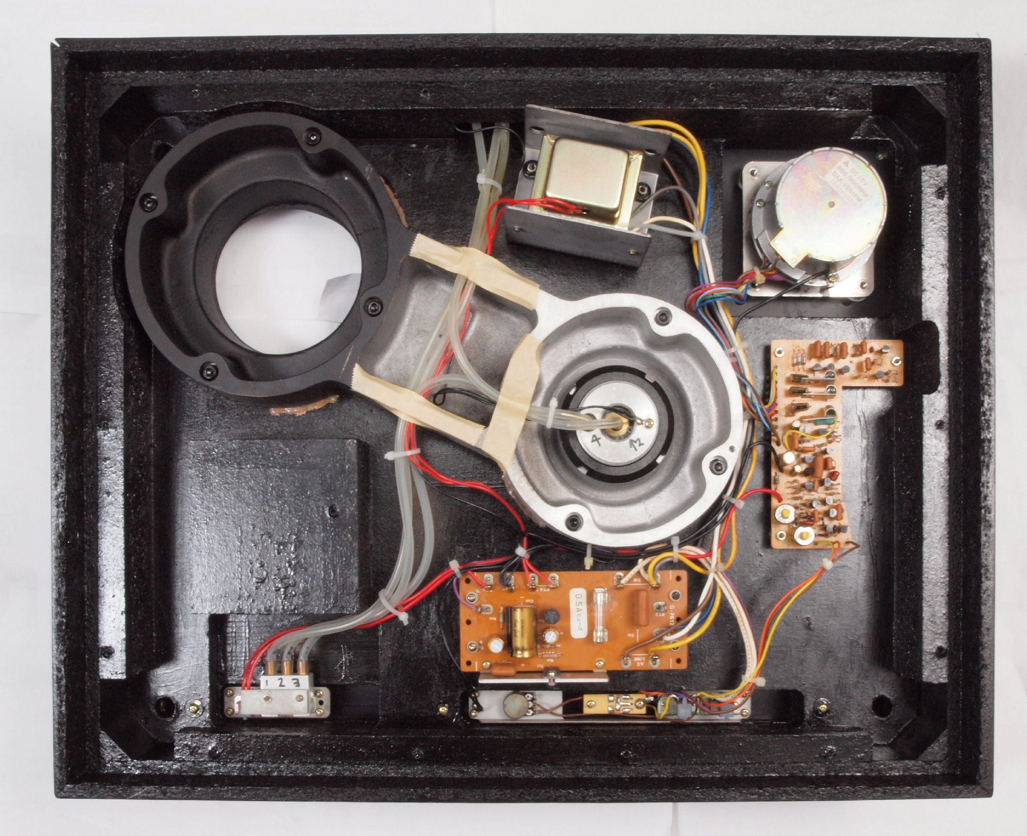 W2. 修理中 タンテーブル軸ユニット、アーム取付一体シャーシを外した本体。保護する。