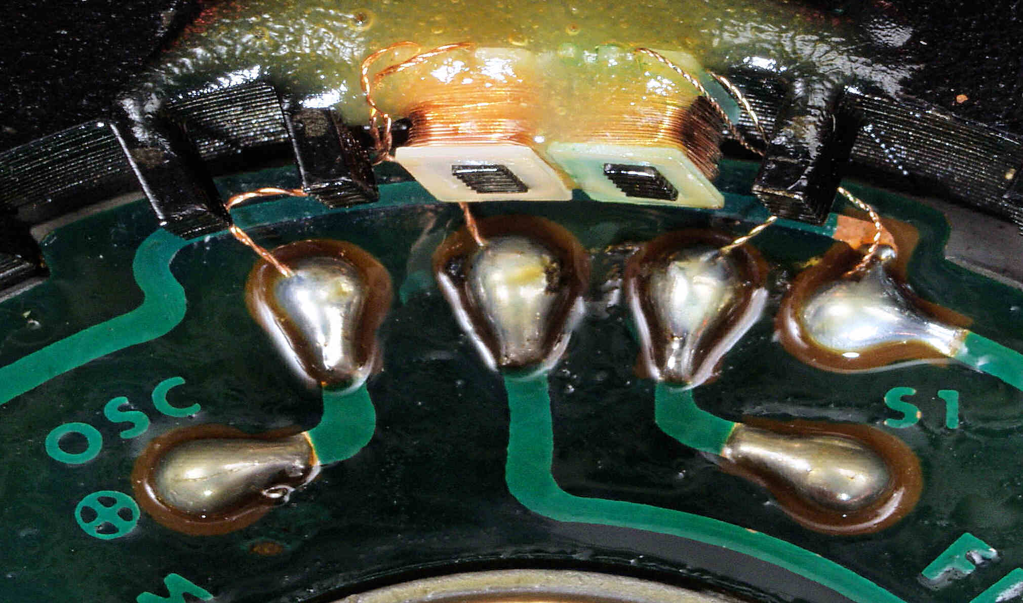 C63. 完成モータ位置コイル基板。余分なフラックスを落として、コート液を塗る。