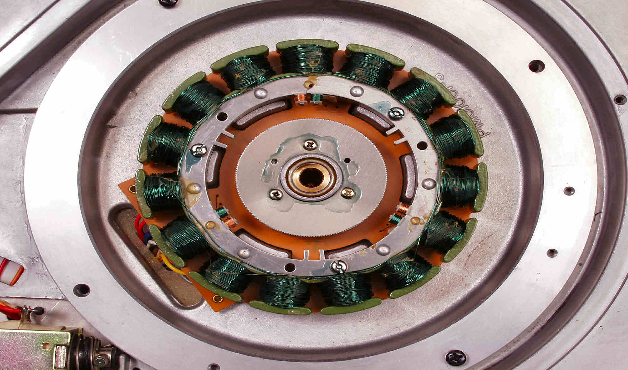 C−9A. 修理中 心臓部のモーター固定子 清掃・増締めする