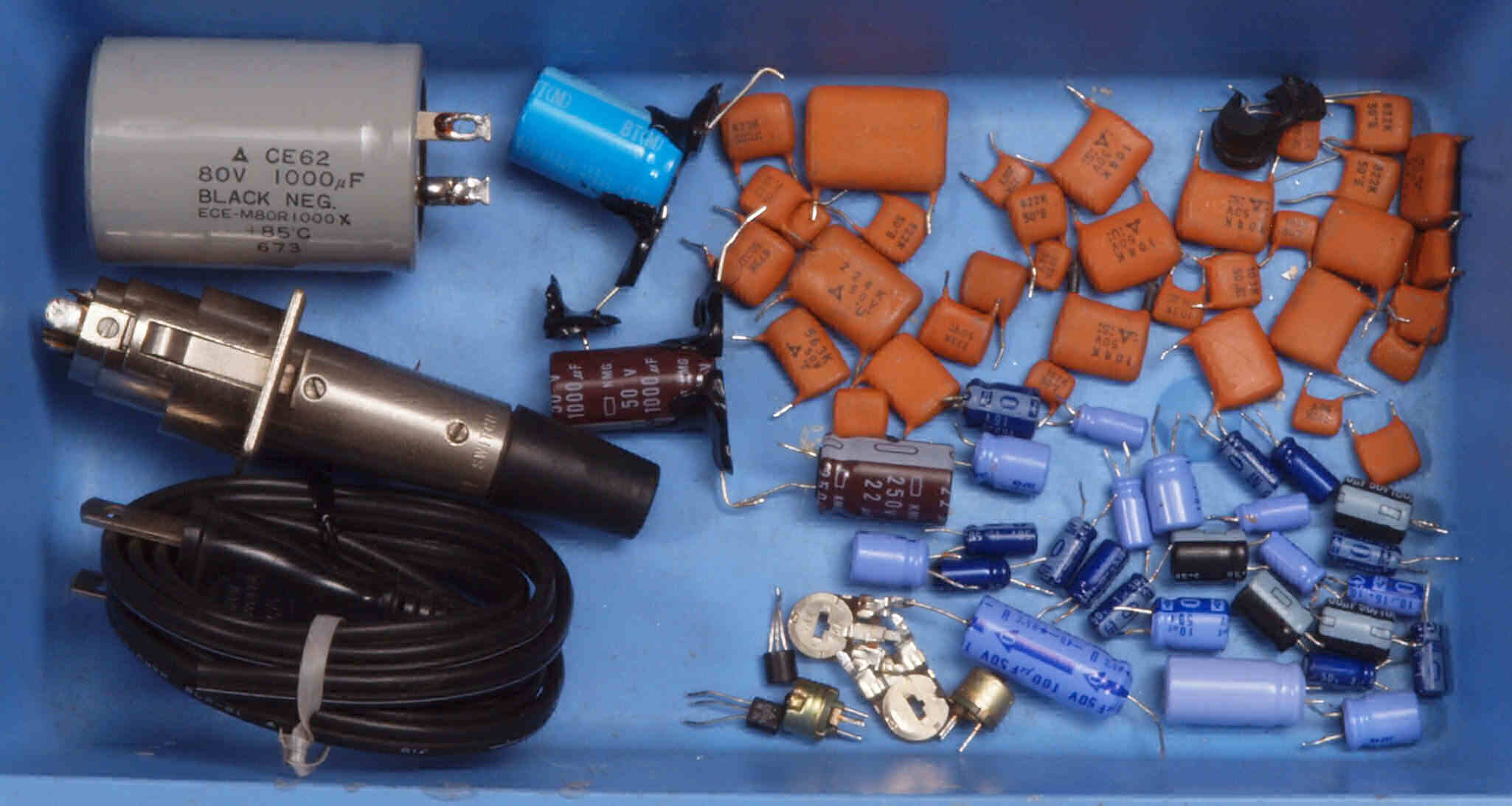 | A76. 点検中 電源供給XLRプラグ・コネクター。 上=NEUTRIC製金メッキ端子に交換。 下=純正品。 | ||||||||||||||||||||||||||||||||||||