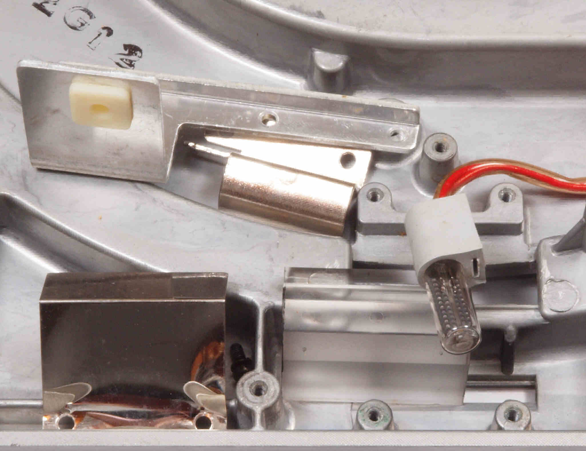| A. 修理前の状況。 画像をクリックすると、大きく(横幅2050ドット)表示されます。 A1. 点検中 上から見る、モーター固定金具を使用。 |