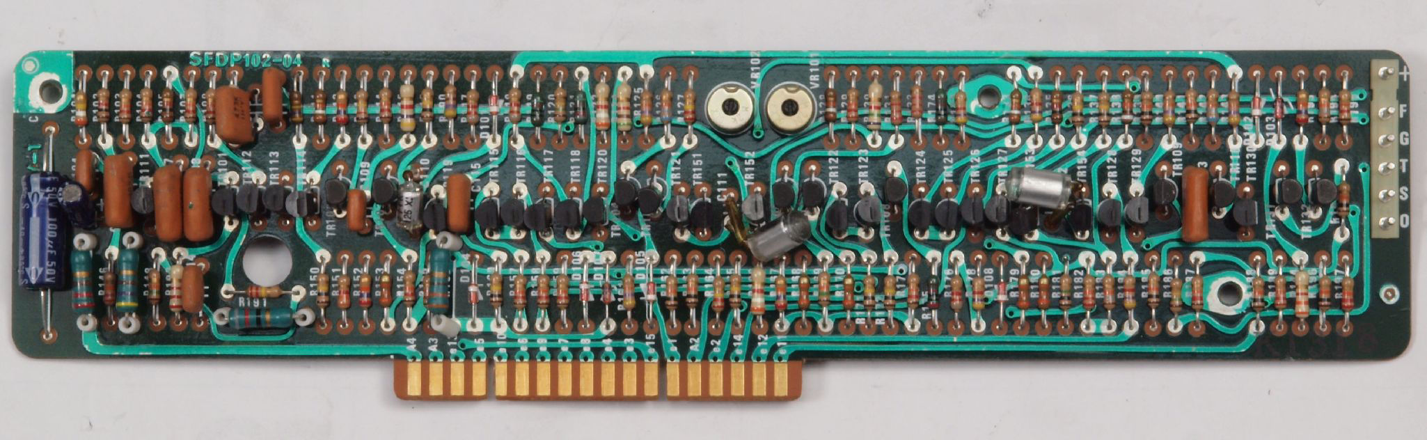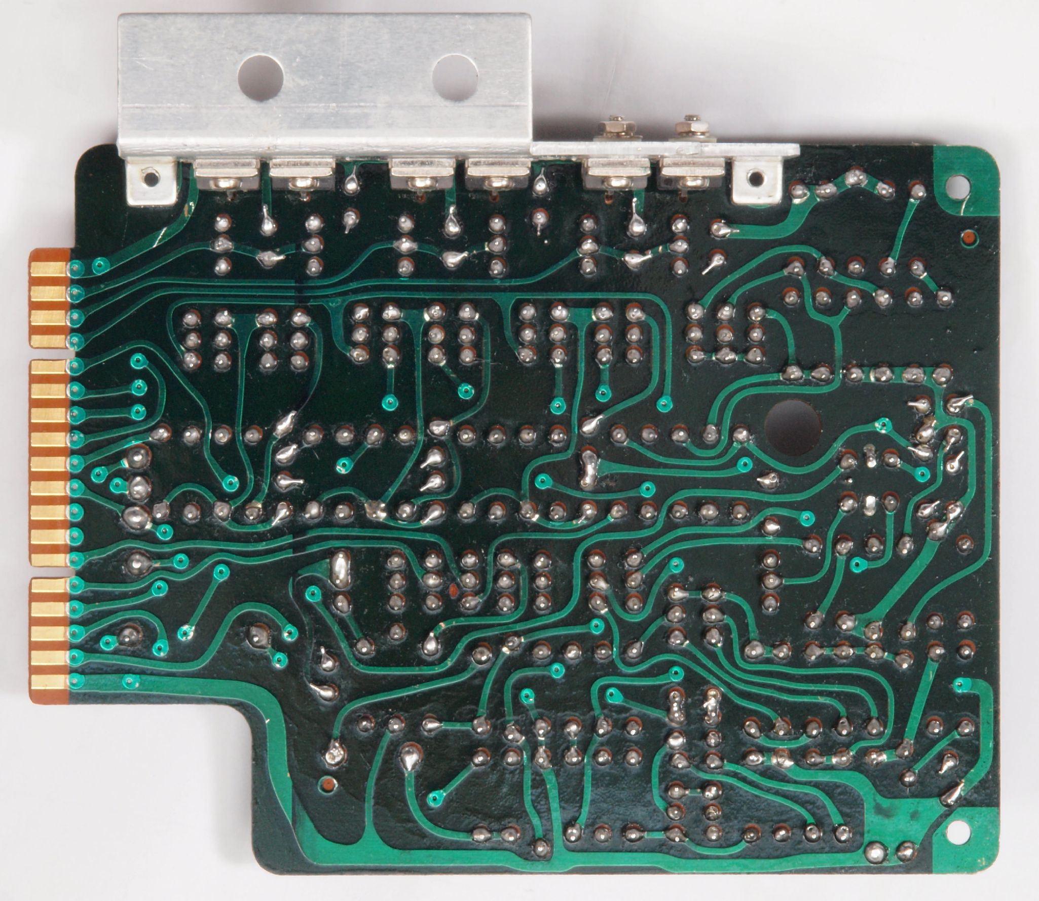 | C44. 完成基準発生・速度切替え分周基板。余分なフラックスを落として、コート液を塗る。前回の修理で割れた、角の固定穴を補強する。 | ||||||||||||||||||||||||||||||||||||