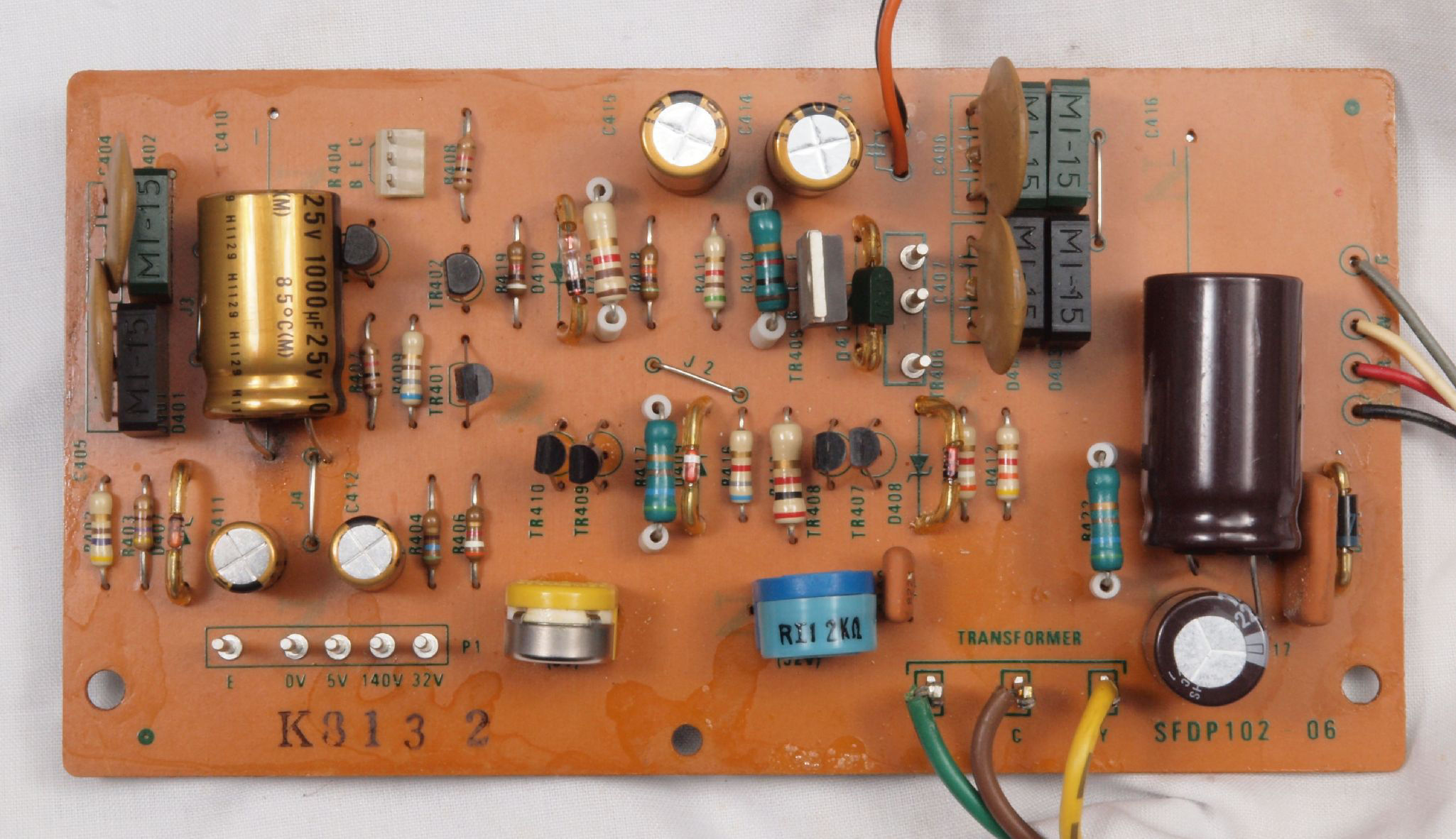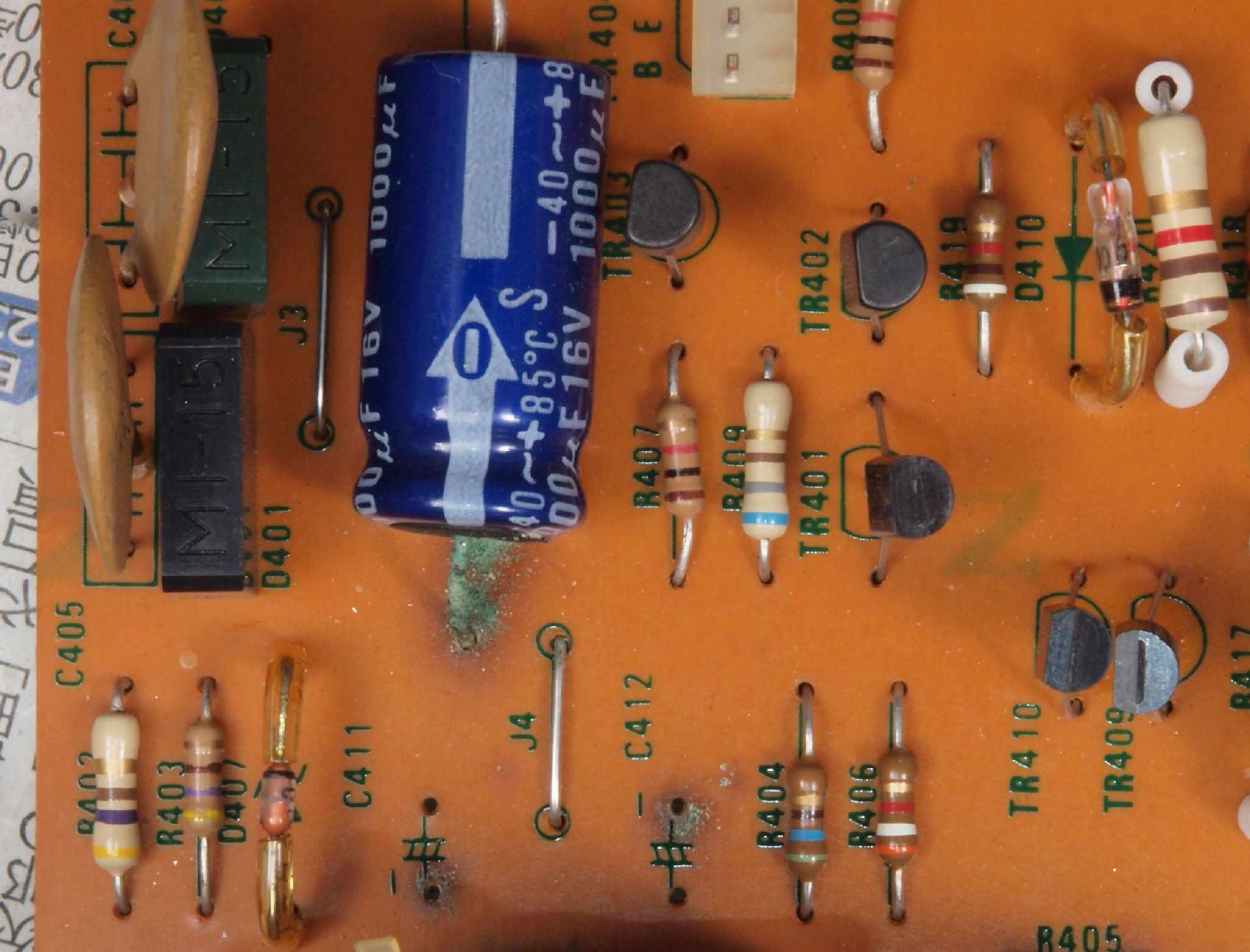 | C112. 修理前 電源定電圧基板、電解コンデンサーの液漏れ跡 | ||||||||||||||||||||||||||||||||||||