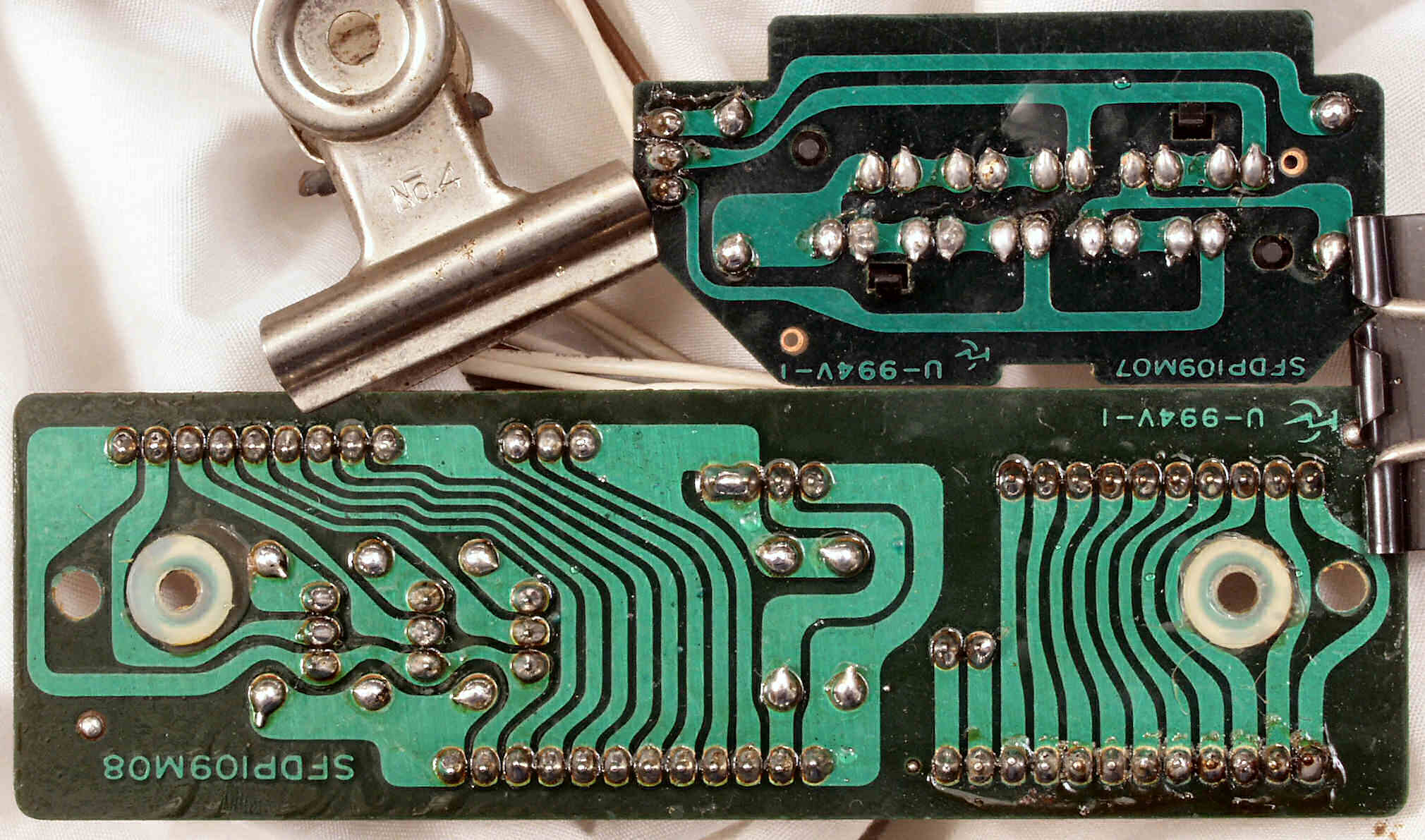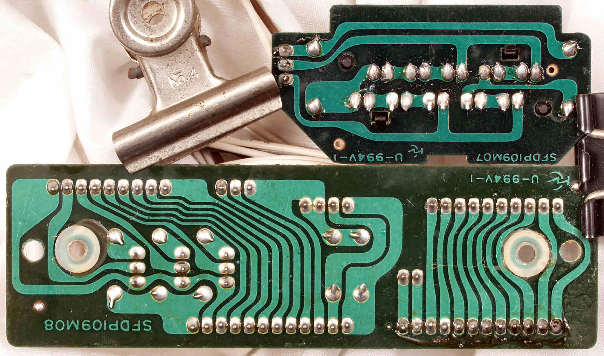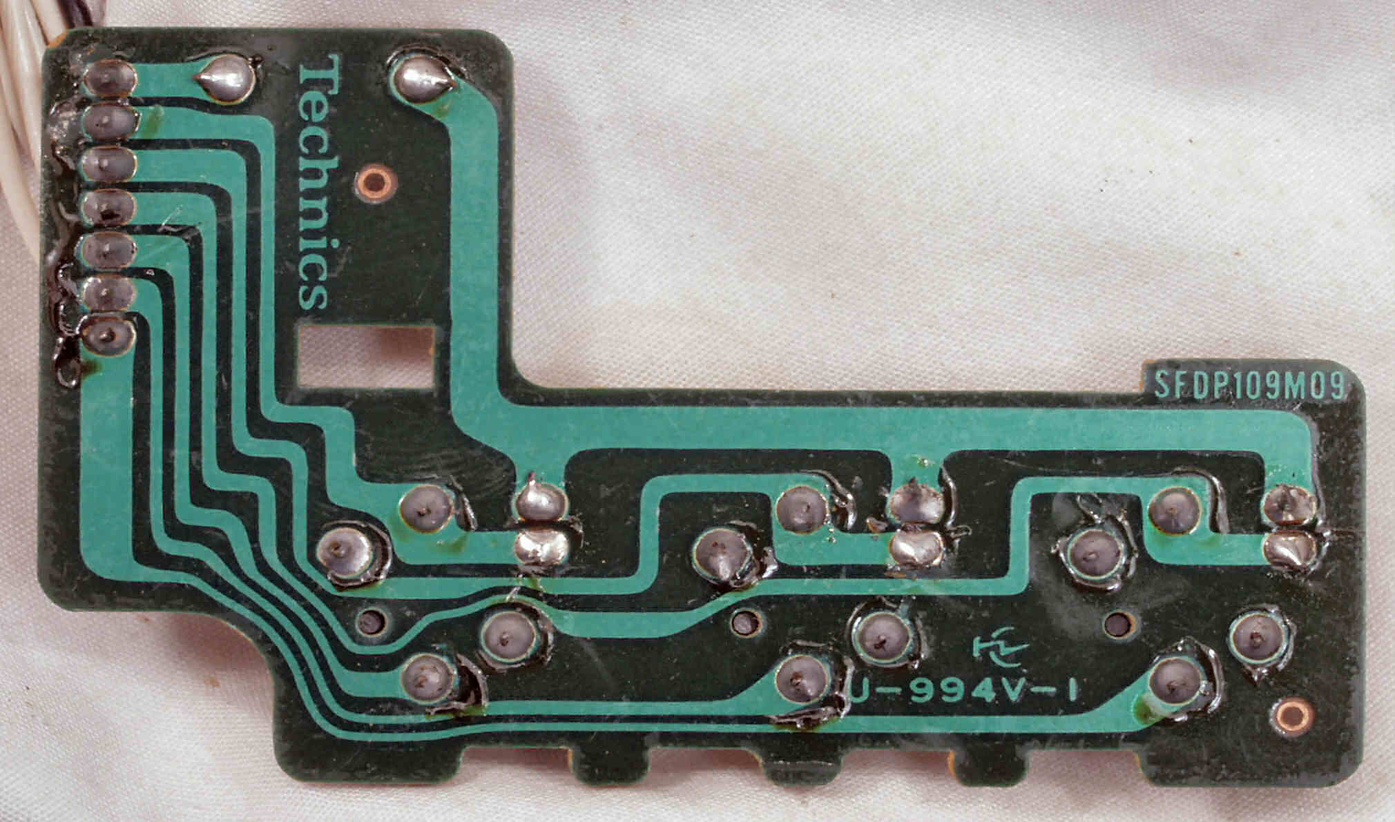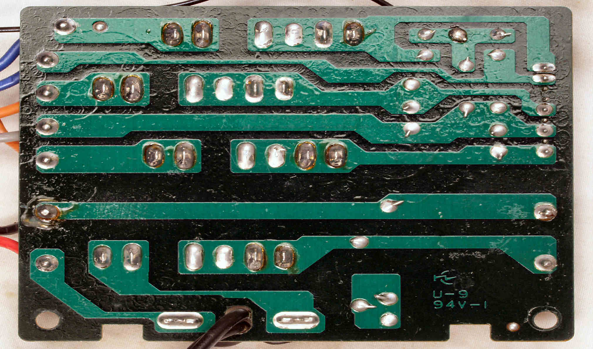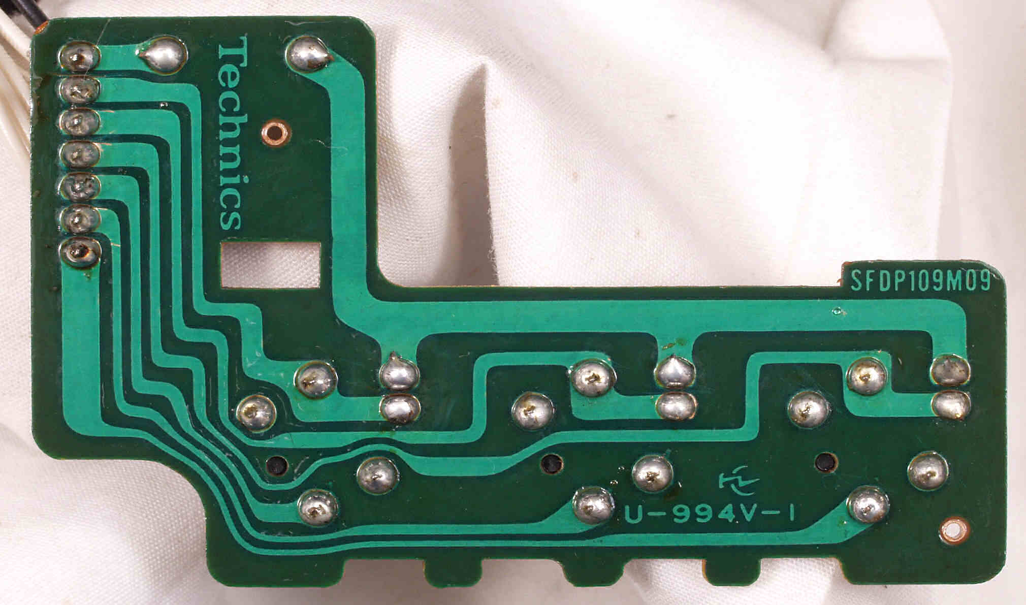 | C−9C. 完成ターンテーブル操作基板裏。余分なフラックスを落として、コート液を塗る。 | ||||||||||||||||||||||||||||||||||||||