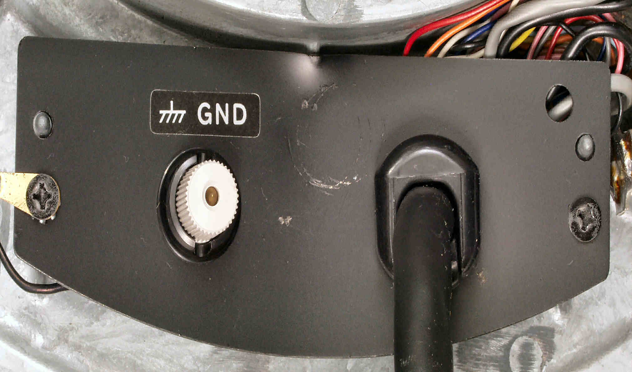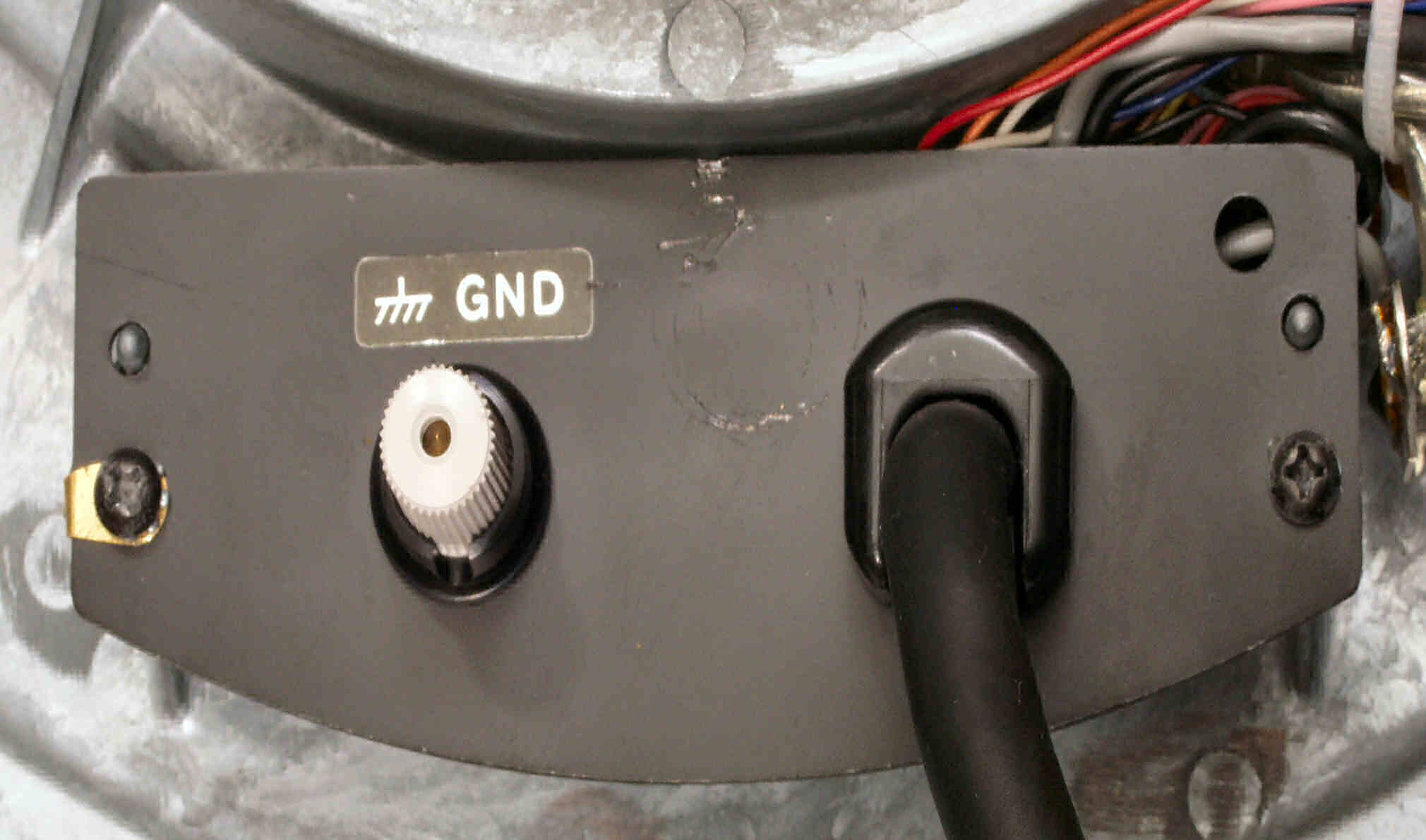 | C−8B. 修理後 本体を後ろから見る。 電源コードを取り、「3Pインレットソケット」を取り付ける。3Pインレットソケットは支給品。 汚れの除去を試みるが、ラッカー系の塗料か自己固着のプラスチック系なので、これ以上は塗装を犯すのでこれまで! |