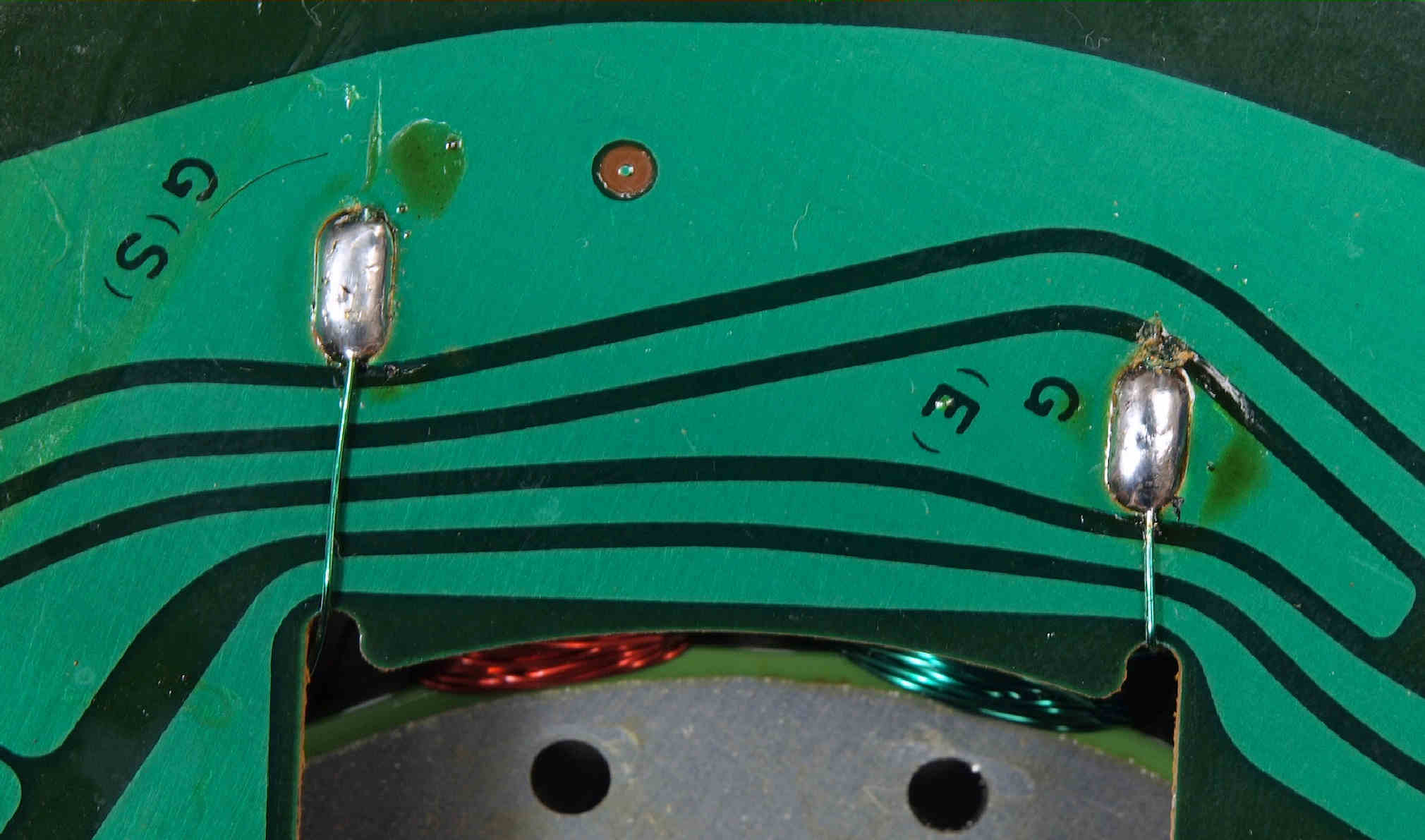 | M513. 修理中、 アマチュア(回転子)基盤裏巻線半田、引き出し線が絶縁していない!(GREEN巻線)拡大 | ||||||||||||||||||||||||||||||||||||||||