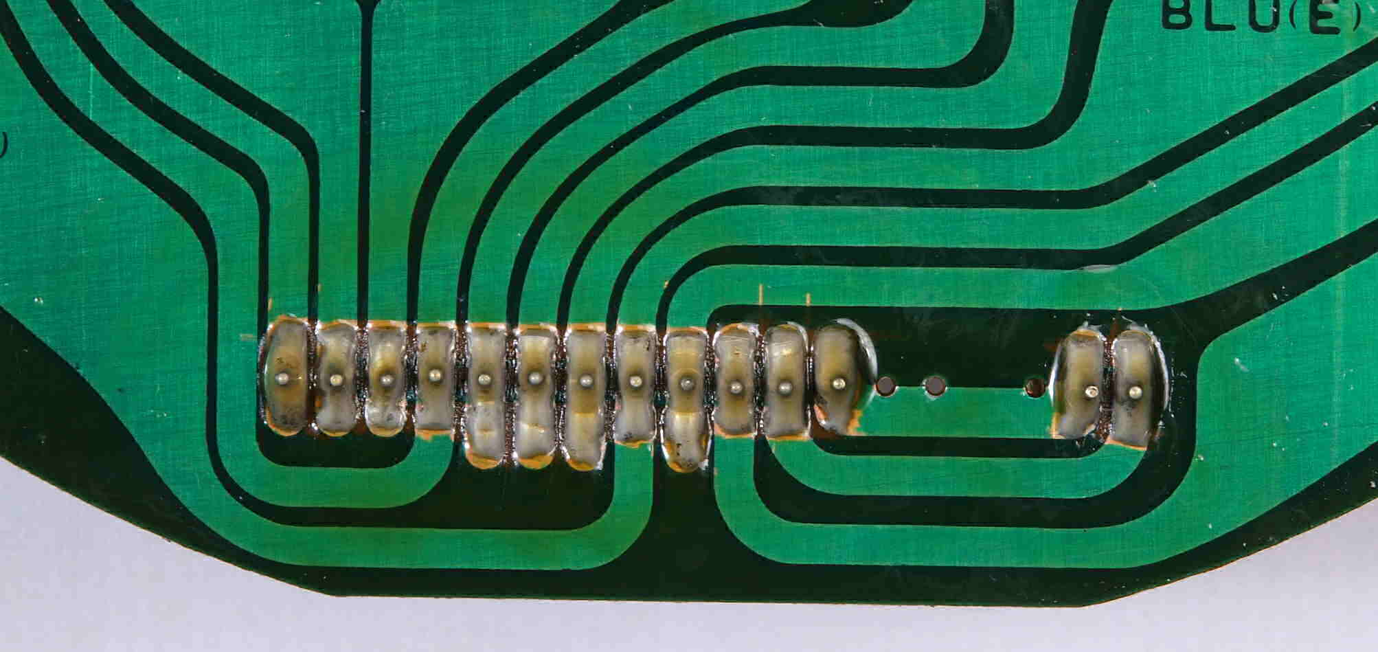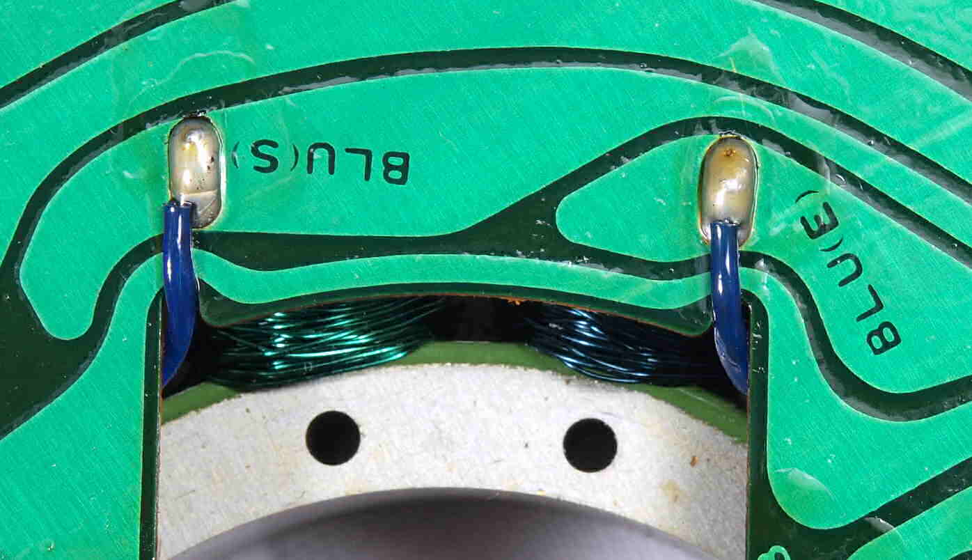 | M413. 修理中、 アマチュア(回転子)基盤裏巻線半田、引き出し線が絶縁していない!(BLUE巻線)拡大 | ||||||||||||||||||||||||||||||||||||||||