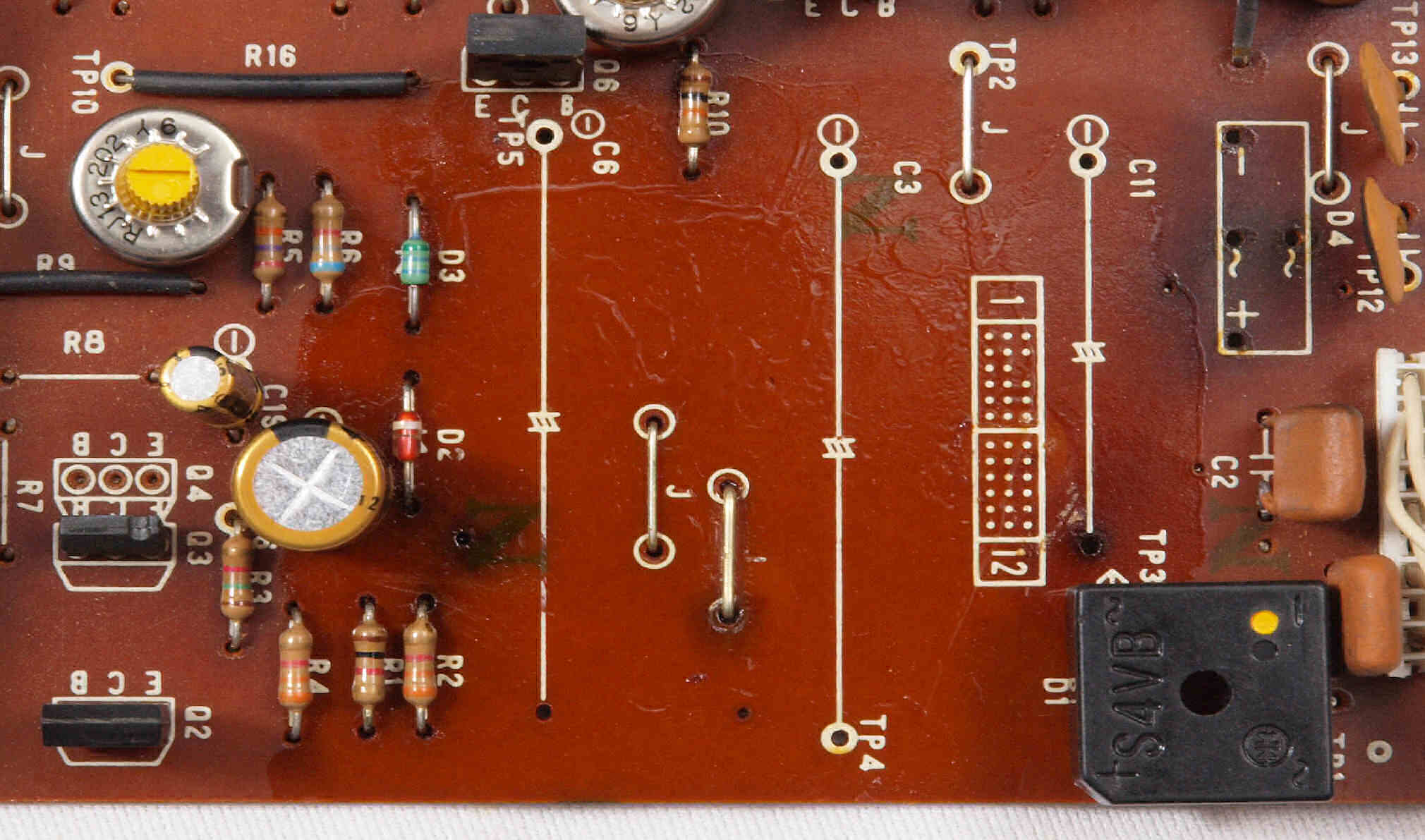 | C214. 修理中 定電圧回路基板、 電解コンデンサー固定用の接着材を取り除いた所。さらに腐食を防ぐ為、コート液を塗る。 | ||||||||||||||||||||||||||||||||||||||||