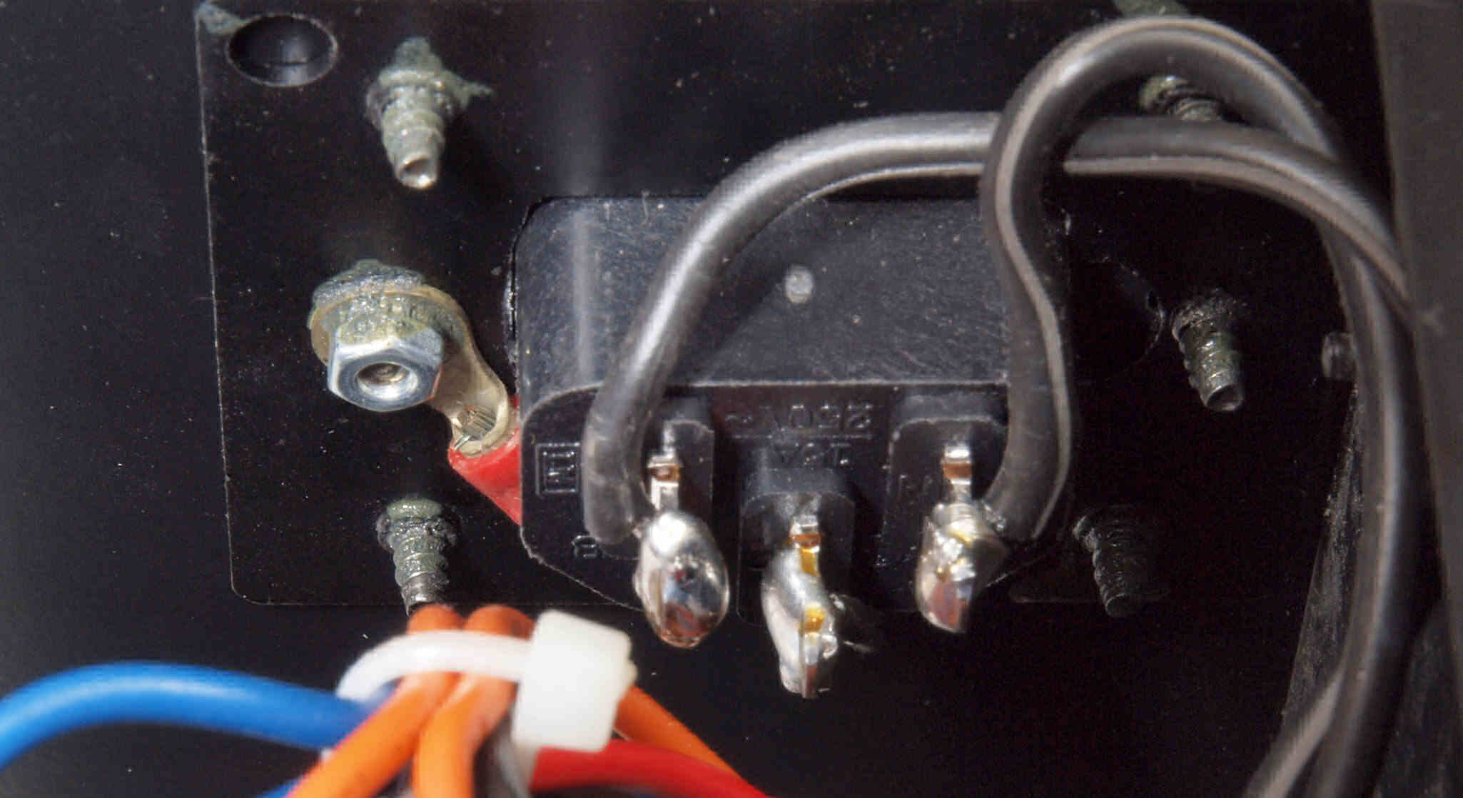 A64. 電源部点検中 後から見る。 電源コード取り付け部。