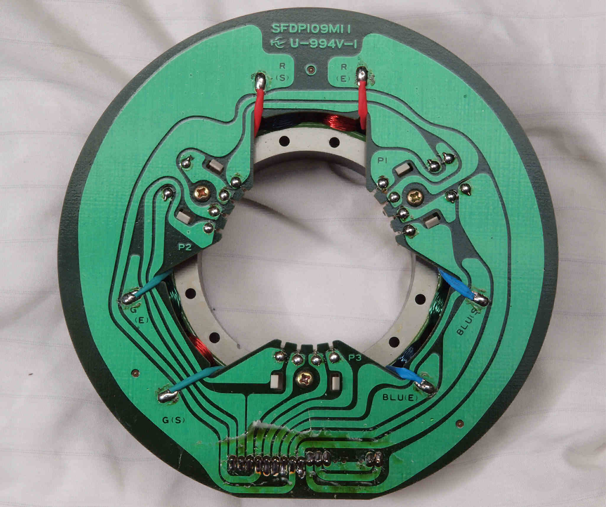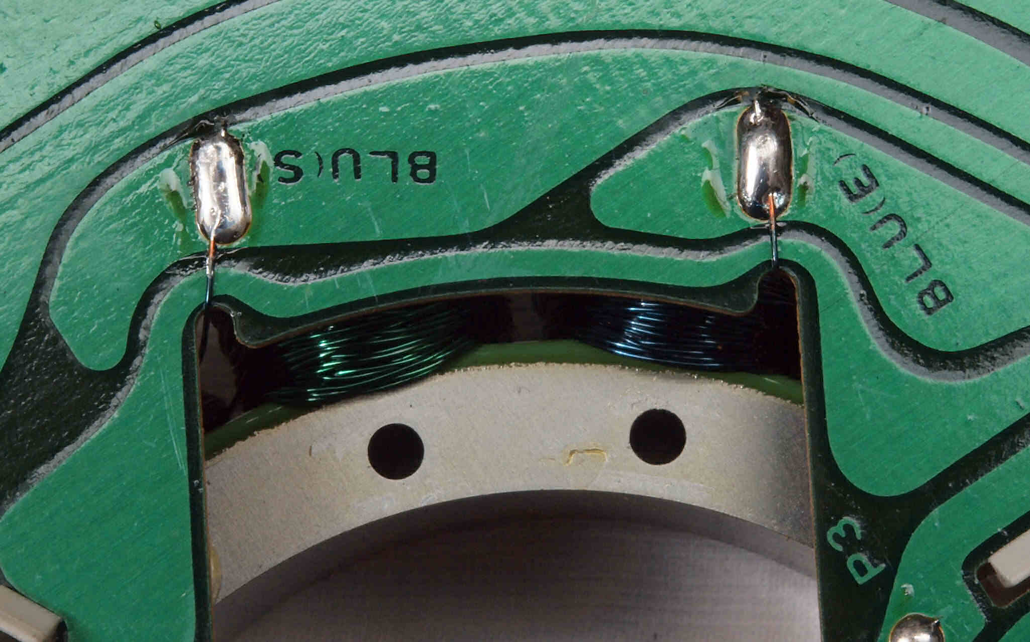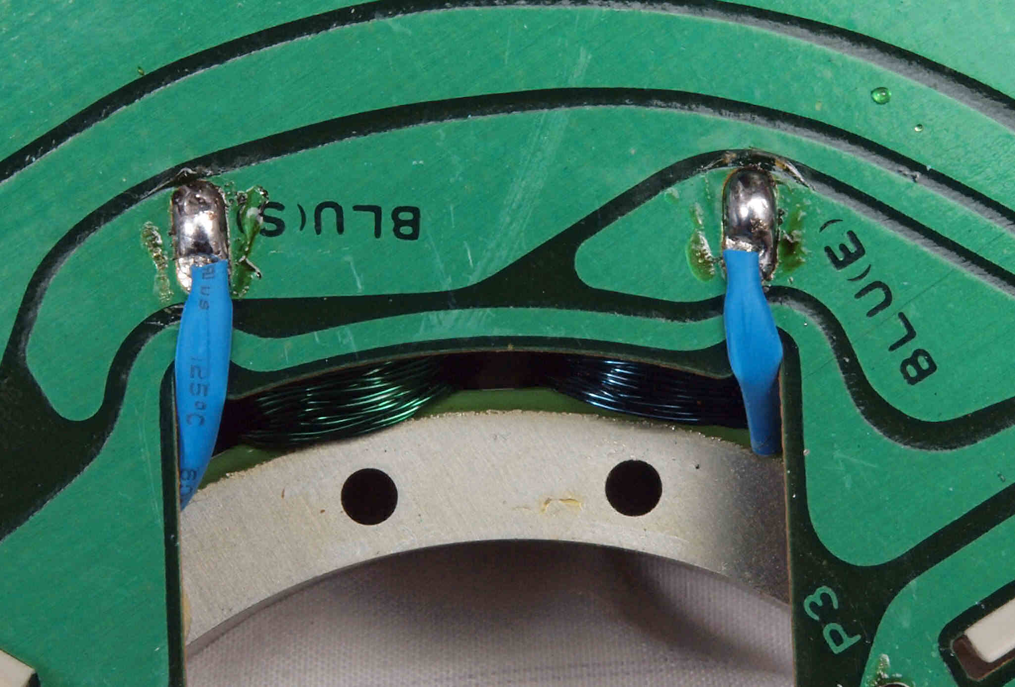 M41. 修理中、 アマチュア(回転子)基盤裏巻線半田、引き出し線が絶縁していない!(BLUE巻線)