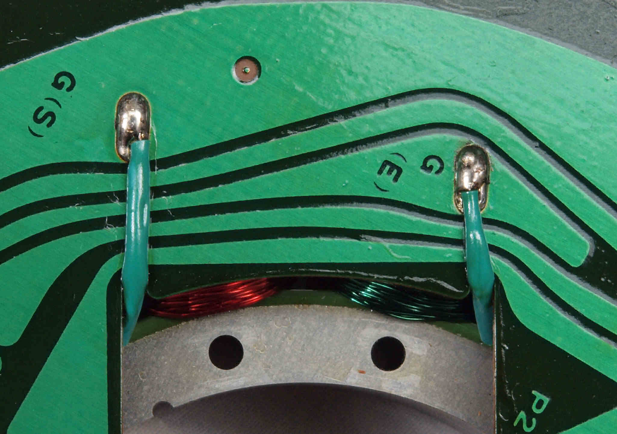 M51. 修理中、 アマチュア(回転子)基盤裏巻線半田、引き出し線が絶縁していない!(GREEN巻線)