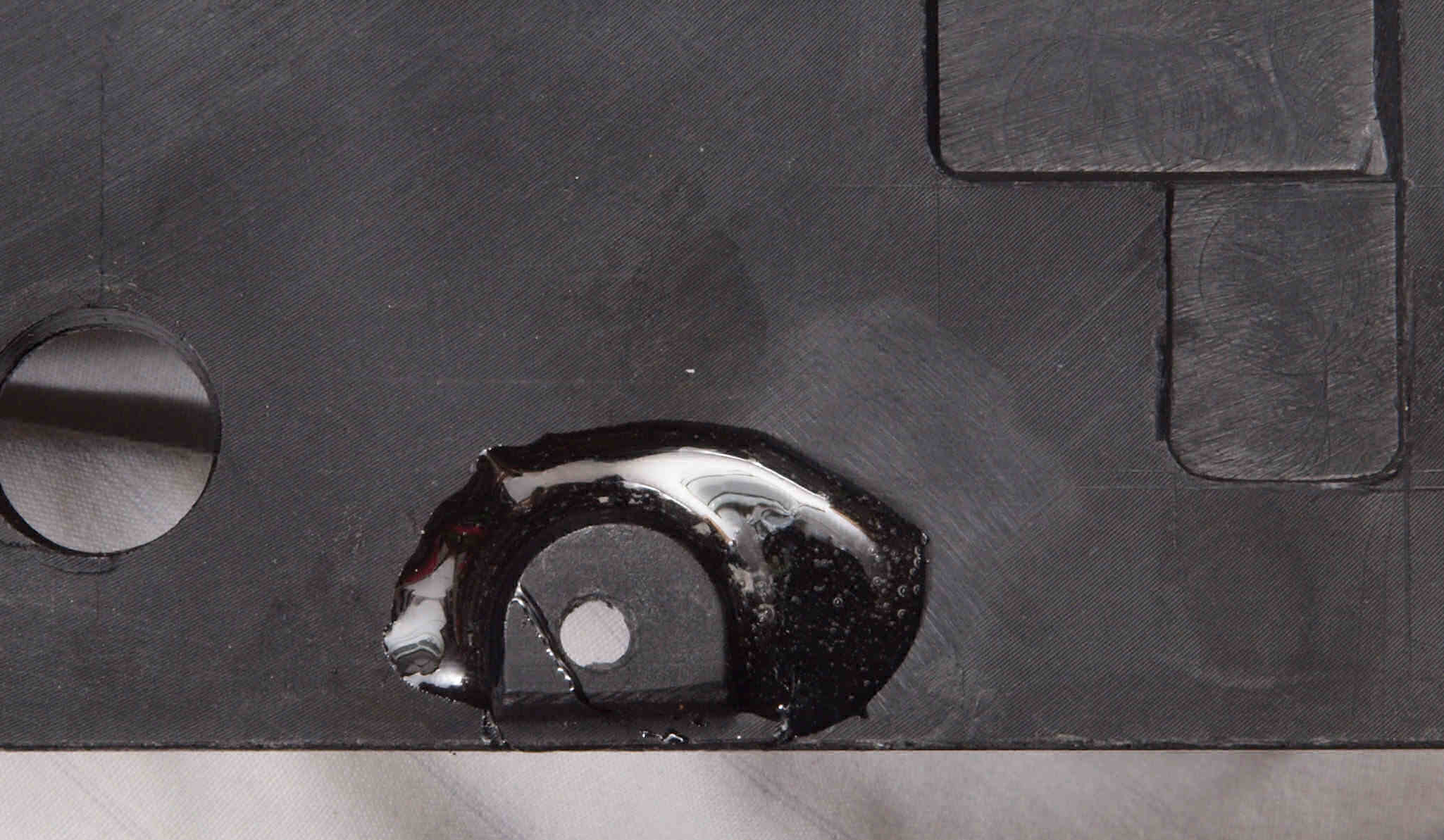 M83. 修理後 割れて取れた、下カバー取り付け穴。さらに2液性接着材で固定する。