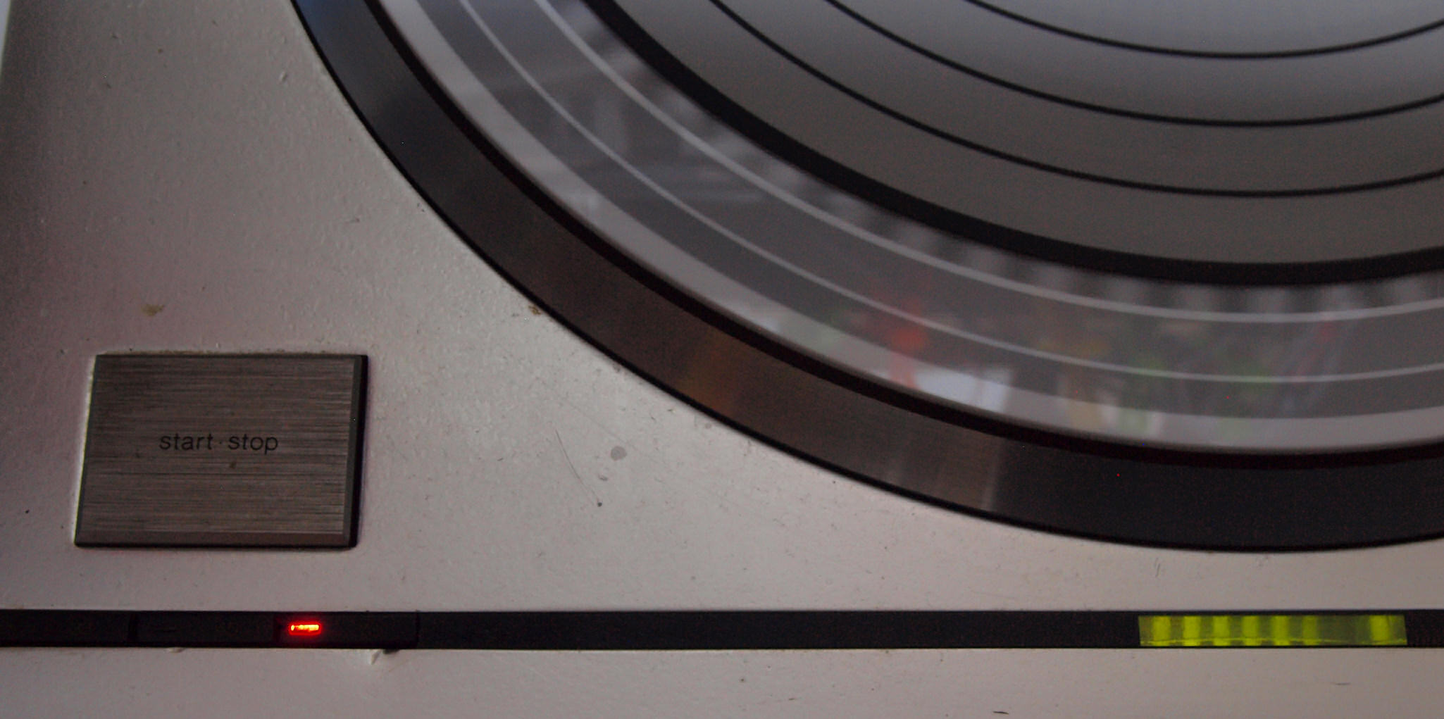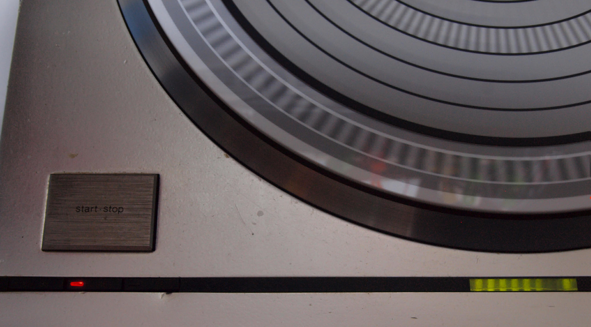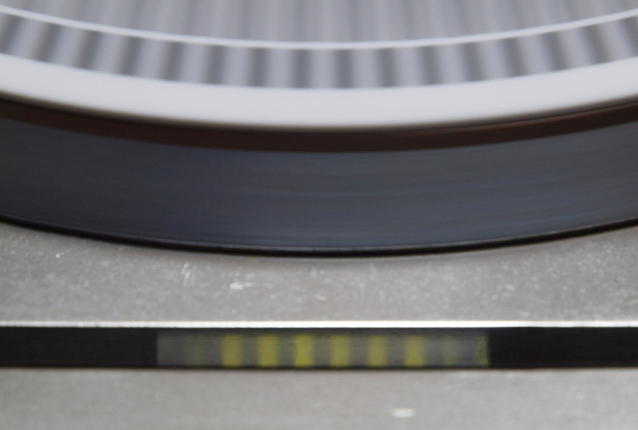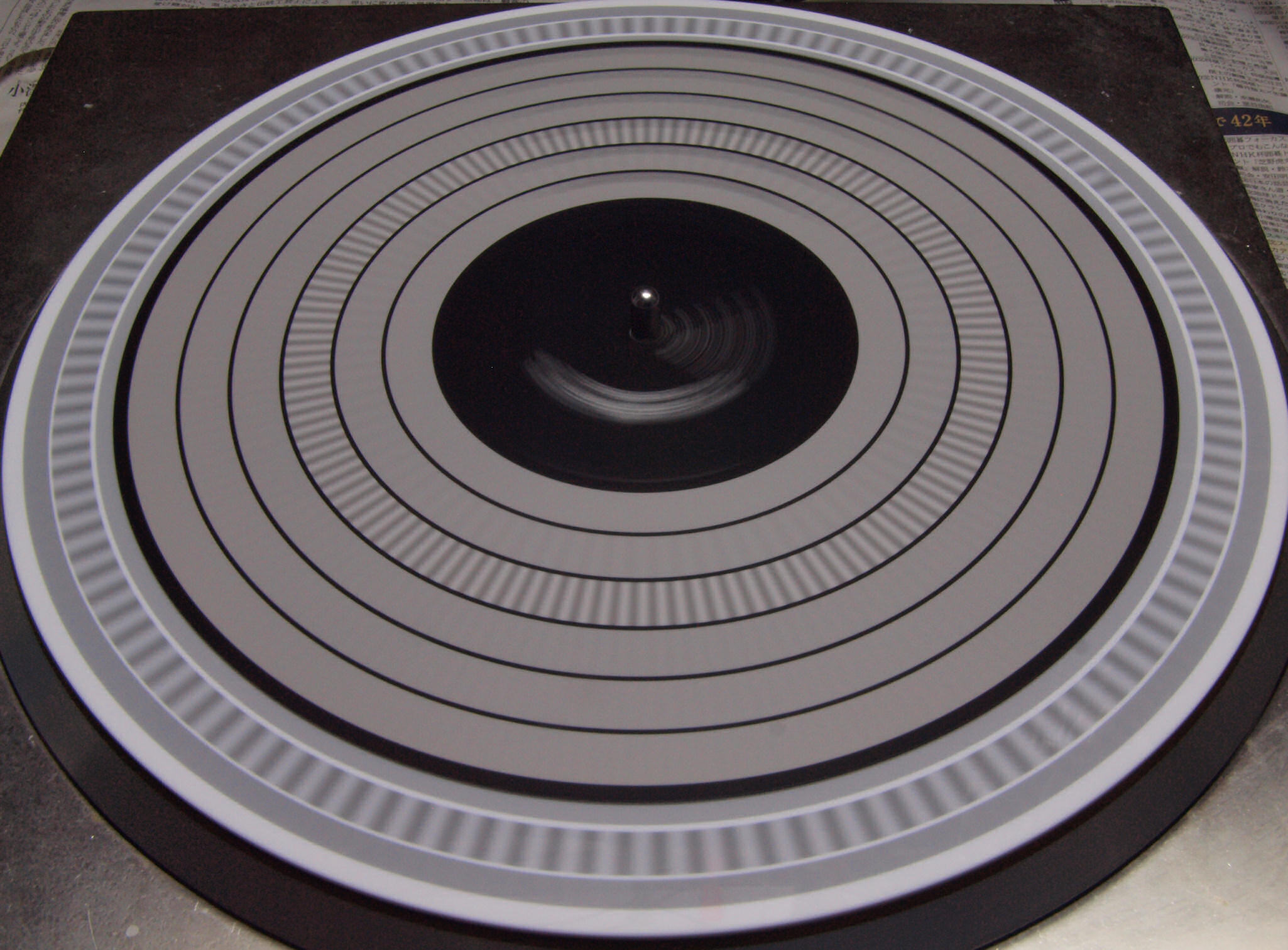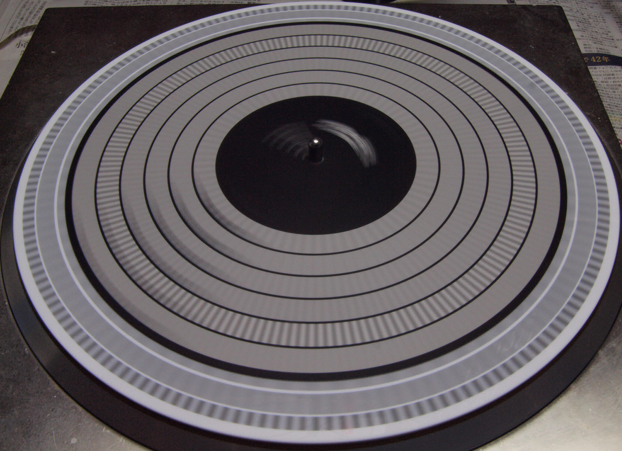 E42. 測定  45回転。 微調整+9.9%回転。ストロボに黒い所が見えるのはシャッターとストロボ周波数の干渉の為。
