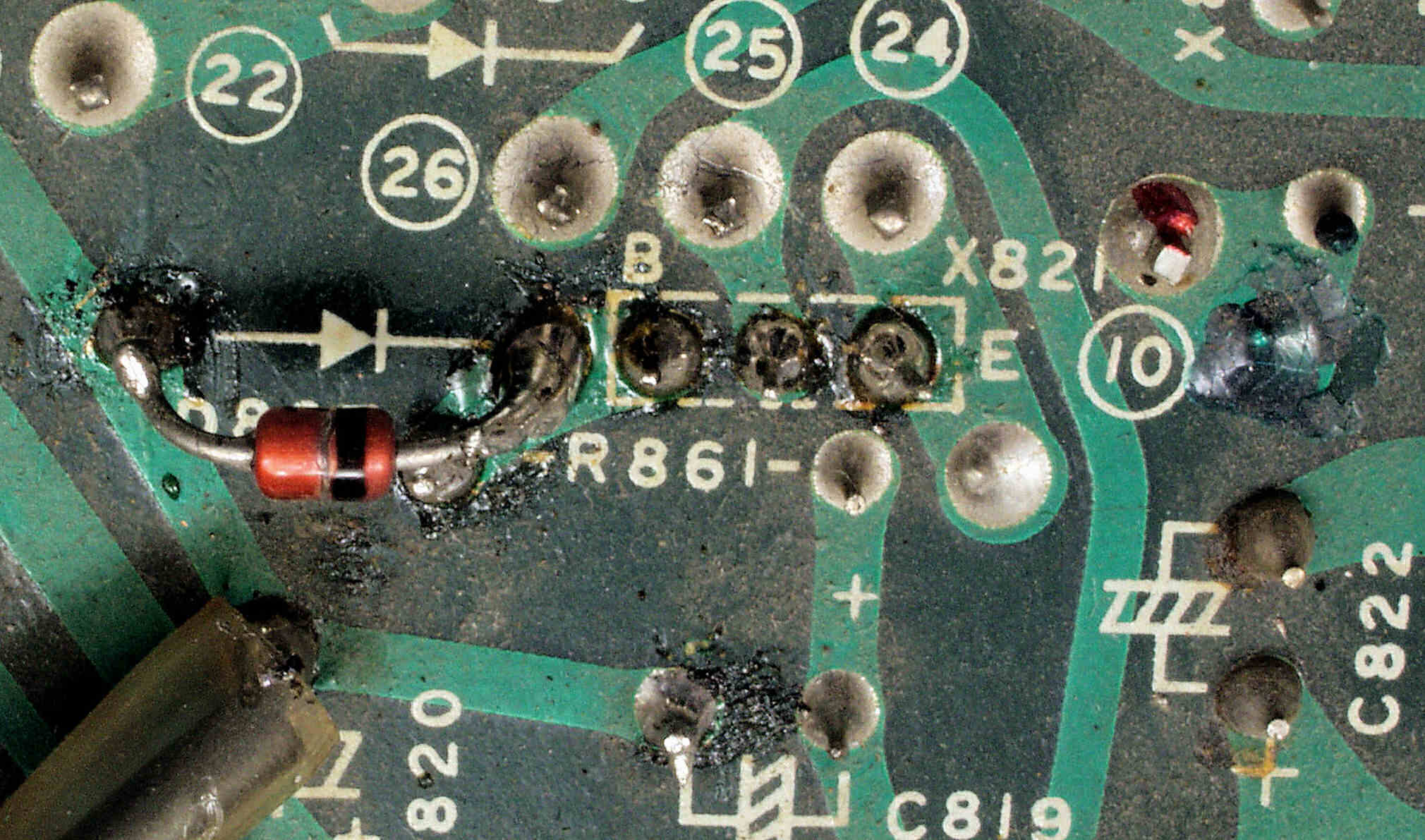 | C112. 修理前 基板電解コンデンサー固定接着材、トルエンが使用してあり、銅線を犯すので、取り去る。 | ||||||||||||||||||||||||||||