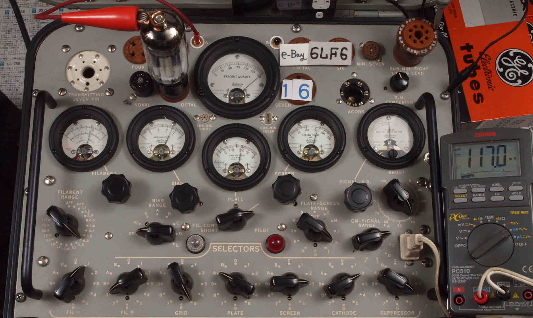 | V16. 6本目 6LF6 。 Gm測定=6200μmho、 Ip=87.2mA。 測定条件、「Ep=Esg=160V、Eg1=−35V」、Bレンジ=15000μmhoでの測定。 |