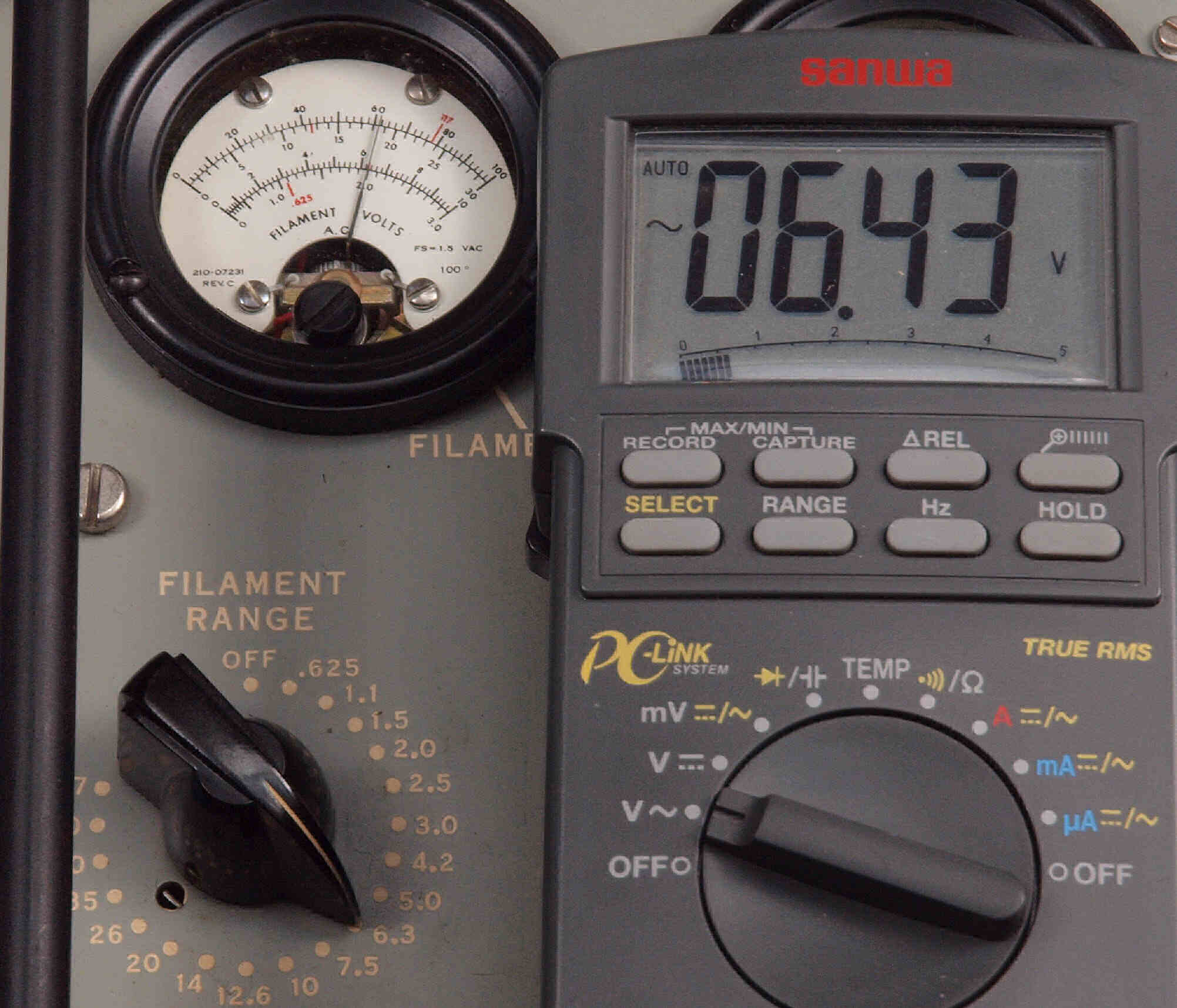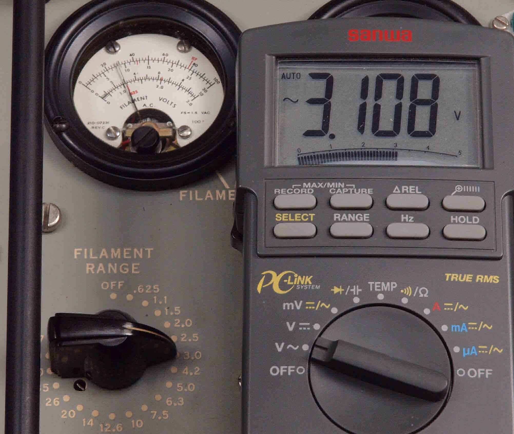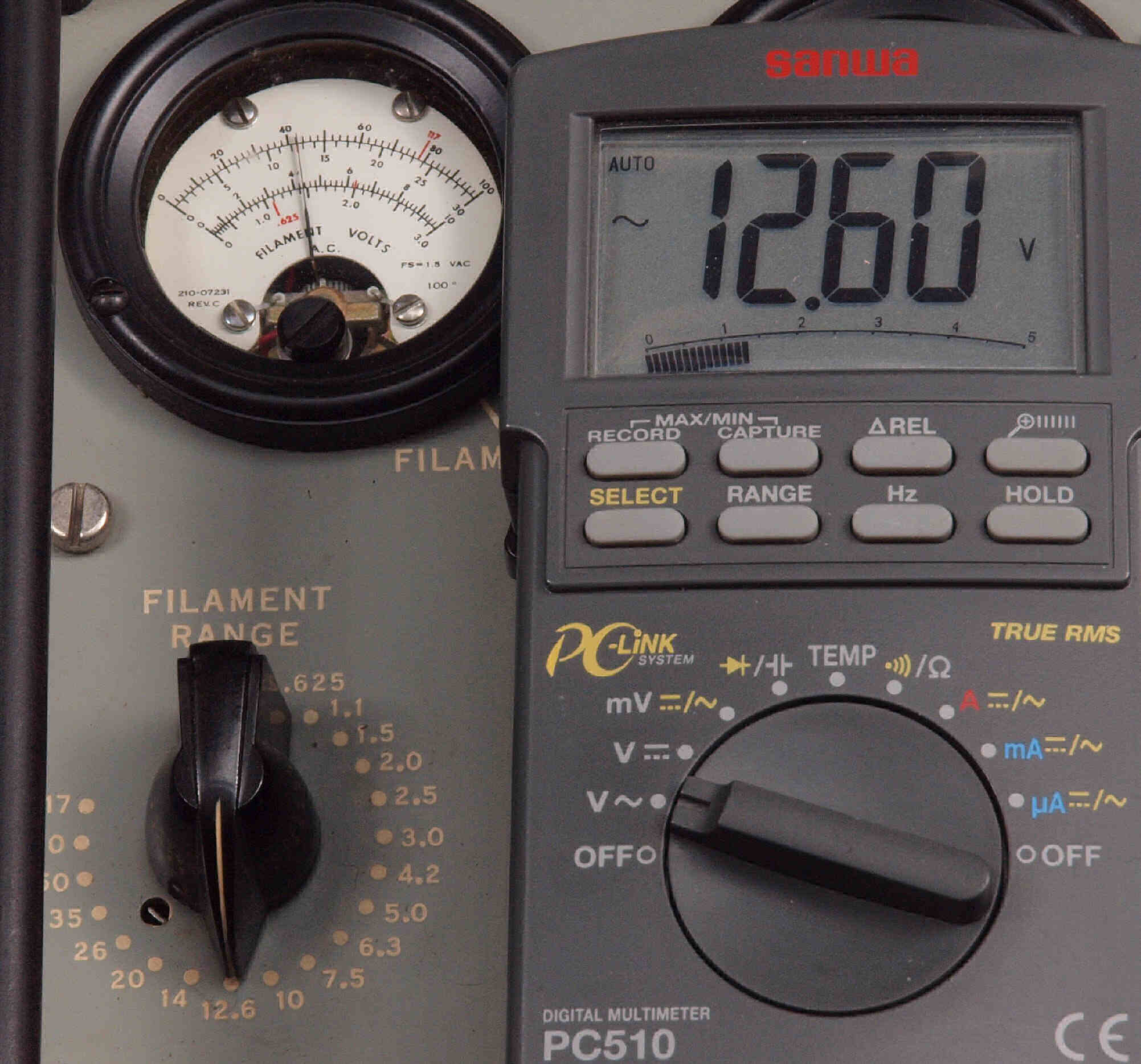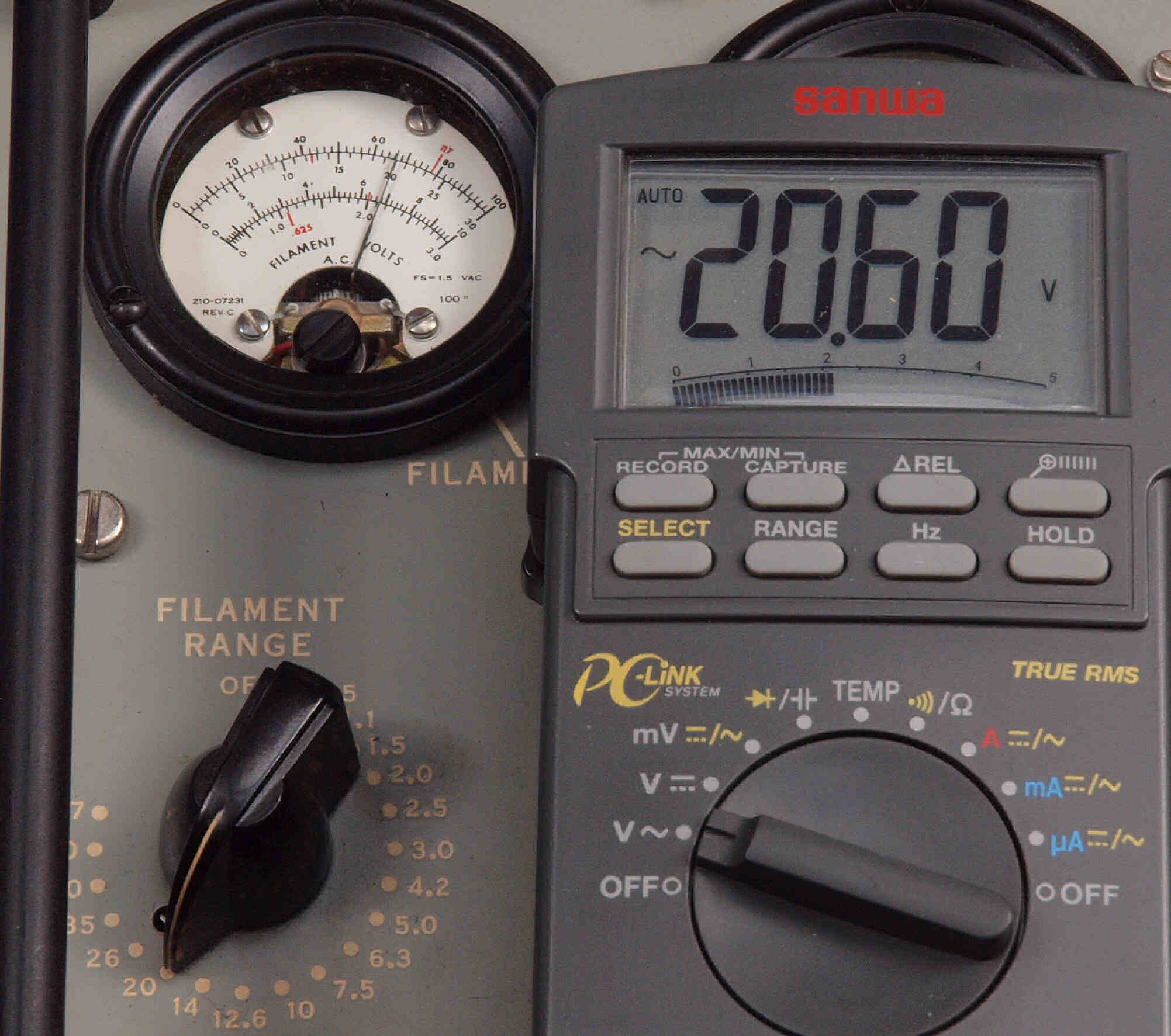 | 「整流管83」、「整流管5Y3GT」をダイオードに単純に交換すると、電源が強化する事になり、相互コンダクタンスの測定には信頼性(精度)が増すことになります。 しかし、チャートのAver.Mut.Cond.とは誤差がでます。又、他の試験方法にも誤差がでます。よって、回路の変更、全体的な調整・校正が必要となります。 | |||||||||||||||||||||||||||||||||