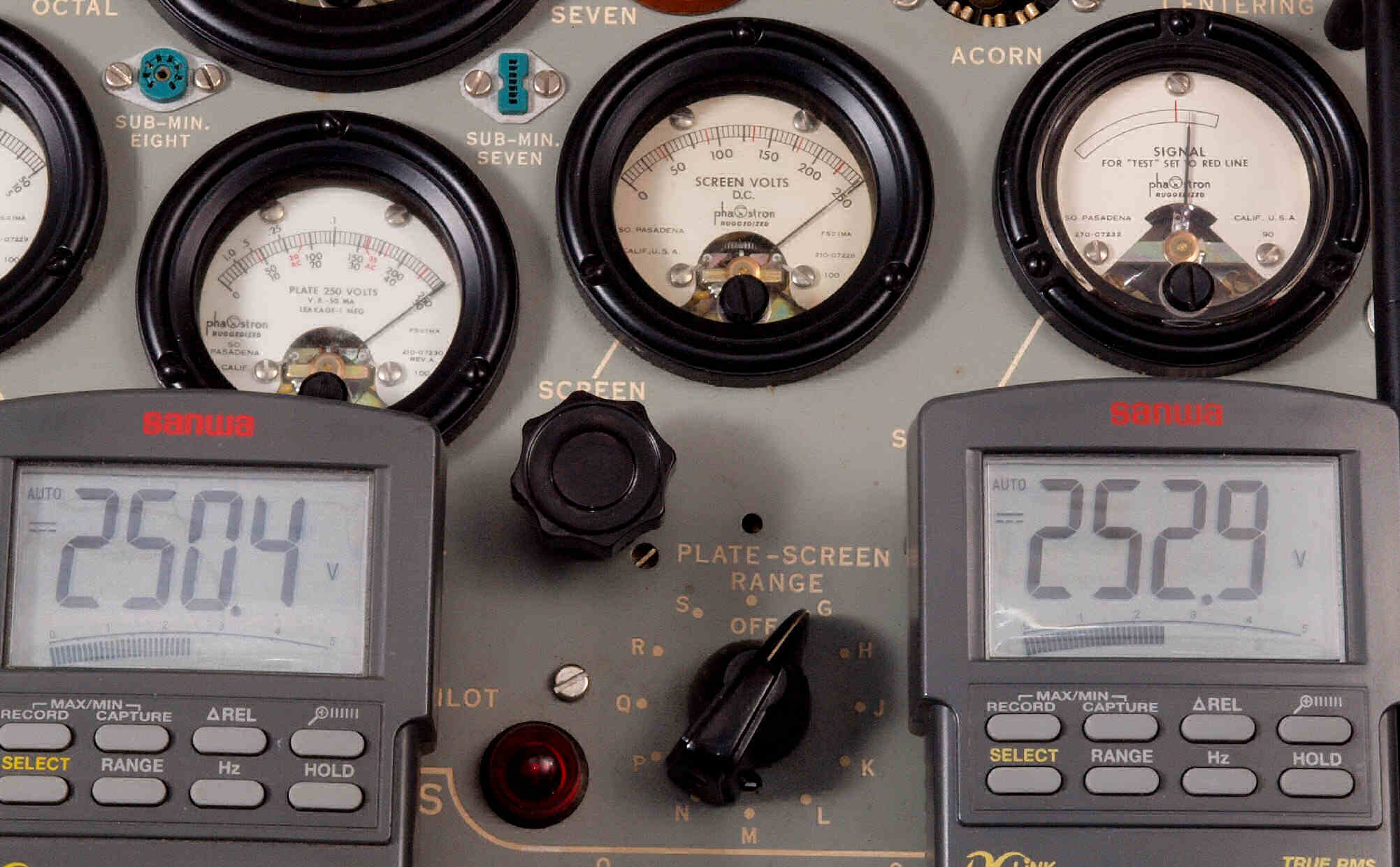 | J31. ブリッジを測定する、Gm−Calibration−Test。 Gm−SignalRangeSW=C、 Gm−CalibrationShuntVR=87.5=3,000μmho−FullScale(20倍読)。 上のテスター=ブリッジ電圧=37.5mV、下のテスター=Ip=76.9/50=1.54mA |