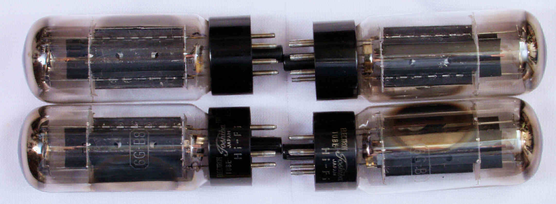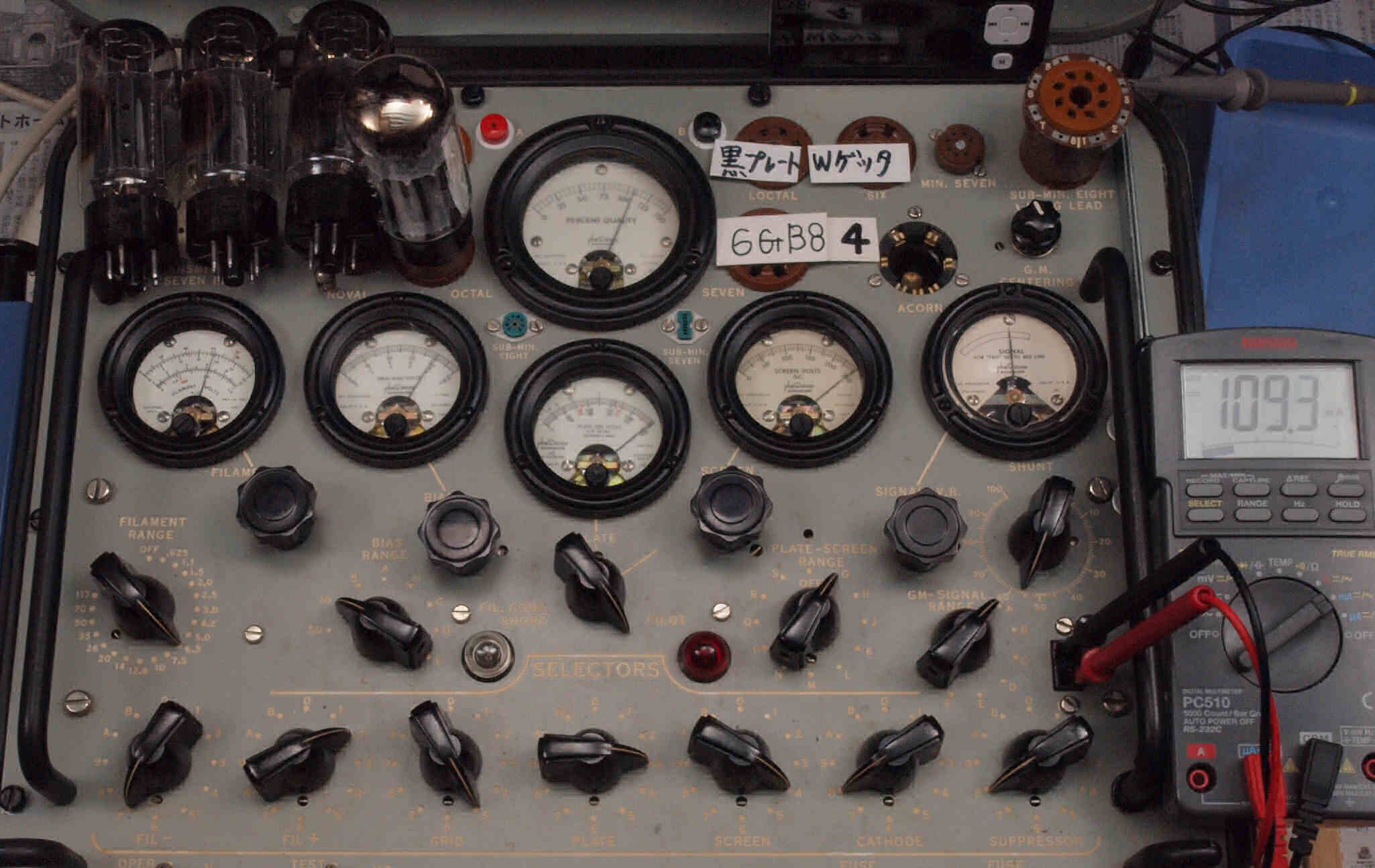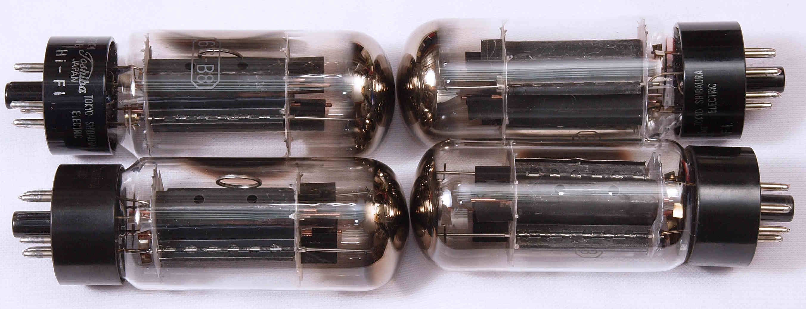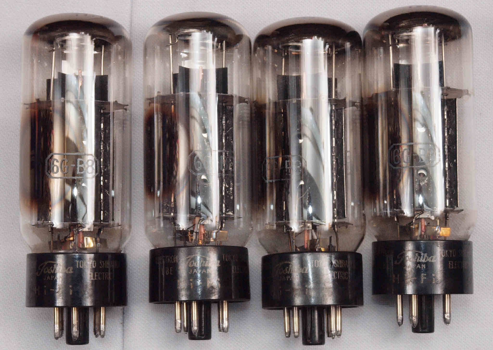 | 左から 1本目 6G-B8 測定。 Gm=20000μmho、Ip=97.6mA。 2本目 6G-B8 測定。 Gm=20000μmho、Ip=98.2mA。 3本目 6G-B8 測定。 Gm=21000μmho、Ip=102.7mA。 4本目 6G-B8 測定。 Gm=19000μmho、Ip=99.2mA。 |